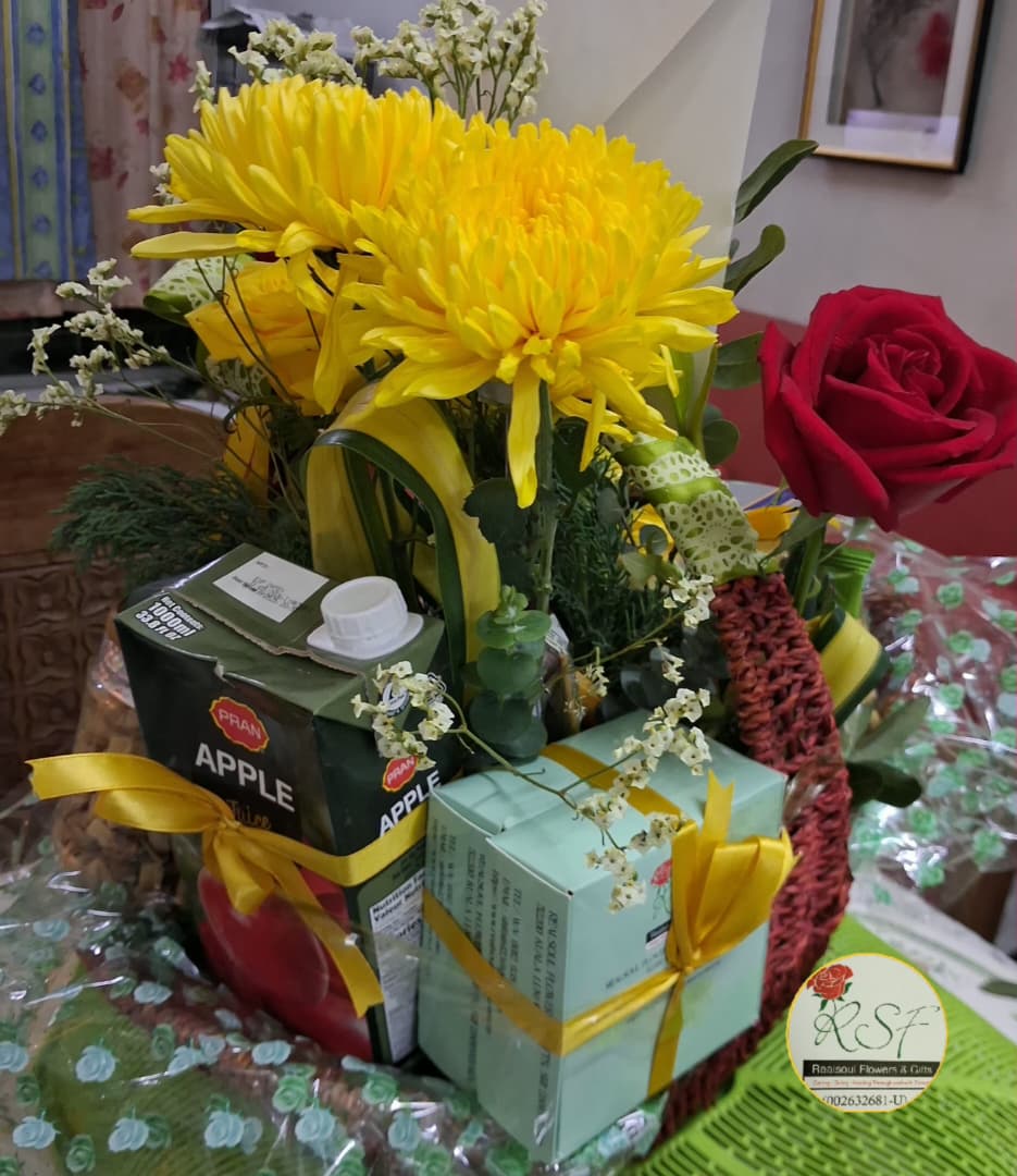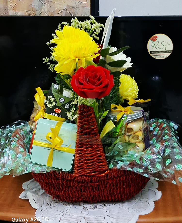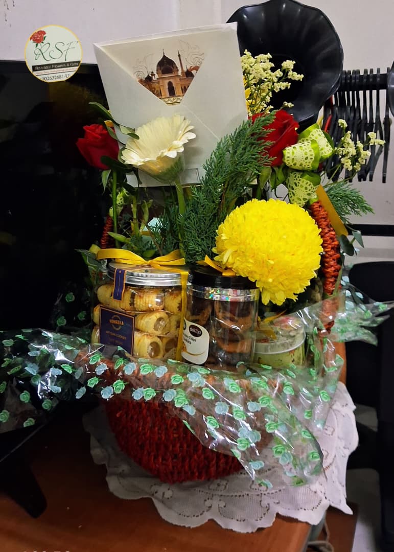 HADIAH RAMADAHAN RAYA DALAM BENTUK BAKUL BUNGA SEGAR DENGAN JUADAH MAKANAN MINUMAN UNTUK MERAIKAN SUASANA BAGI YANG MENERIMANYA. IA DIREKA DENGAN SENTUHAN EKSLUSIF.