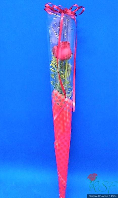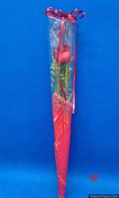 Valentine Day Ideas:Single rose, fillers, foliage and wrapped; card is included.