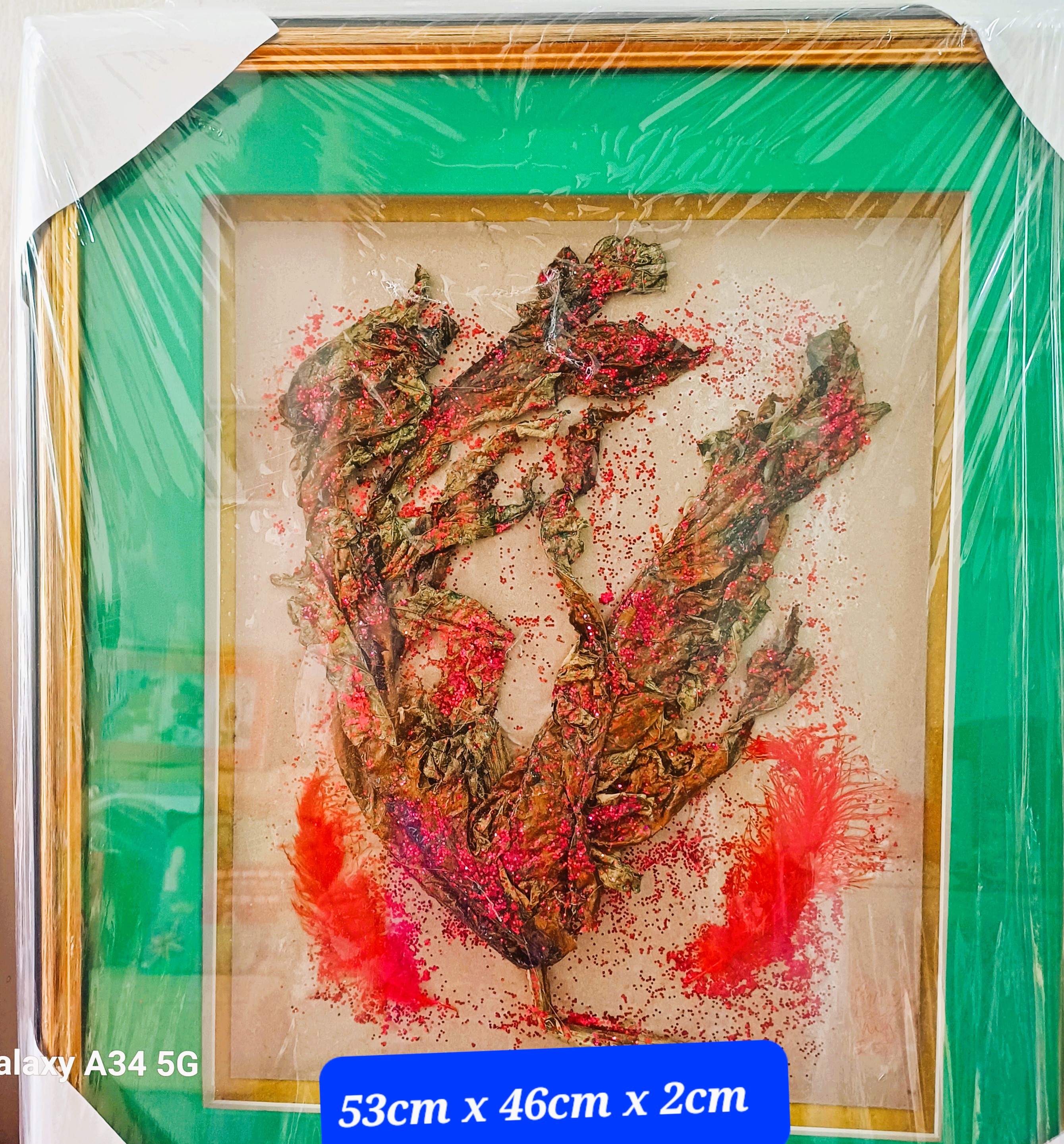 THIS ART WORK USES SEMI FRESH PAPAYA LEAF, WASHED, CLEANED, DRIED, PRESSED AND RED COLOURED BIRD FEATHERS AND RED GLITTERS AND ARRANGED AS SUCH.