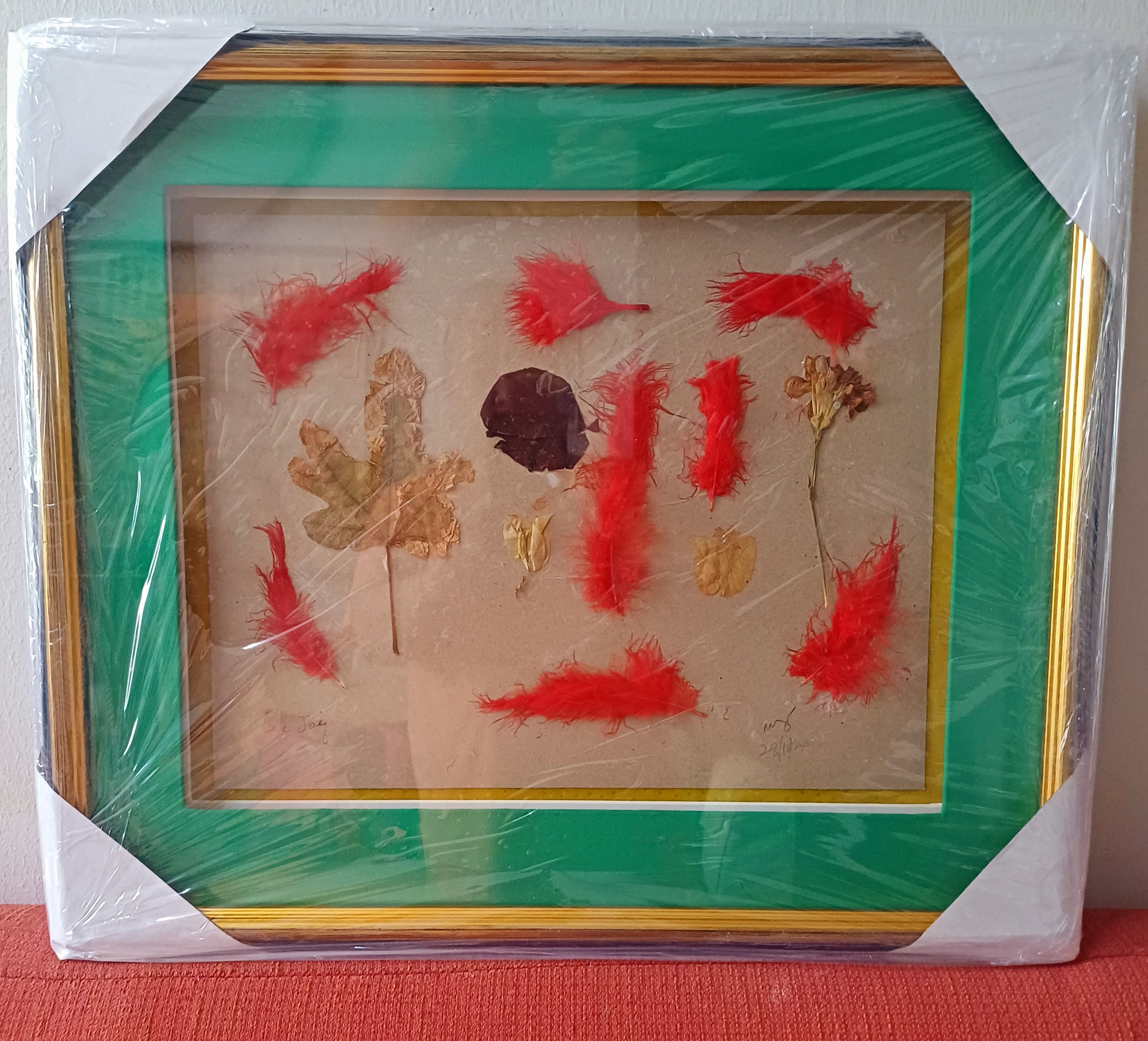 THE ART PIECE TITLED "SOFT ANGEL EYES" CONSISTS OF REAL DRIED PRESERVED PRESSED LEAVES, DRIED PETALS, DRIED PRESSED FLOWERS AND RED COLOURED BIRD FEATHERS. IT MEASURES 57CM X 46CM X 3.8 CM THICKNESS. RM410 INCLUDING COURIER CHARGES TO PENINSULA MALAYSIA