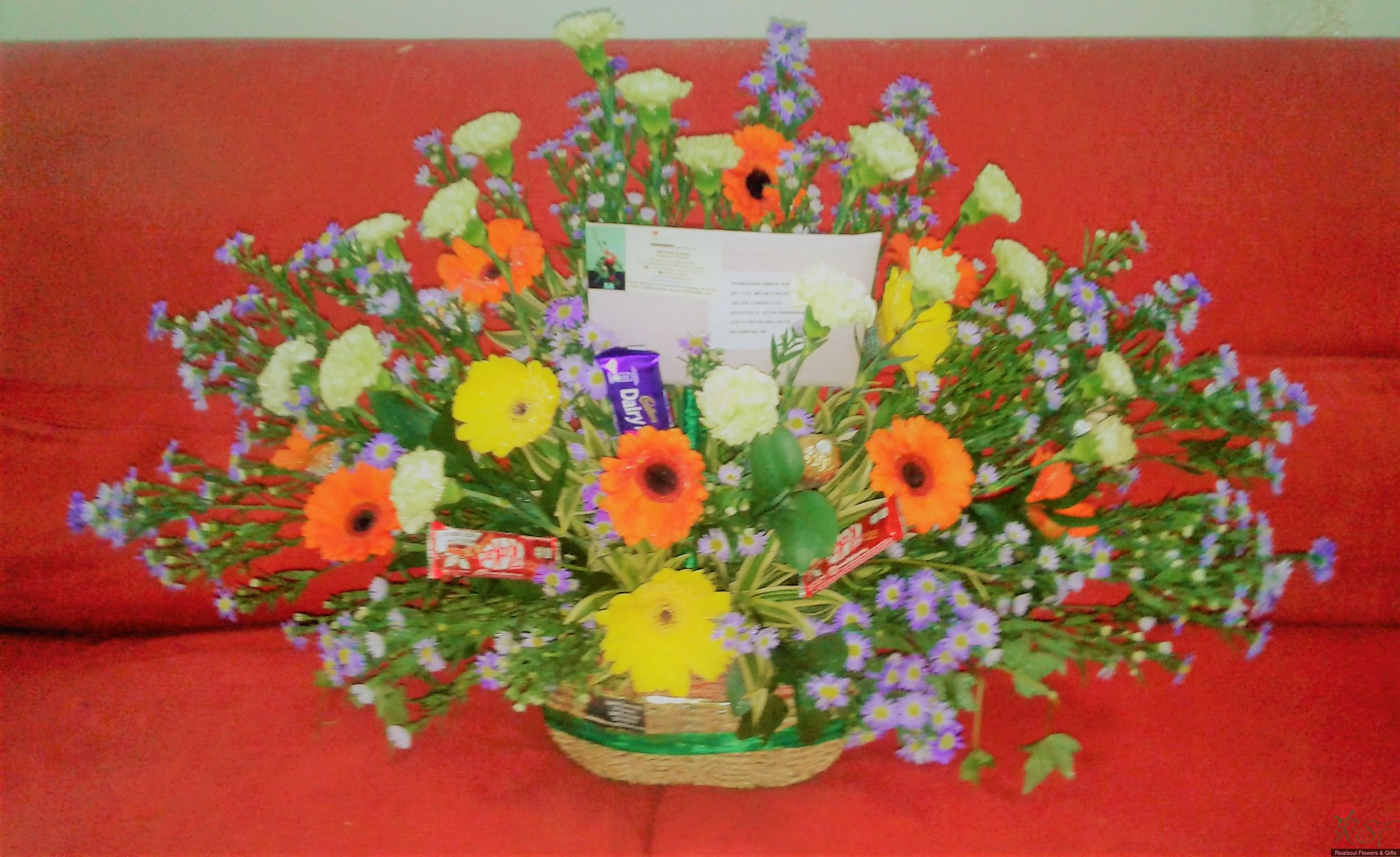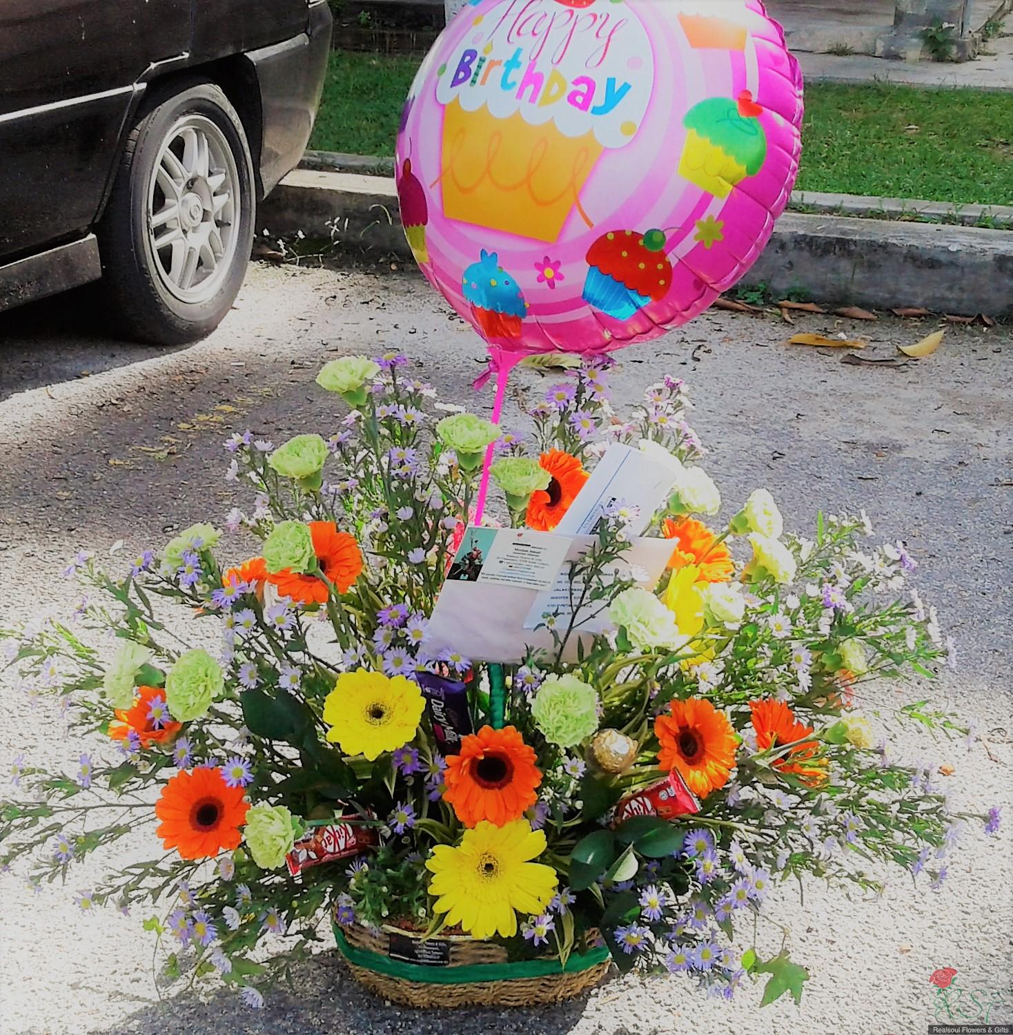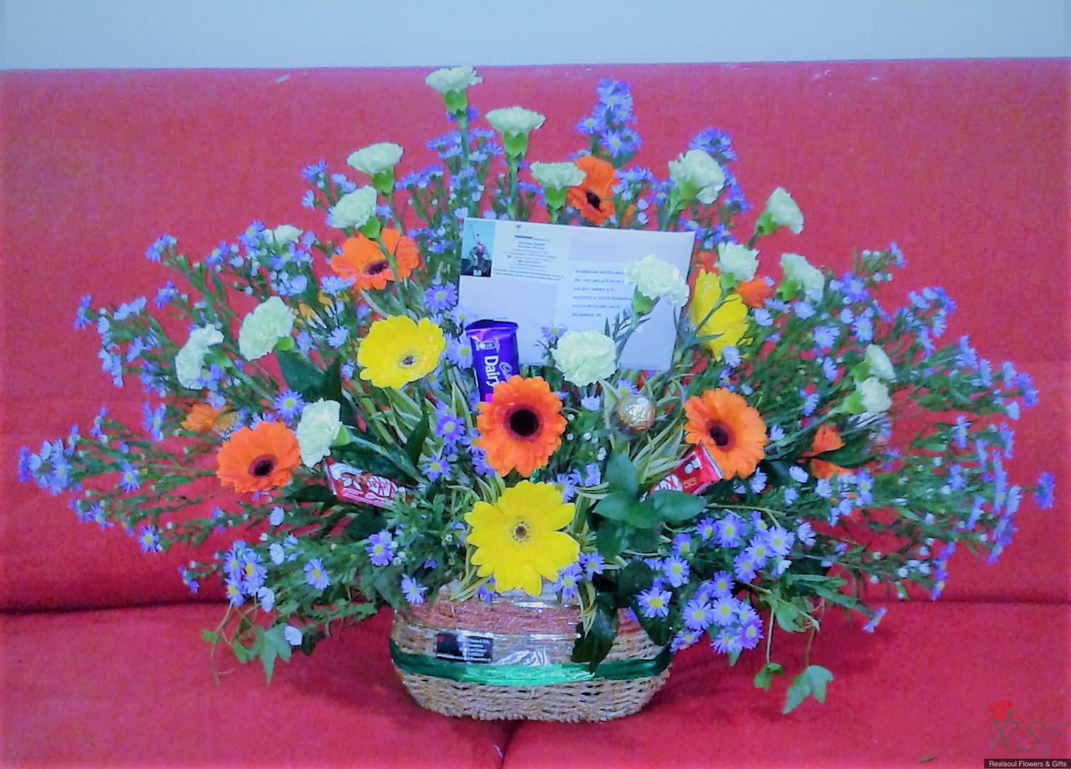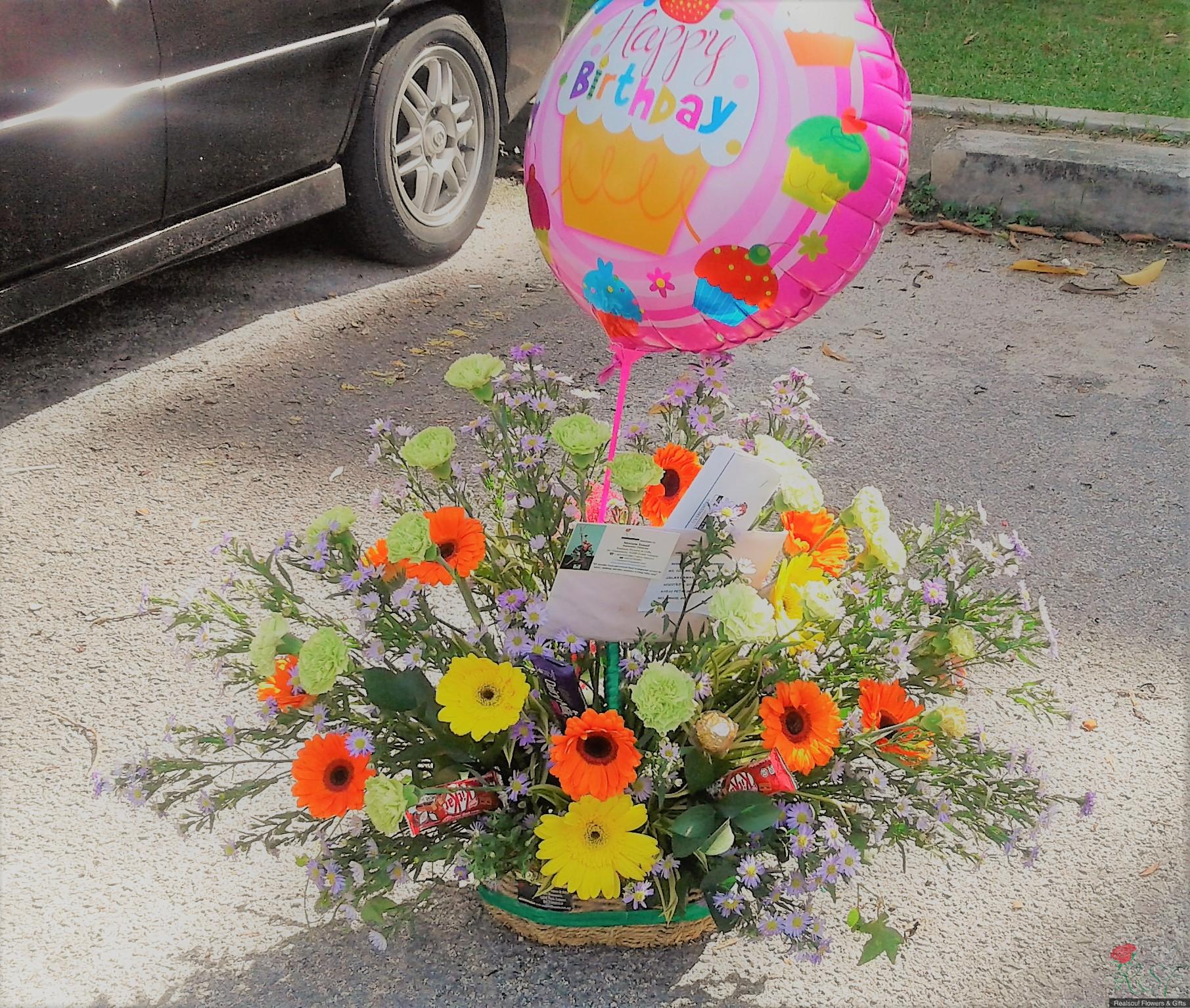 Flower Basket Arrangements: This slightly big sized arrangement contains all fresh flowers, namely gerbera daisies, carnations and peacocks. The greens are ruscus, ivys and song of jamaica. Chocolate bars are included as well as Ferrero Rocher and a big wishing baloon and a wishing card. Approximate size of basket is oval 30 cm long X 11 cm wide X 13 cm height.