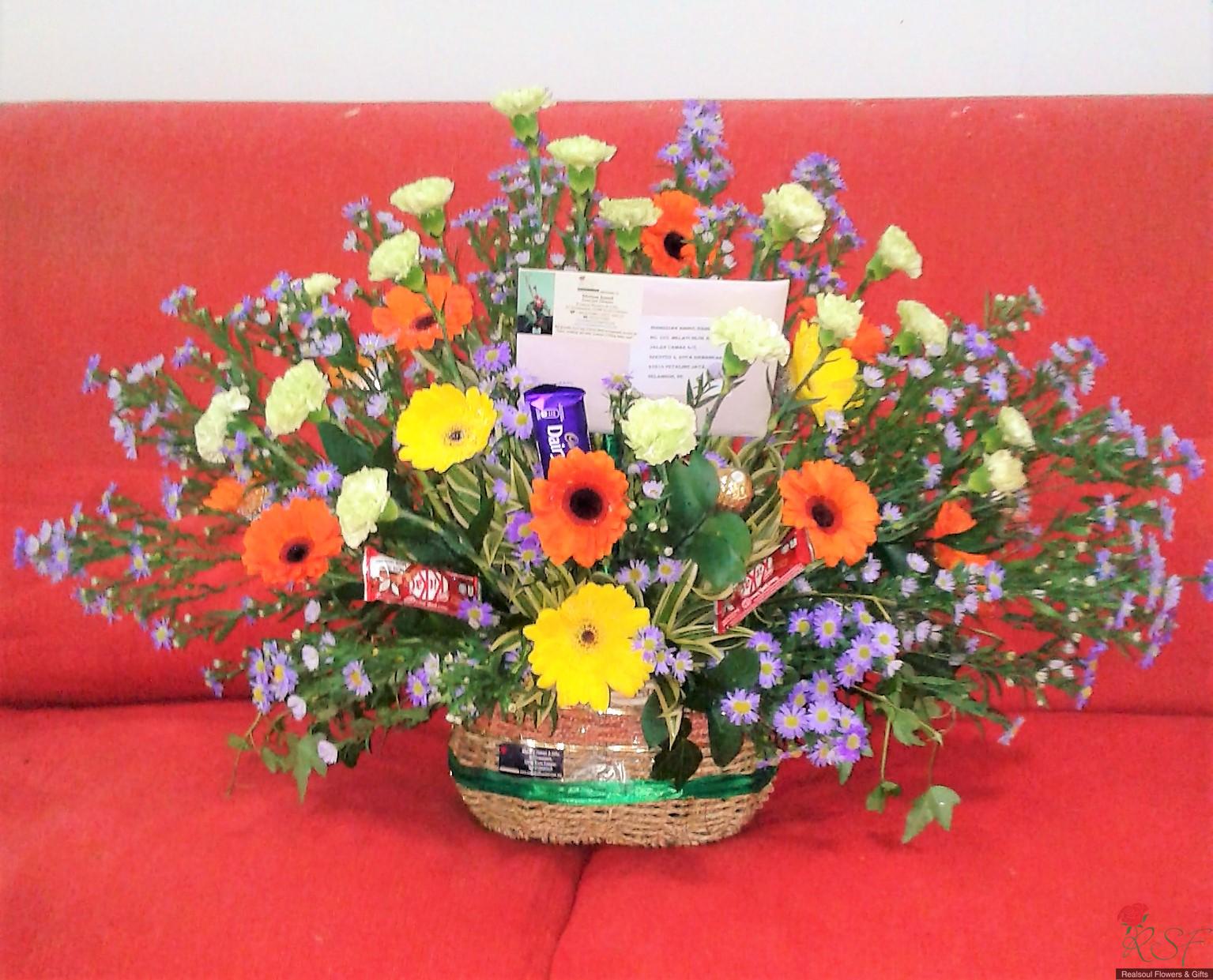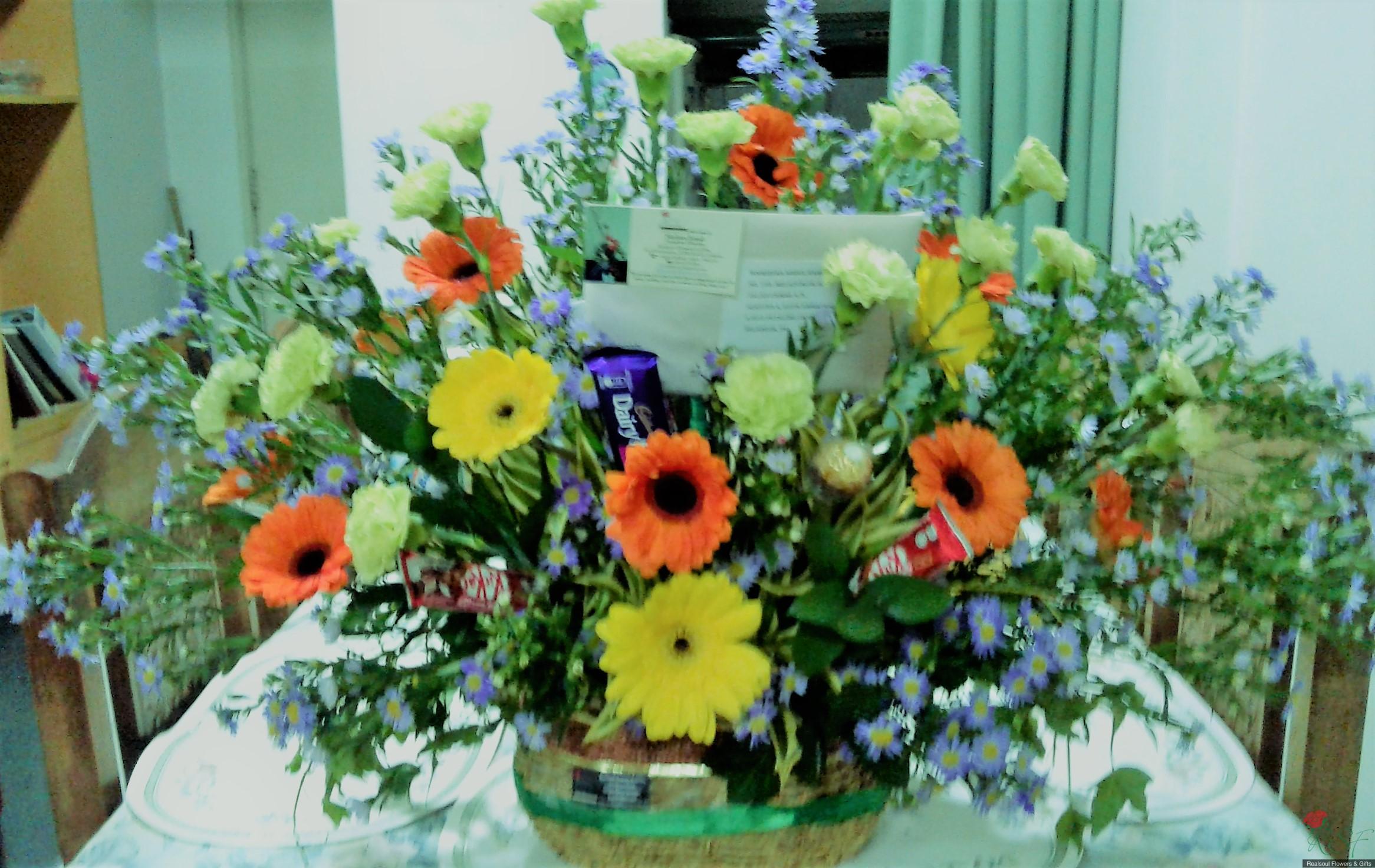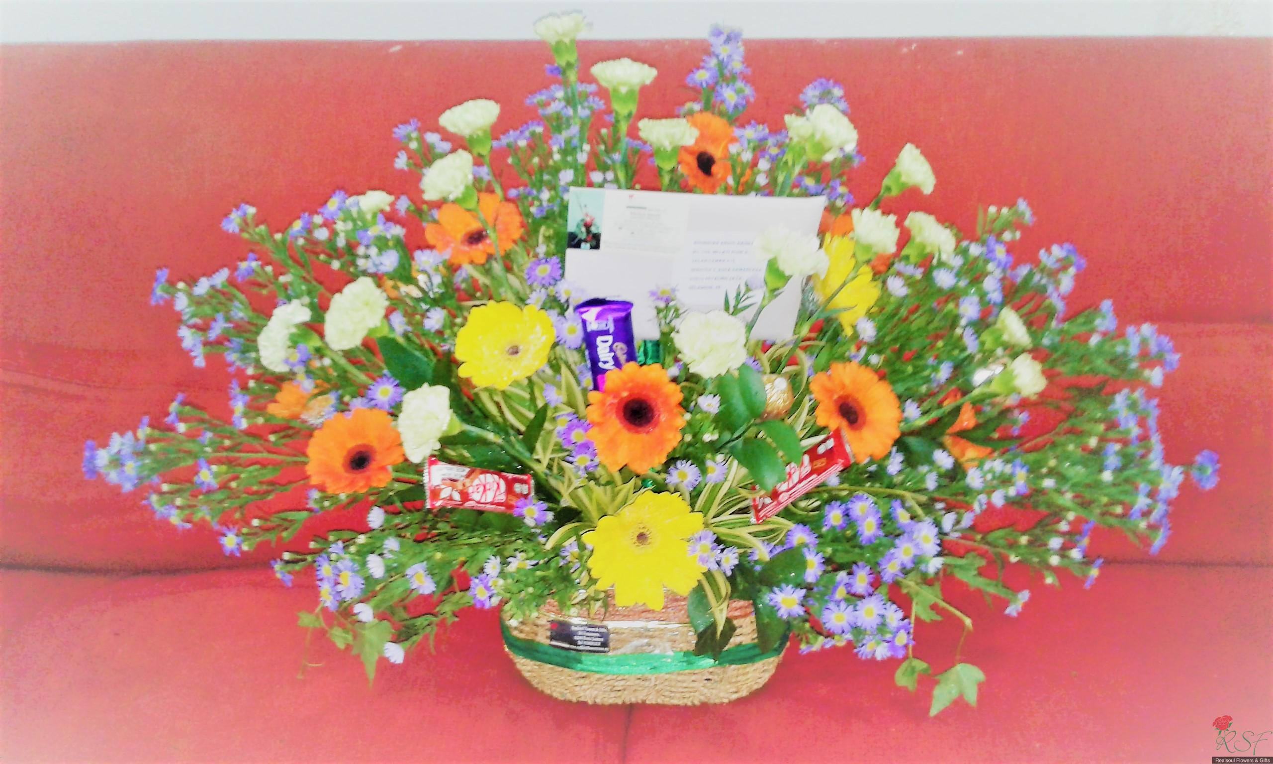 Flower Basket Arrangements: This slightly big sized arrangement contains all fresh flowers, namely gerbera daisies, carnations and peacocks. The greens are ruscus, ivys and song of jamaica. Chocolate bars are included as well as Ferrero Rocher and a big wishing baloon and a wishing card. Approximate size of basket is oval 30 cm long X 11 cm wide X 13 cm height.