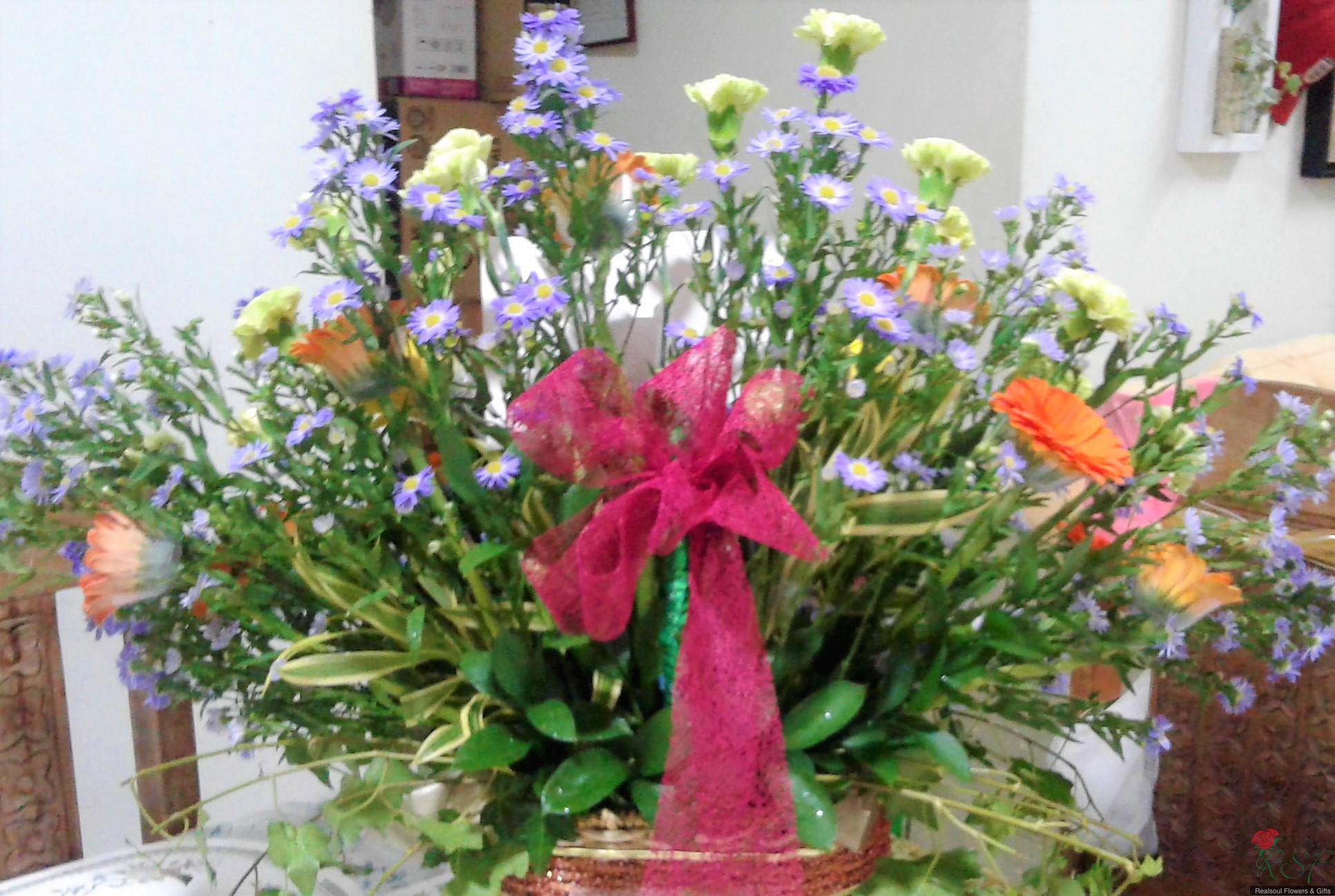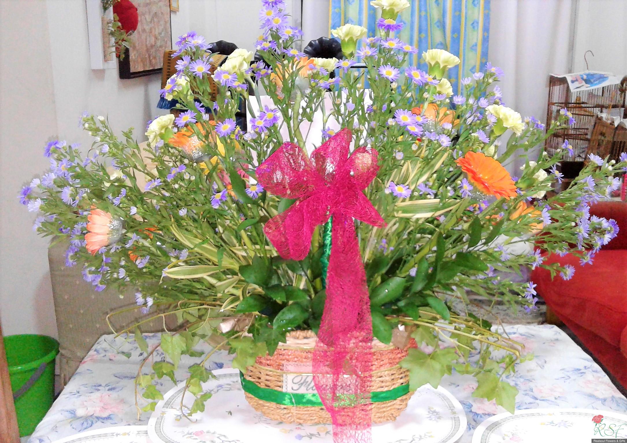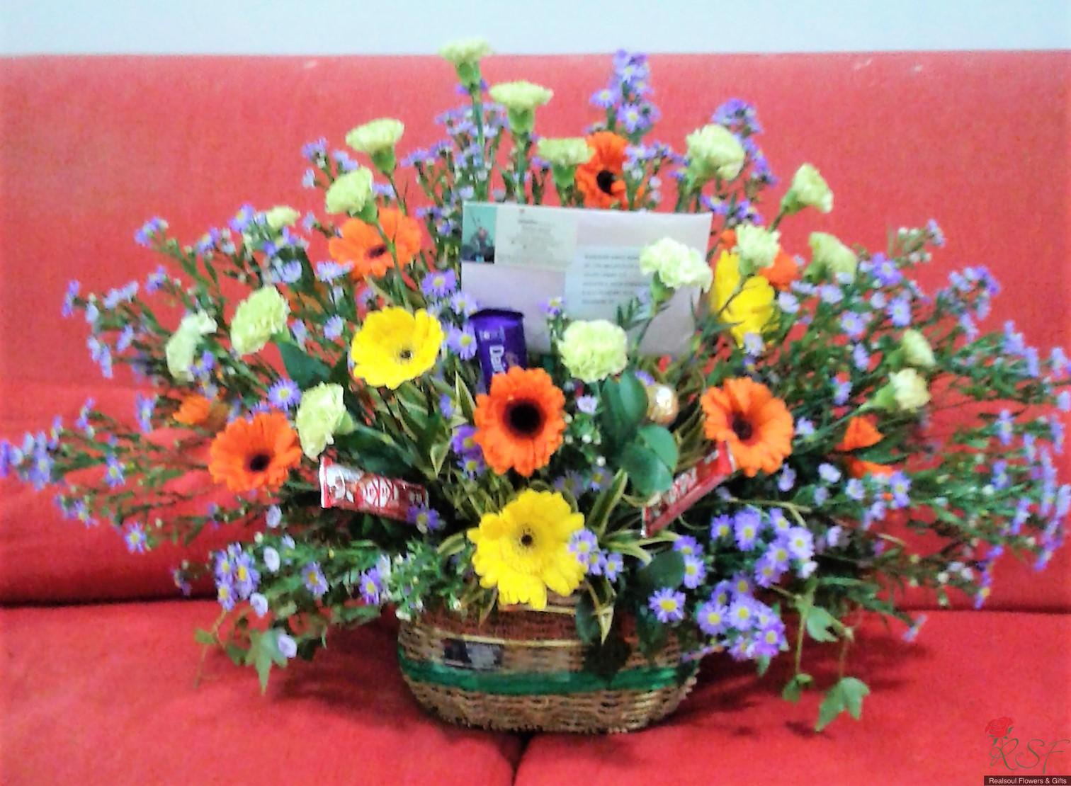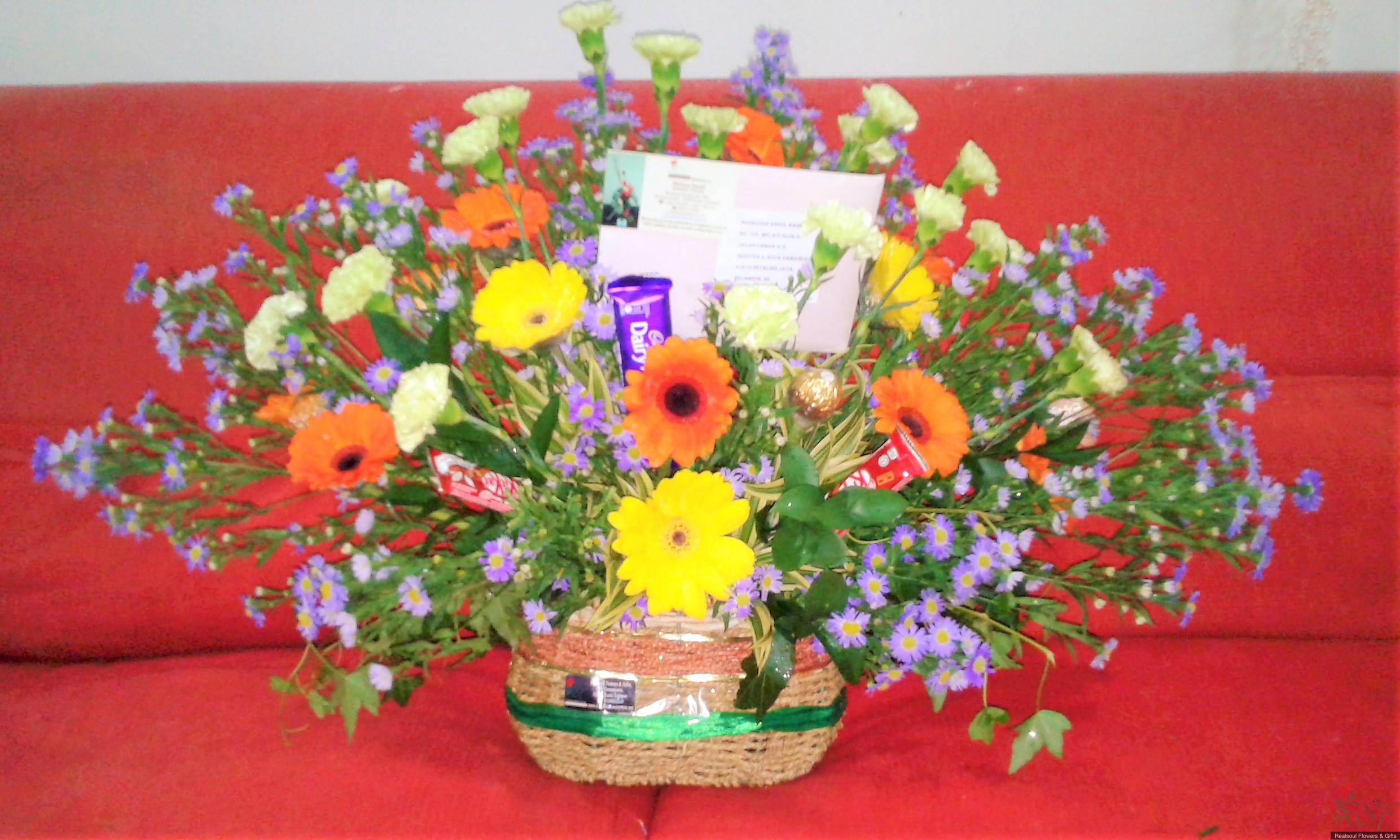 Flower Basket Arrangements: This slightly big sized arrangement contains all fresh flowers, namely gerbera daisies, carnations and peacocks. The greens are ruscus, ivys and song of jamaica. Chocolate bars are included as well as Ferrero Rocher and a big wishing baloon and a wishing card. Approximate size of basket is oval 30 cm long X 11 cm wide X 13 cm height.