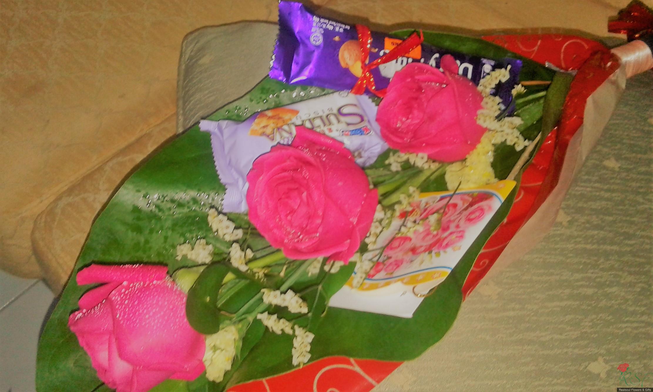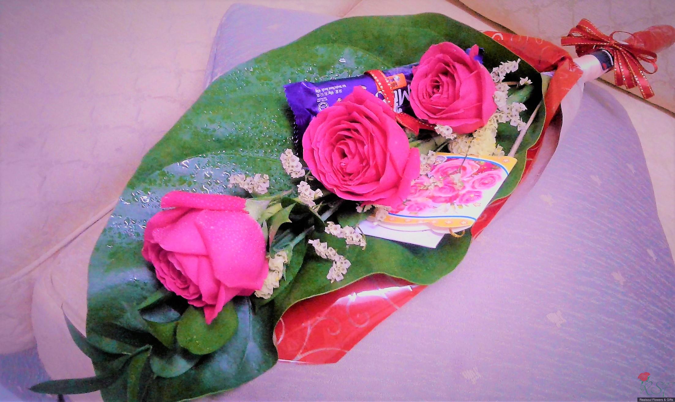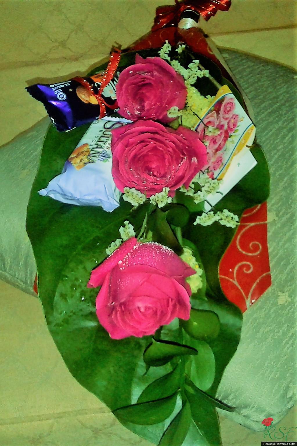 Hand/Graduation Bouquet: This particular arrangement is suitable for graduation/congratulatory gift bouquet as well as any occasion bouquet gift. Now that SPM /STPM/ A Levels results have been announced, as a congratulatory gift to the successfull recipient, this arrangement is an apt one to consider. This design comes with red roses, statice, chocolate bars, raisin biscuits pack, ruscus and backed up by monsteira leaf foliage. A congratulatory wishing card is included as well. If a toy bear is added the bouquet will be priced at RM108.00.