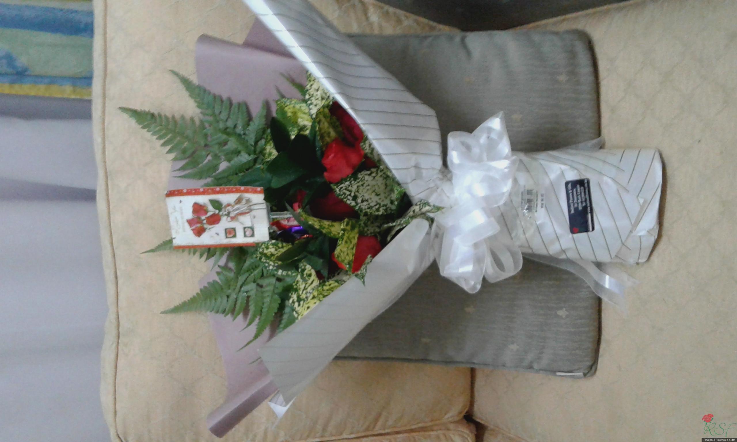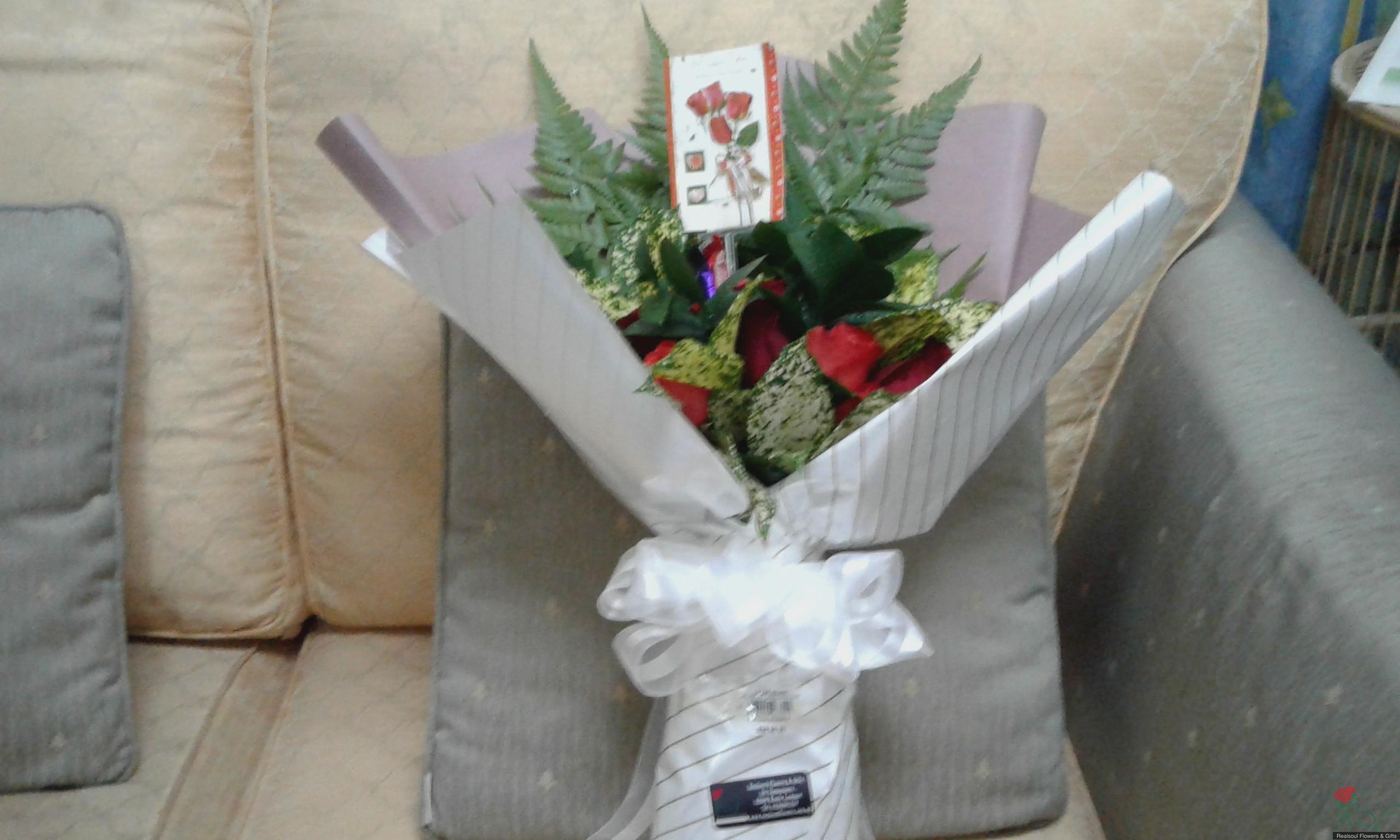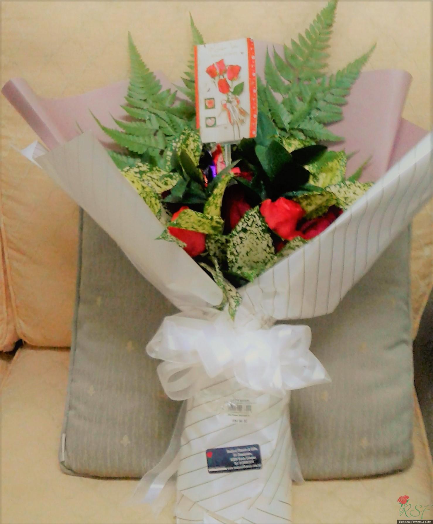 Hand Bouquet/Graduation bouquet: This design can be generally used. Either for graduation gift, birthday gift and the like. It consists of red roses, fillers and foliage. However the blooms can be replaced with either carnations, gerberas or lilies or a mixed. The design can further added with a small home made chocolate cake or slices of chocolate cake (see details in Miscellaneous category code MISC CBS 141 or MISC CBC 140) and prices increased accordingly with additionals.