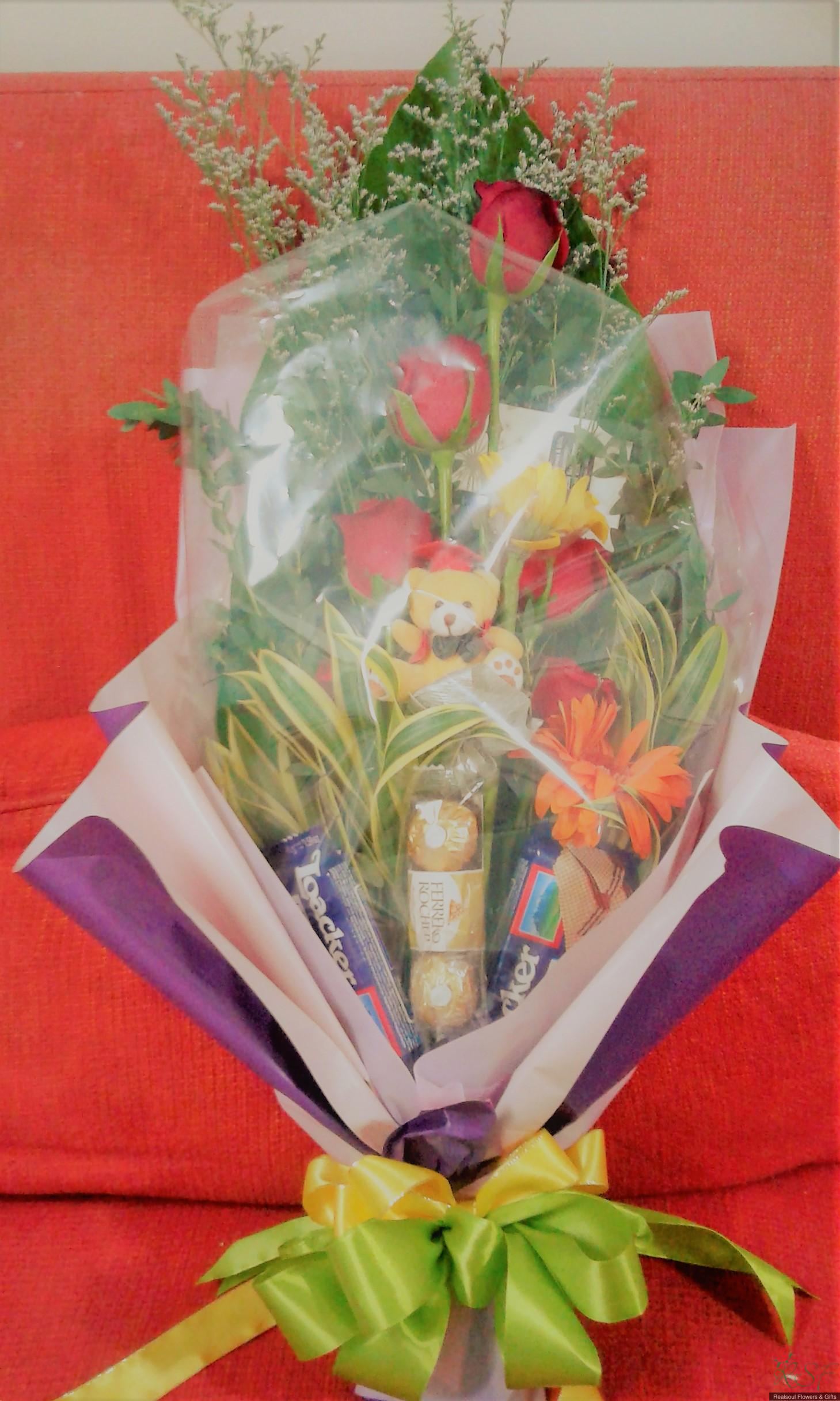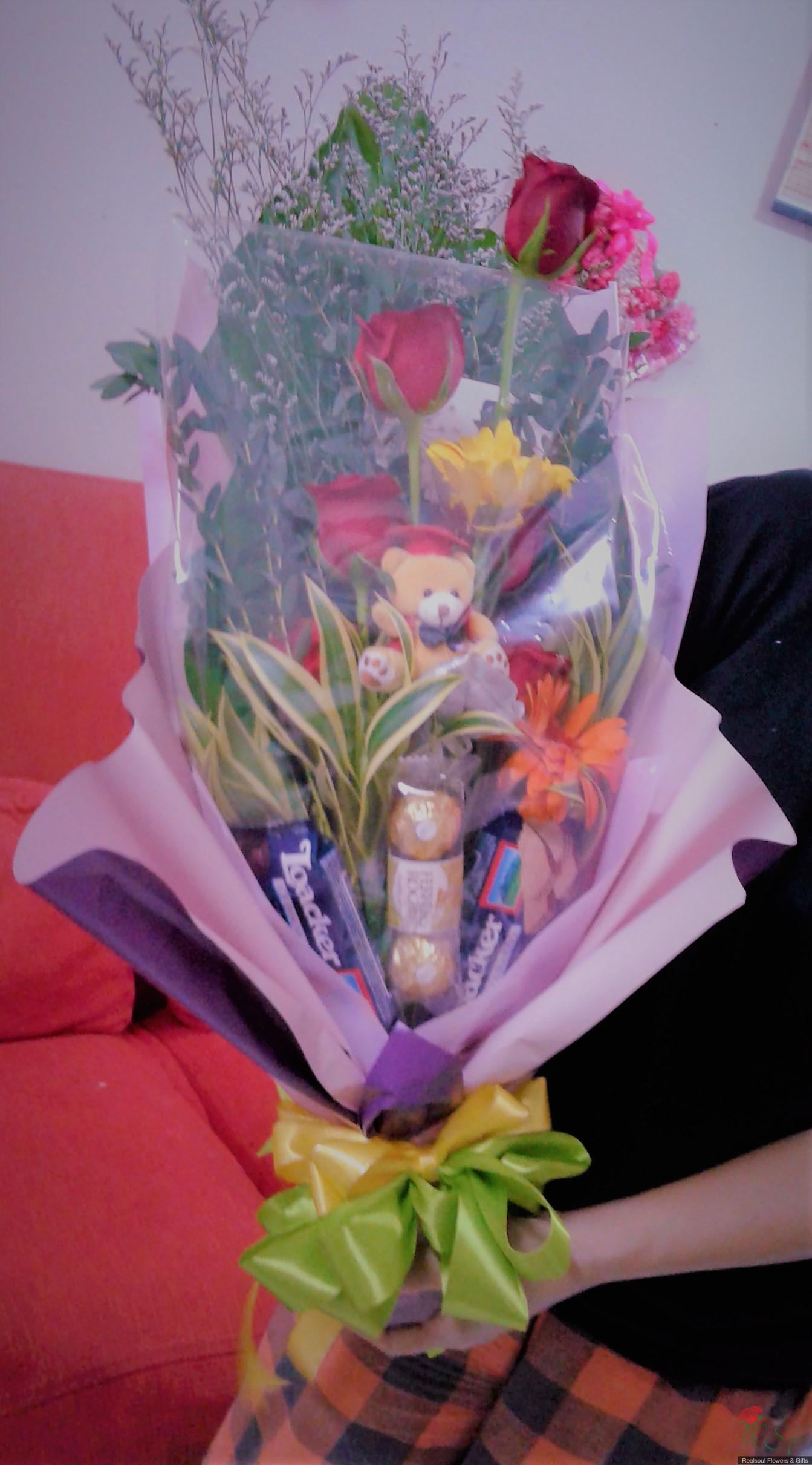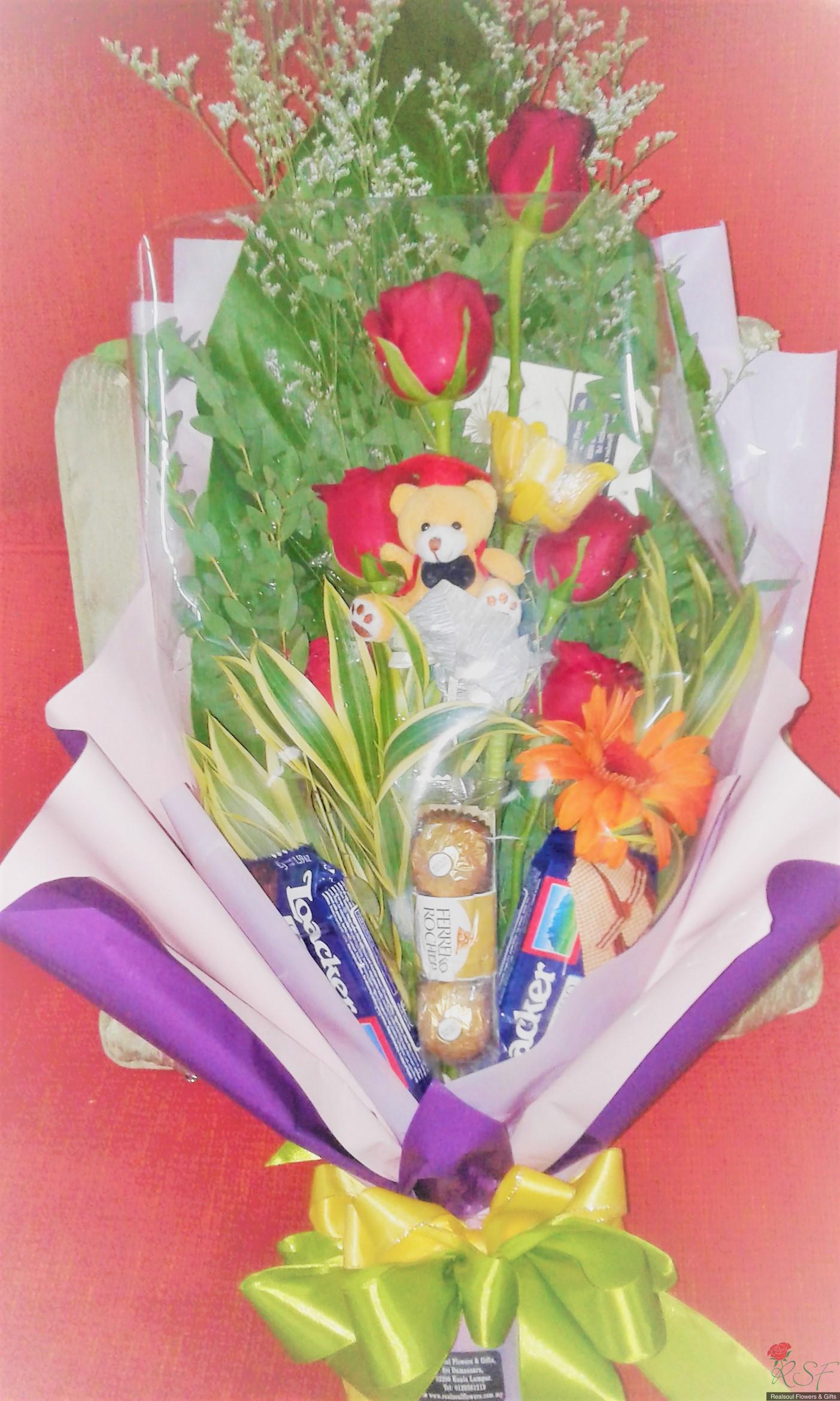 GRADUATION HAND BOUQUET: Exquisite hand bouquet especially designed for graduation/congratulations purpose. Consists of 6 roses, 2 gerbera daisies, 3 Ferrero Rocher, 2 Loacker bars, toy bear, wishing card, caspia & foliages such as forest leaf, song of jamaica, and silver leaf; wrapped 3 layers & decorated with fluffed ribbons. SHIP IN MALAYSIA & WORLDWIDE (VIA OUR SISTER FLORISTS BASED WORLDWIDE).