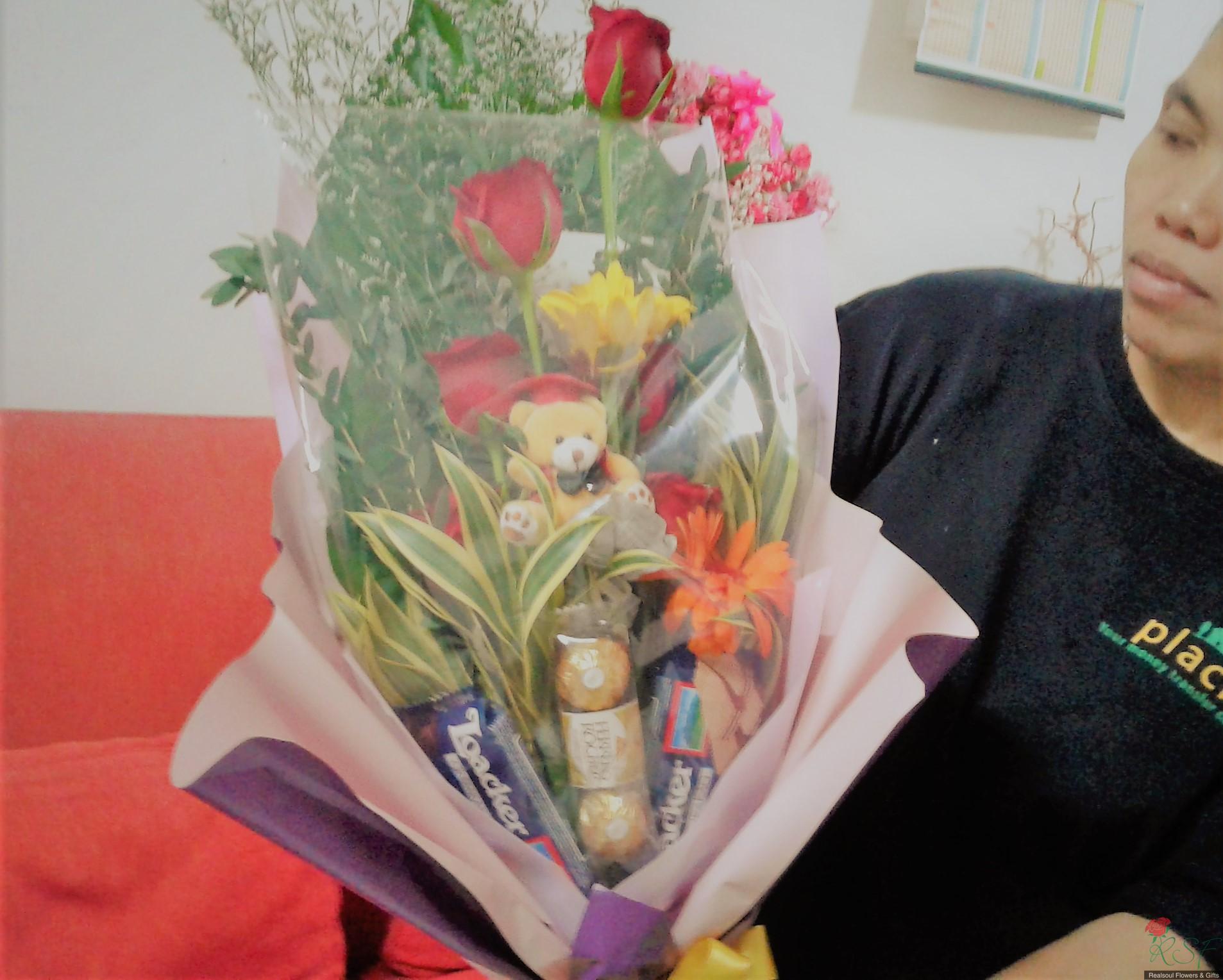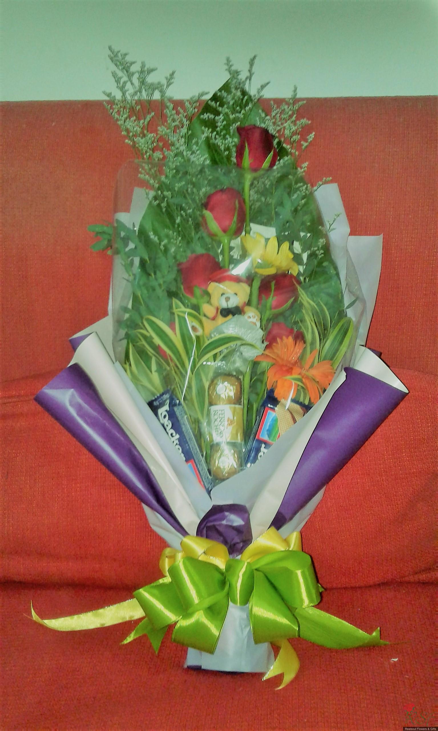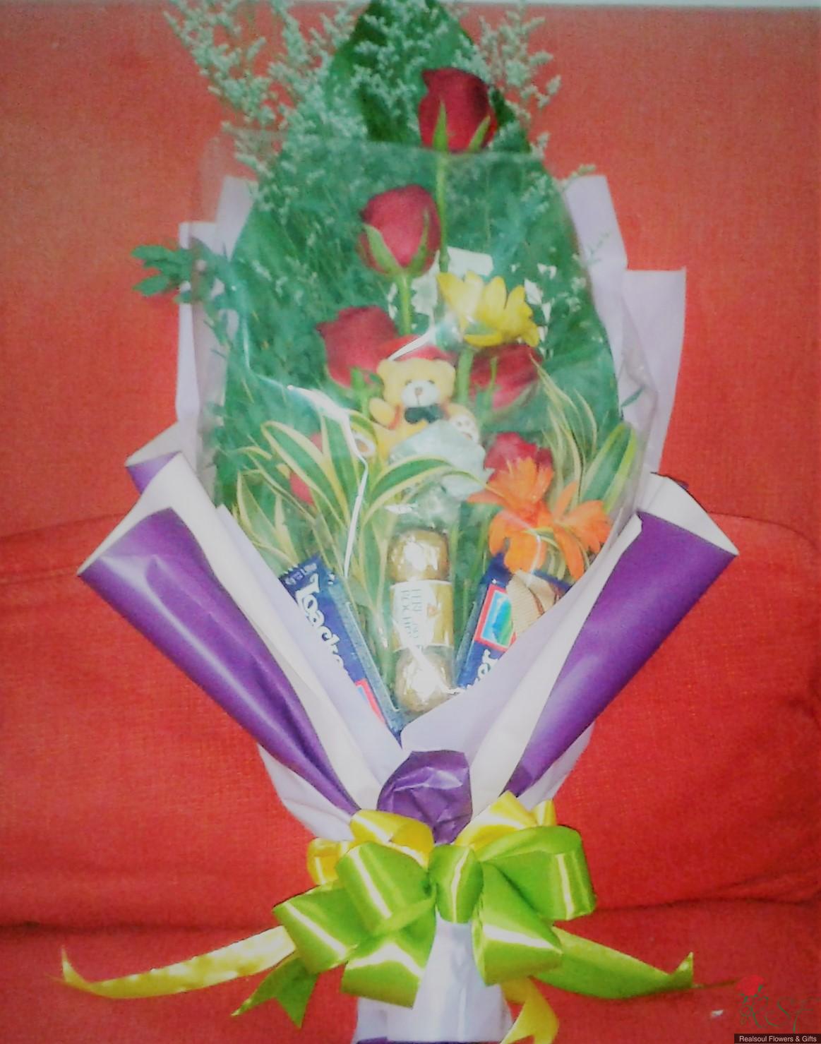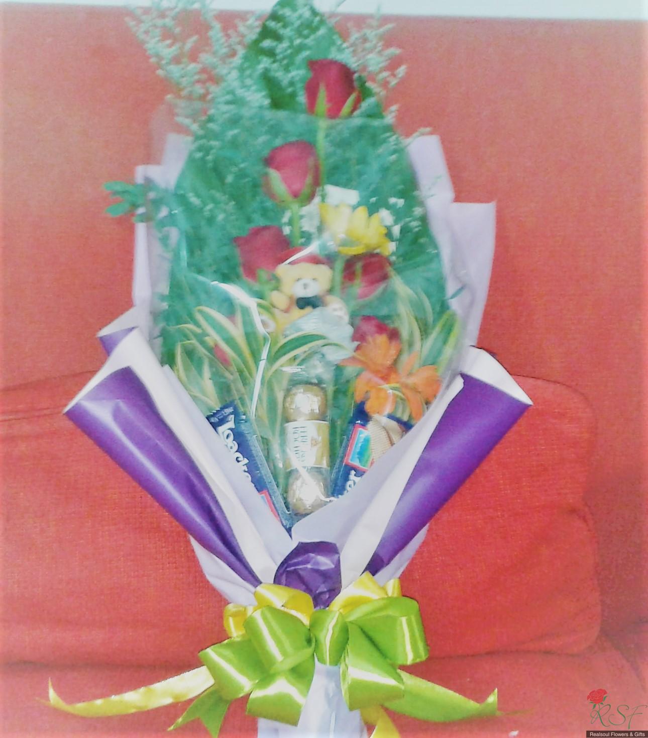 GRADUATION HAND BOUQUET: Exquisite hand bouquet especially designed for graduation/congratulations purpose. Consists of 6 roses, 2 gerbera daisies, 3 Ferrero Rocher, 2 Loacker bars, toy bear, wishing card, caspia & foliages such as forest leaf, song of jamaica, and silver leaf; wrapped 3 layers & decorated with fluffed ribbons. SHIP IN MALAYSIA & WORLDWIDE (VIA OUR SISTER FLORISTS BASED WORLDWIDE).