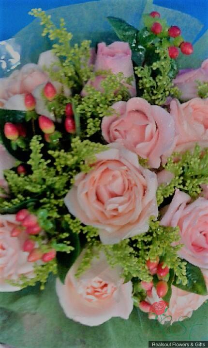 Hand bouquet: Pink roses, red berries, fillers and foliage.