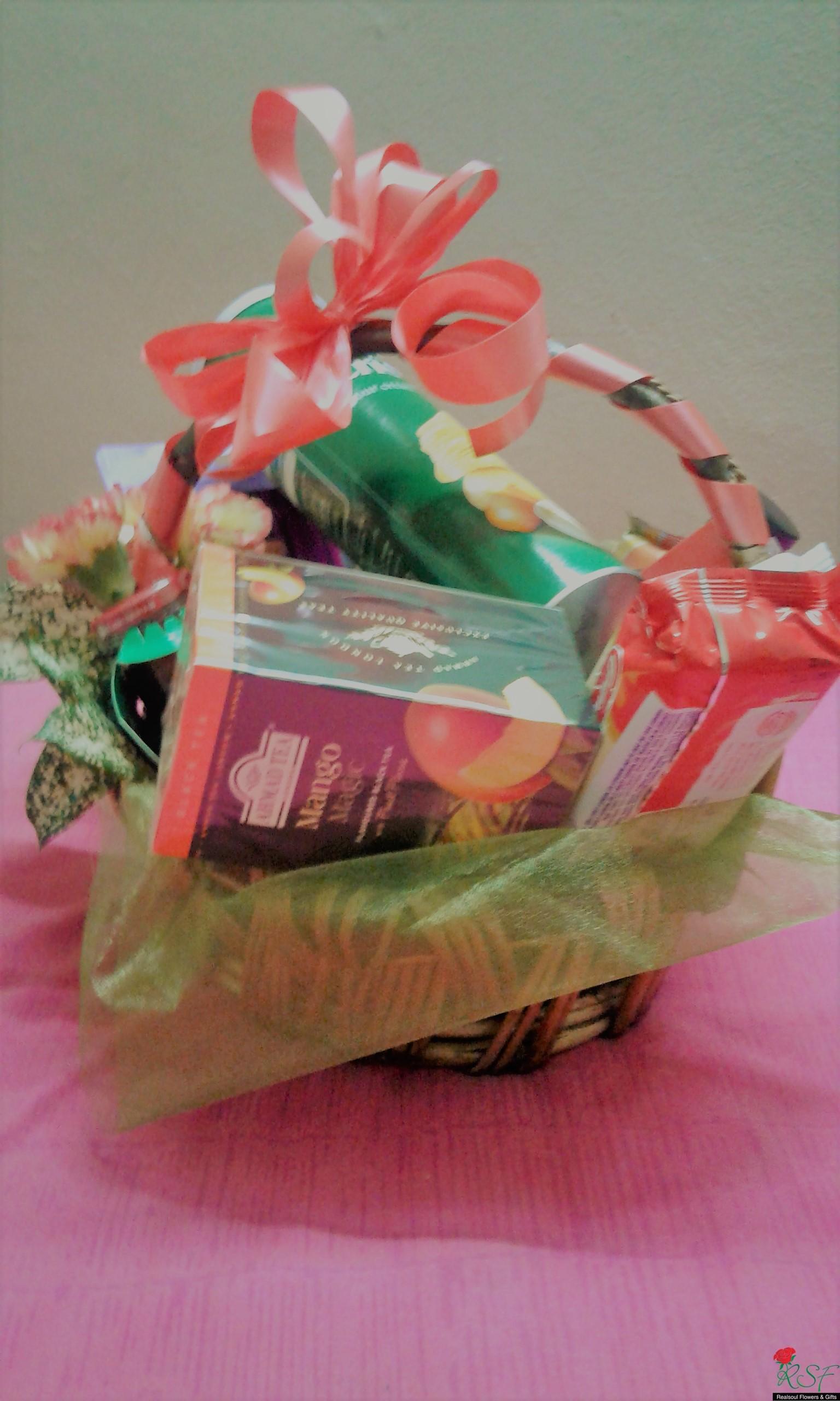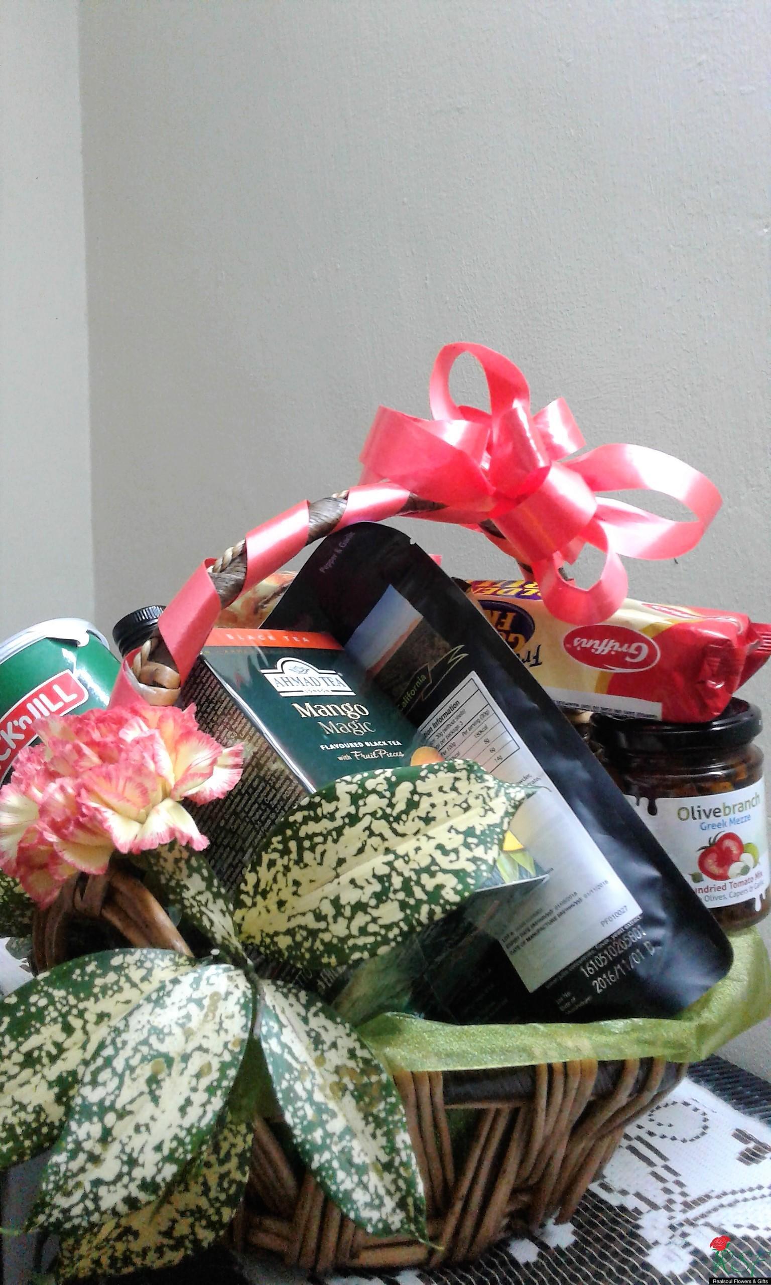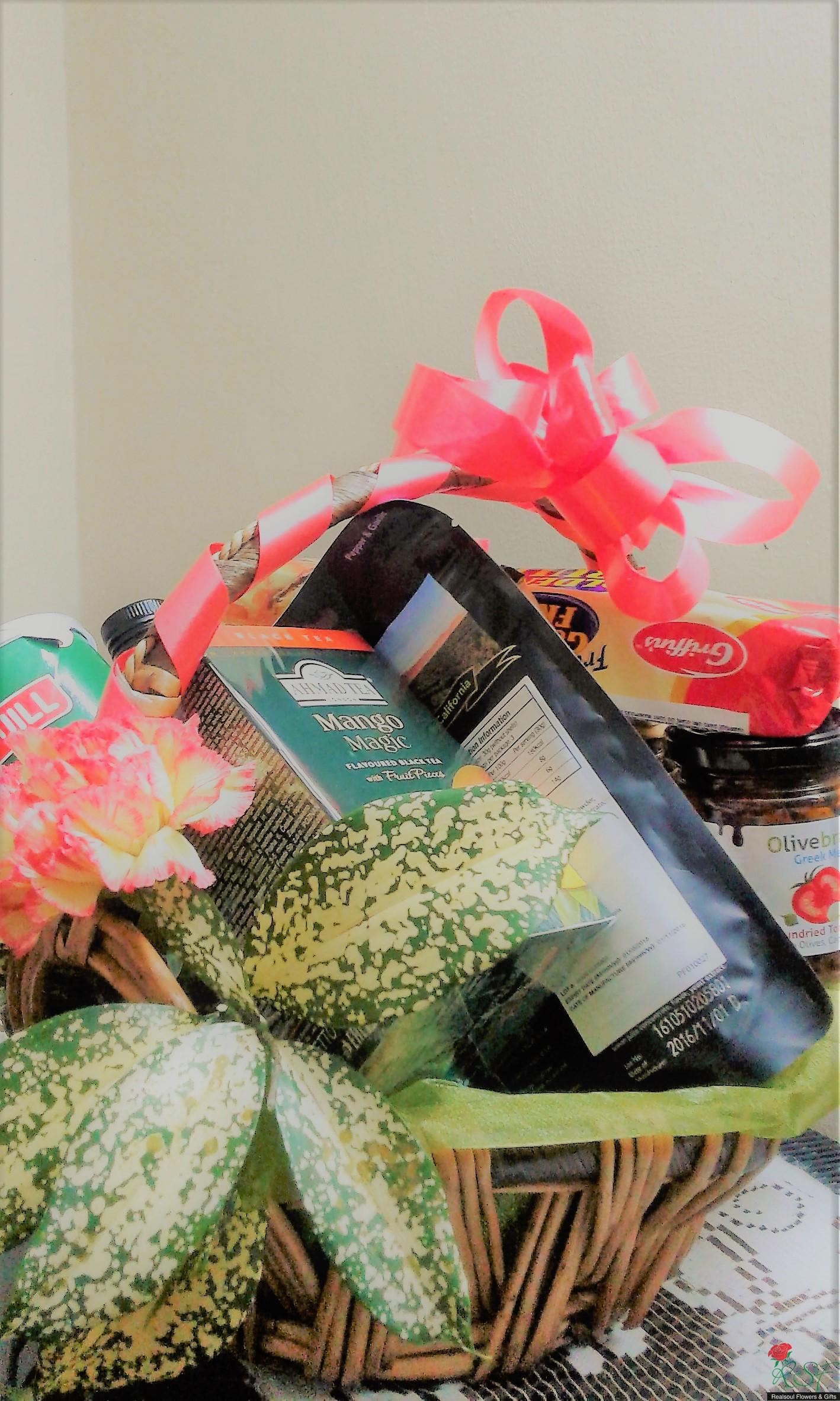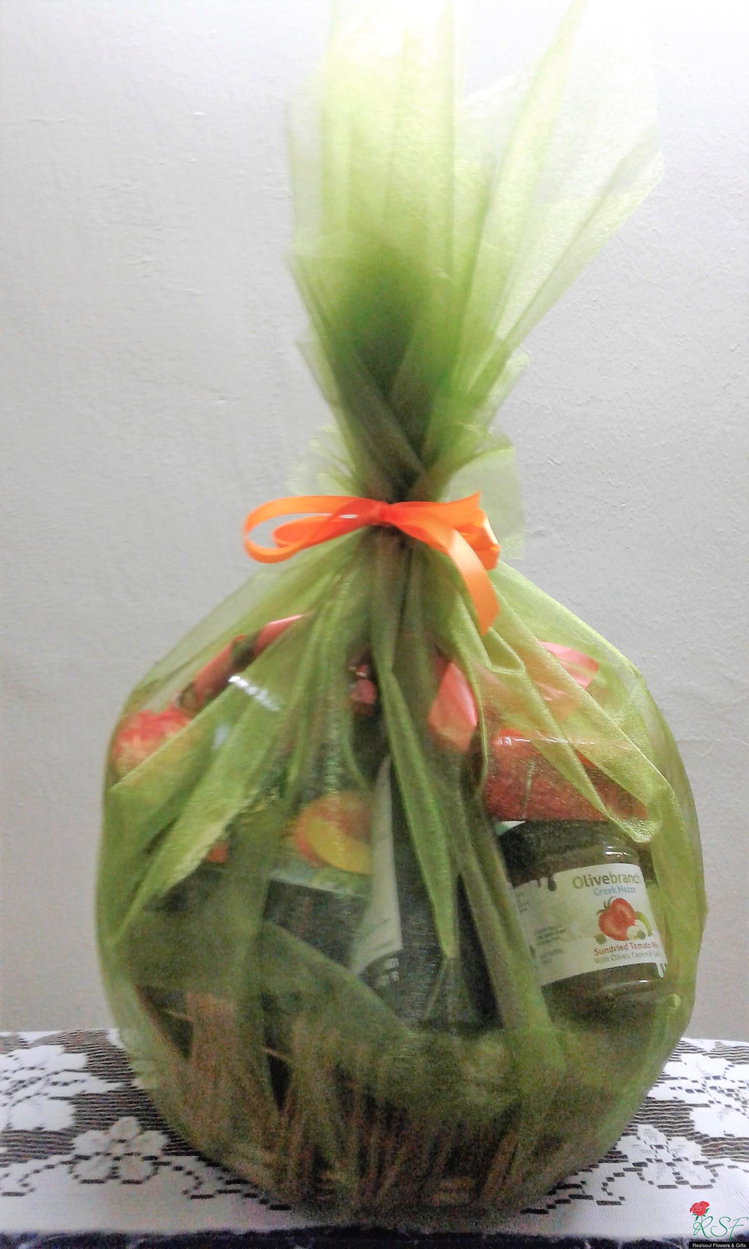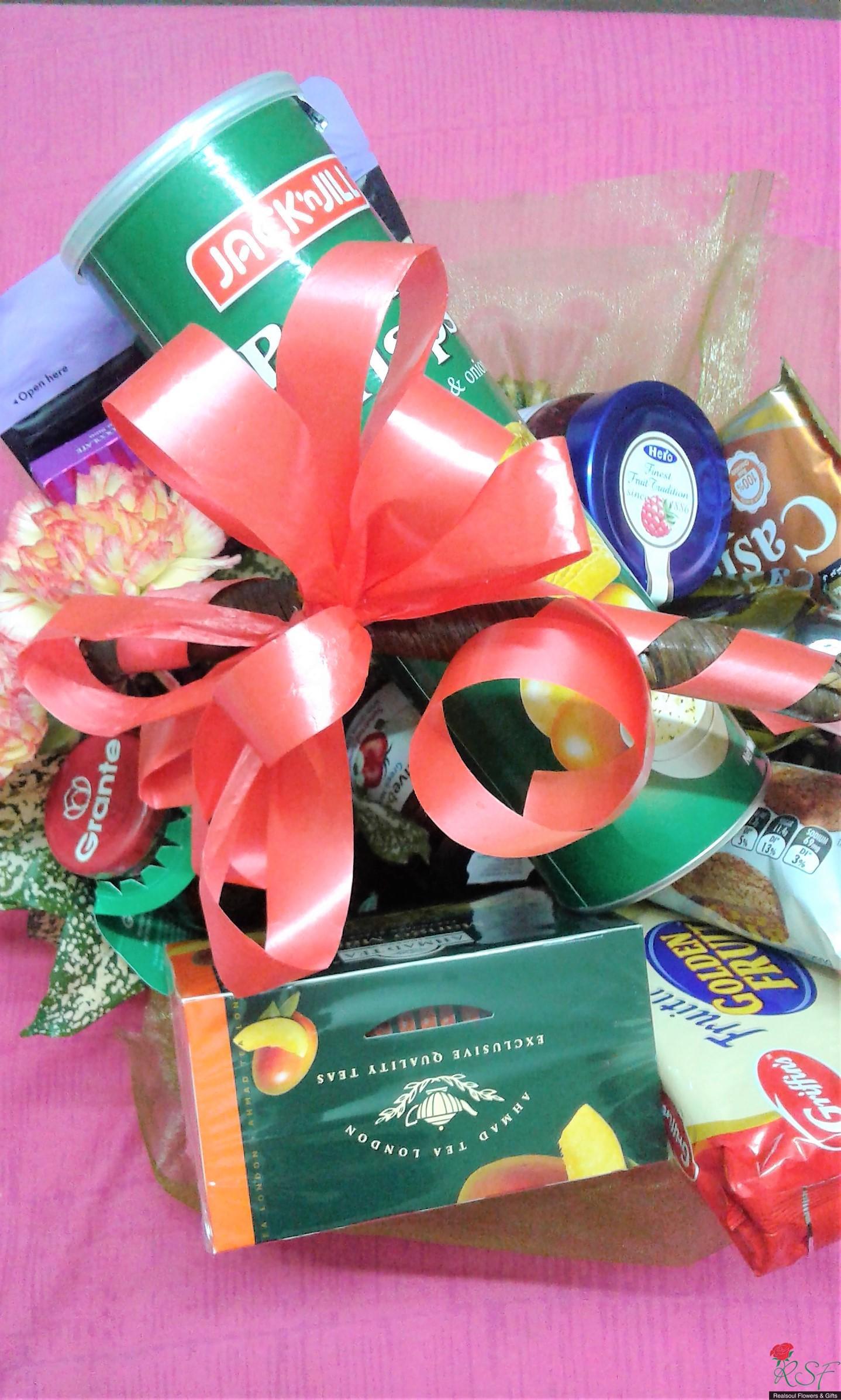 Hamper and corporate gifts: Food products in basket include grante pomegranate juice, hero raspberry jam, olive oil, arnotts ginger biscuit, Griffin fruit biscuit, potato chips, Ahmad tea, milk chocolate bars, pistachios and sundried tomato mix and fresh flower deco.