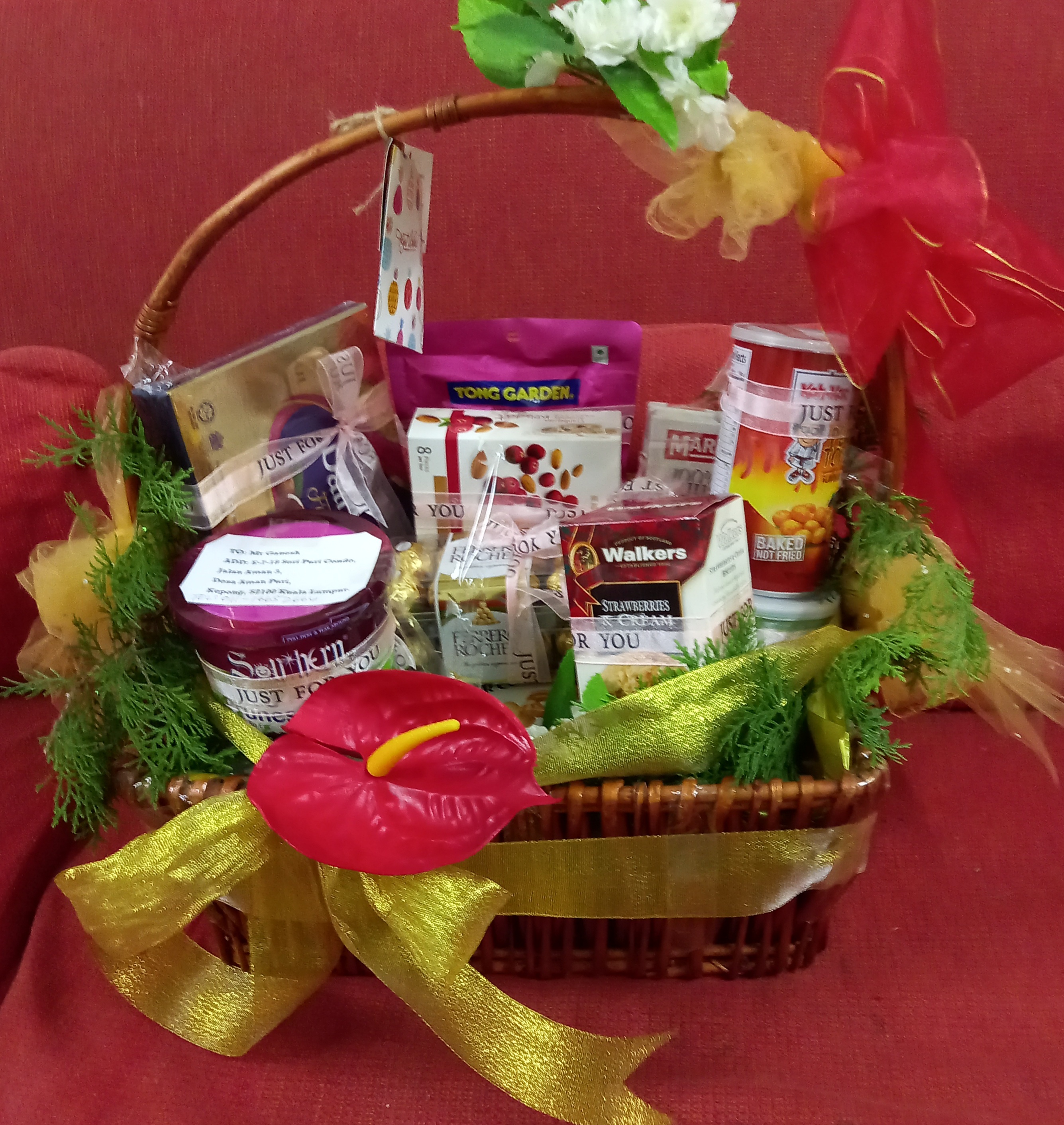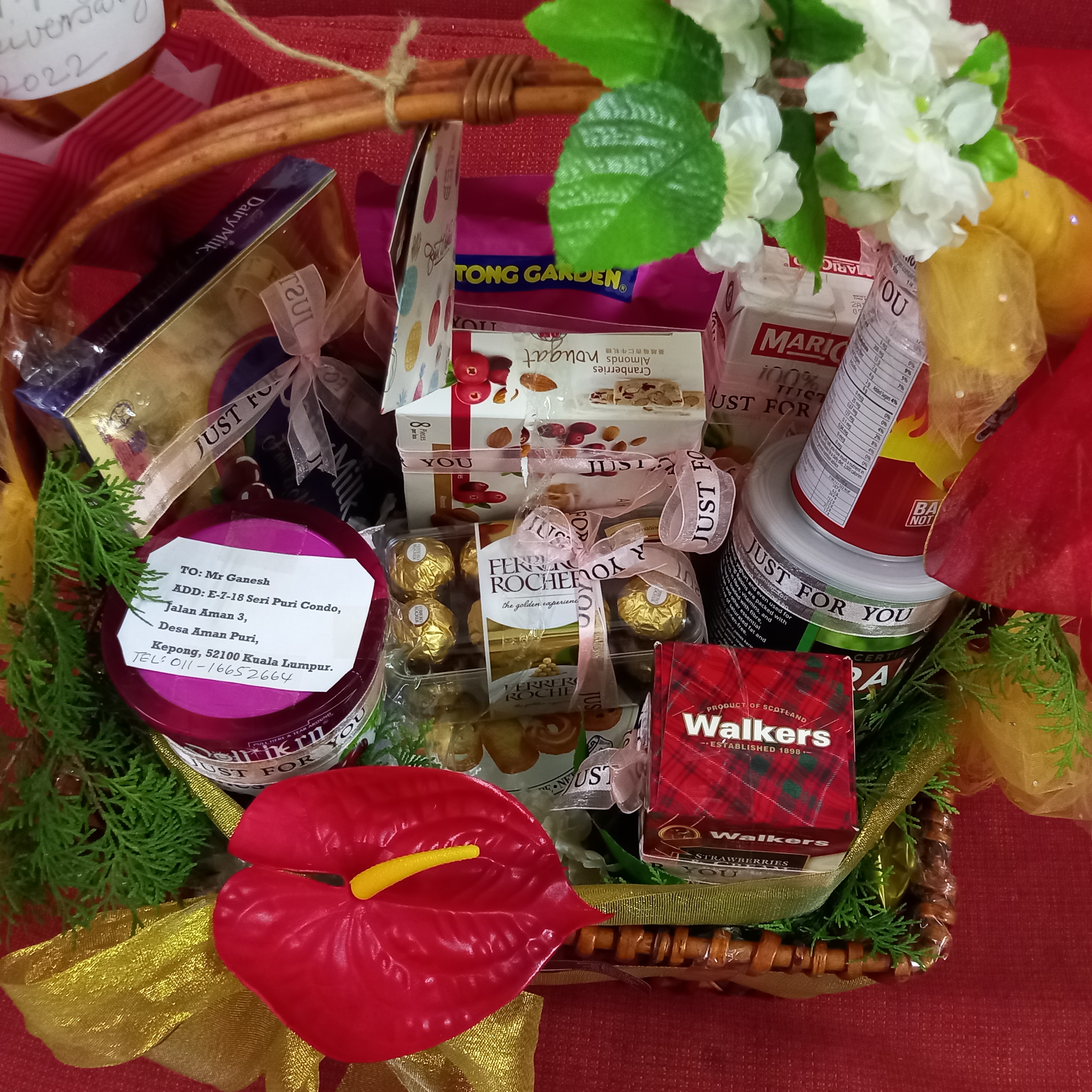 THIS HAMPER GIFT IN AN OVAL BASKET IS DESIGNED FOR CELEBRATING FATHER'S DAY. THE CONTENT ARE FOOD STUFF AND DRINKS.