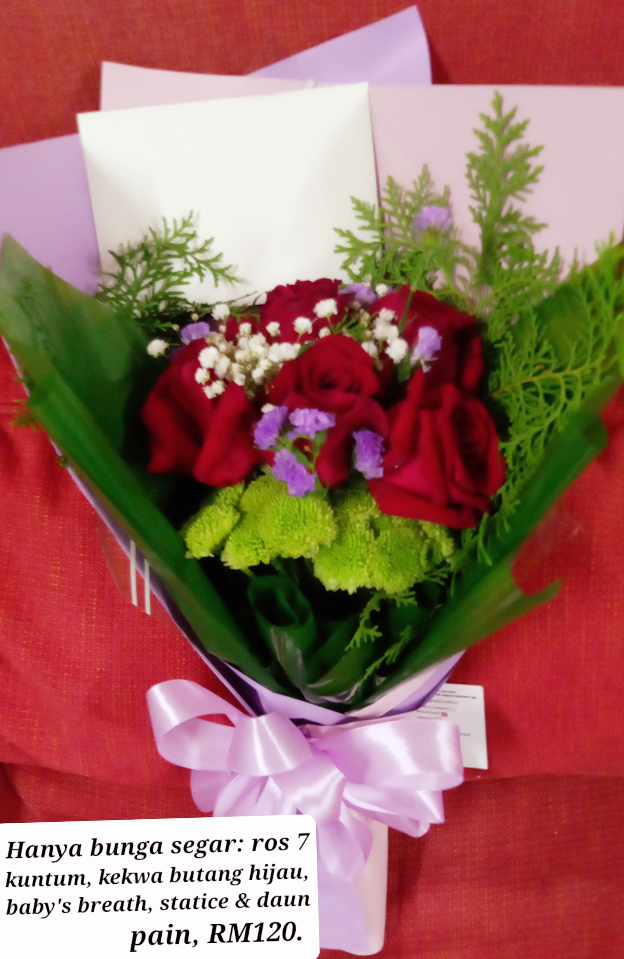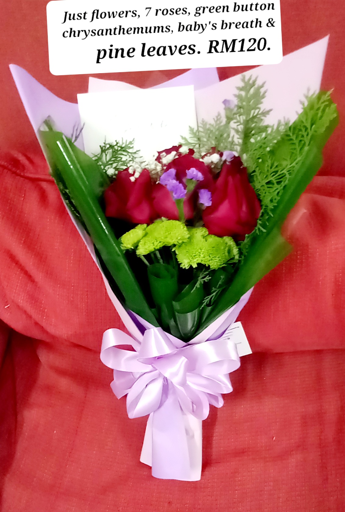 ROSE BOUQUET WITH 7 ROSES ANDGREEN BUTTON CHRYSANTHEMUMS, BABY'S BREATH & PINE LEAVES.