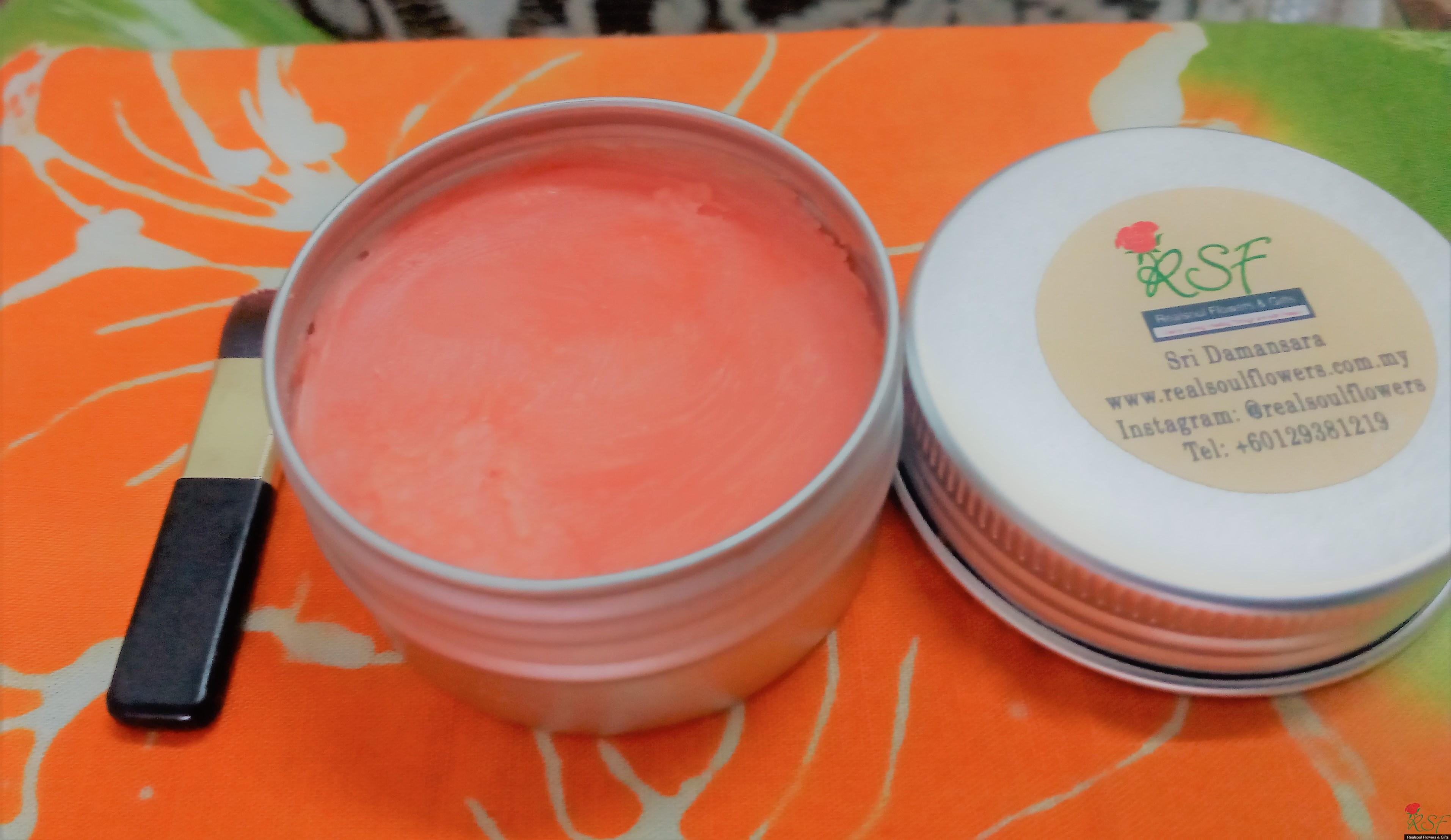 The cheek rouge or blusher in mild coral colour can also serve as lib balm, or eye shadow (used after applying facial powder). The rouge ingredients in pot blush or balm form is made of all natural ingredients such as bees wax, almond oils, coconut oil, shea butter, cocoa butter, ylang ylang fragrant oil (client can customise fragrant either ylang ylang, jasmine or rose oil), and colouring (client can customise to have red orange or mild coral). Weighs 30 gm in a jar.