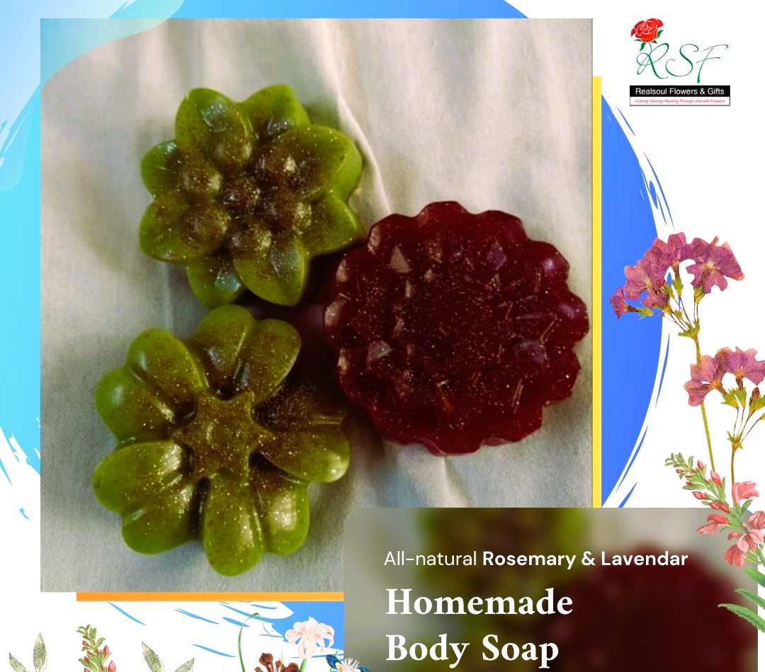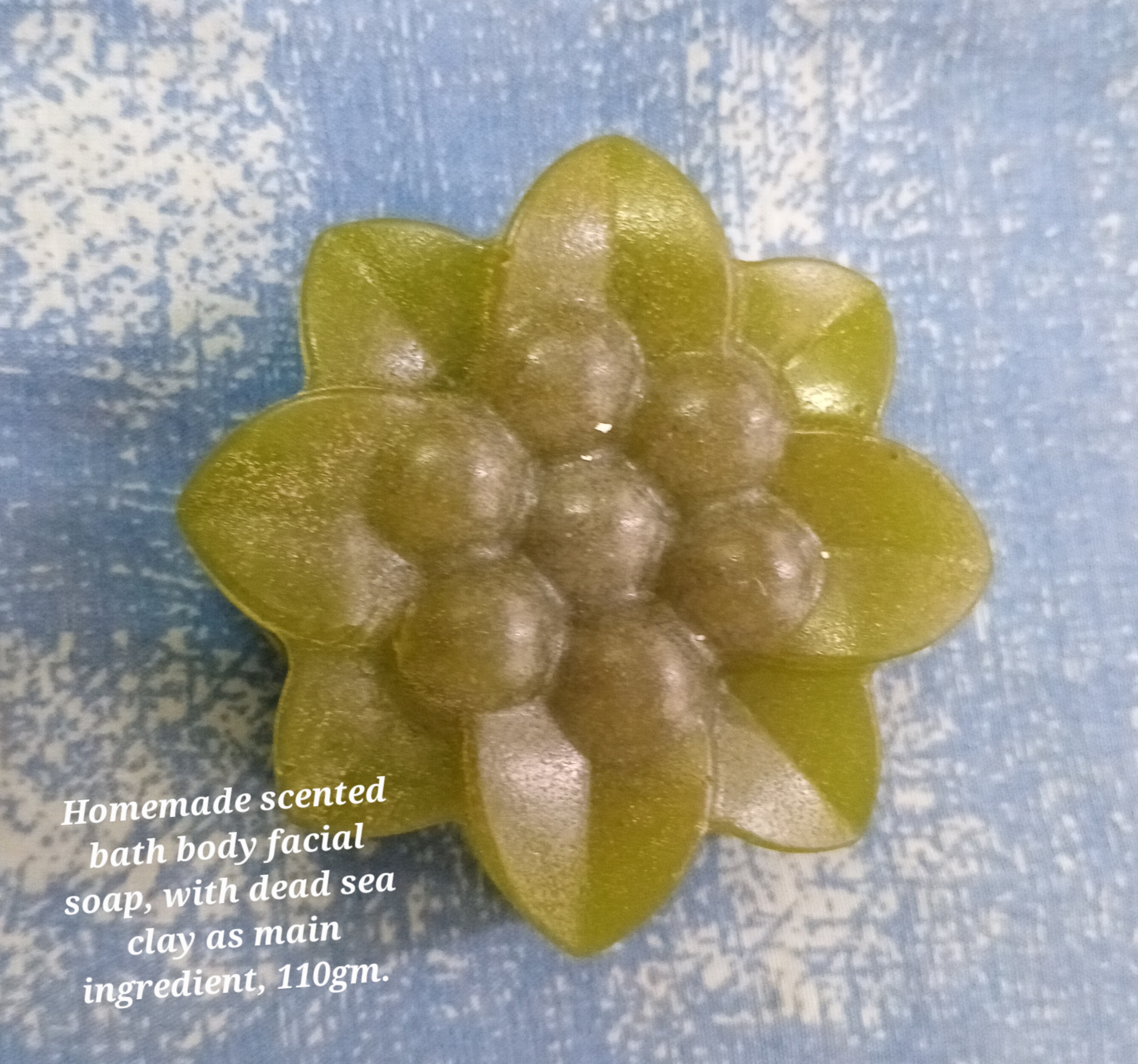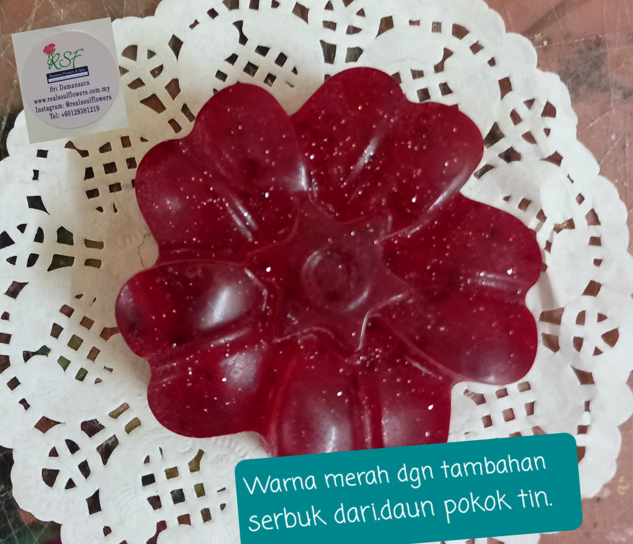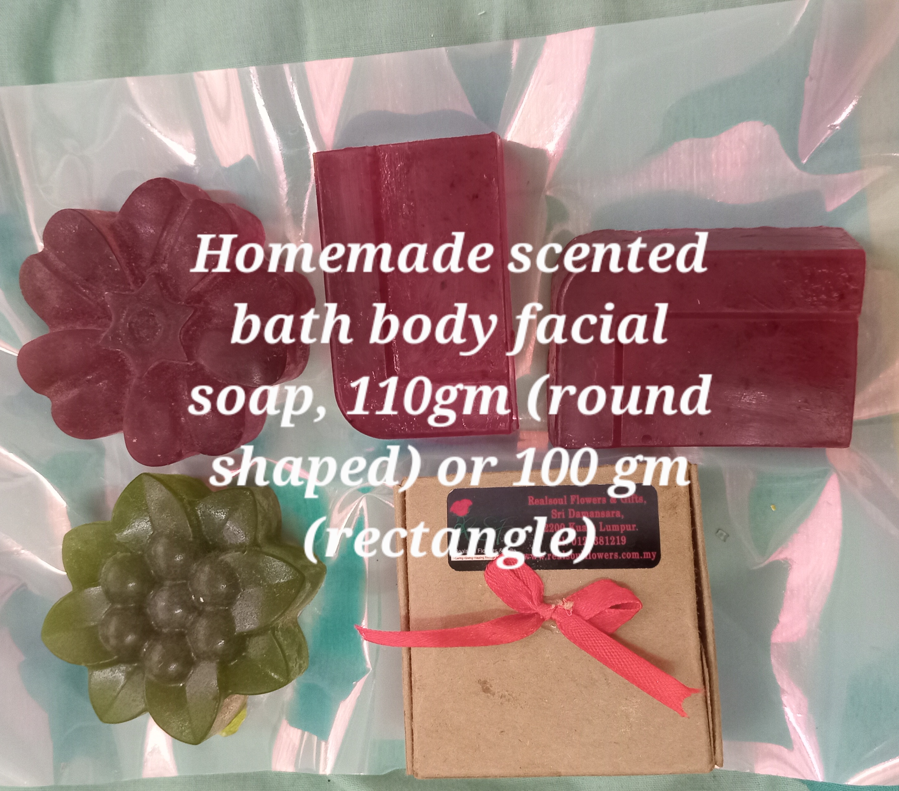 MISCELLANEOUS & GIFTS: Natural scented coloured body and facial family soap with dried rose petals or powdered dried fig leaves, dead sea clay. Measuring 6.9 cm diameter and 2.5 cm thickness. Ingredients used are HALAL and cured for a fortnight before sale. Glitters are added as well. Two colours available green, red. Available for shipping WORLDWIDE. Minimum order is 3 bars (330 gm) for local and international recipient. PRICE quoted for 3 bars. MYR17each bar onwards depending on ingredients used. Comes packed in an organza pouch. Item can be added to any floral arrangement of ours in bouquet/basket/boxed/vase forms.
