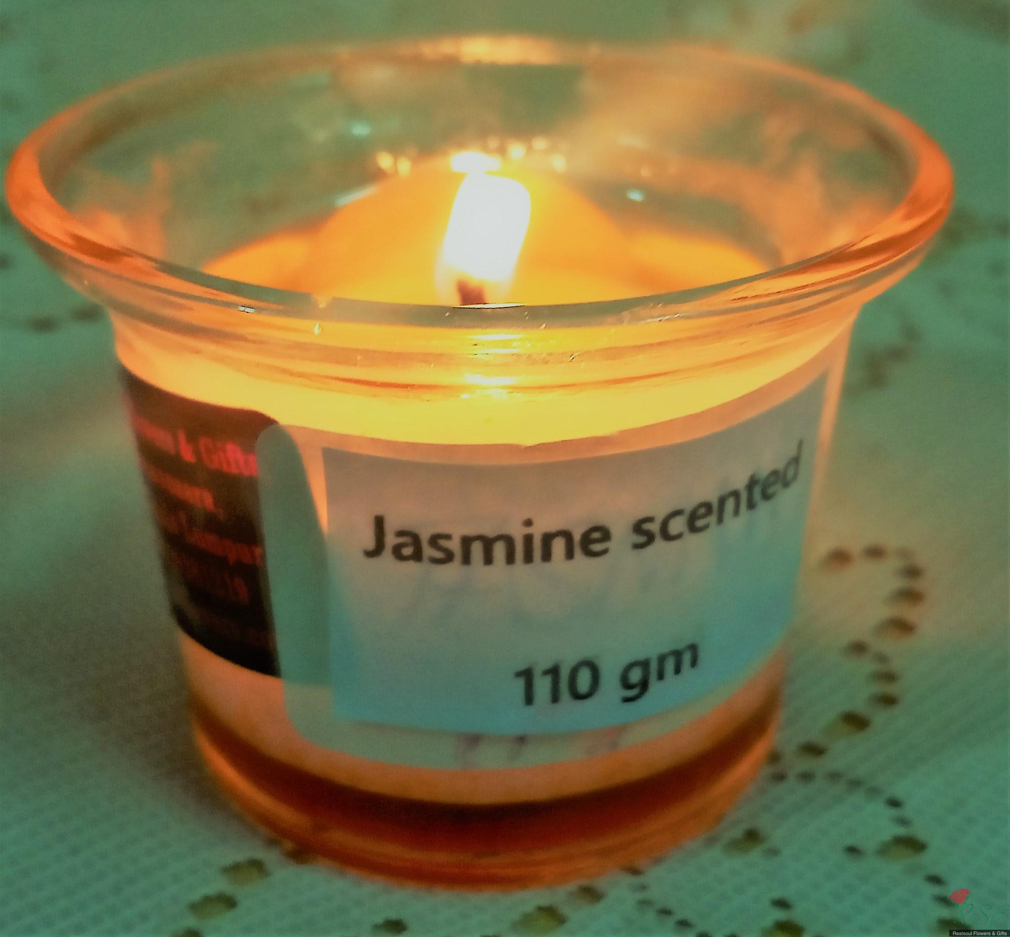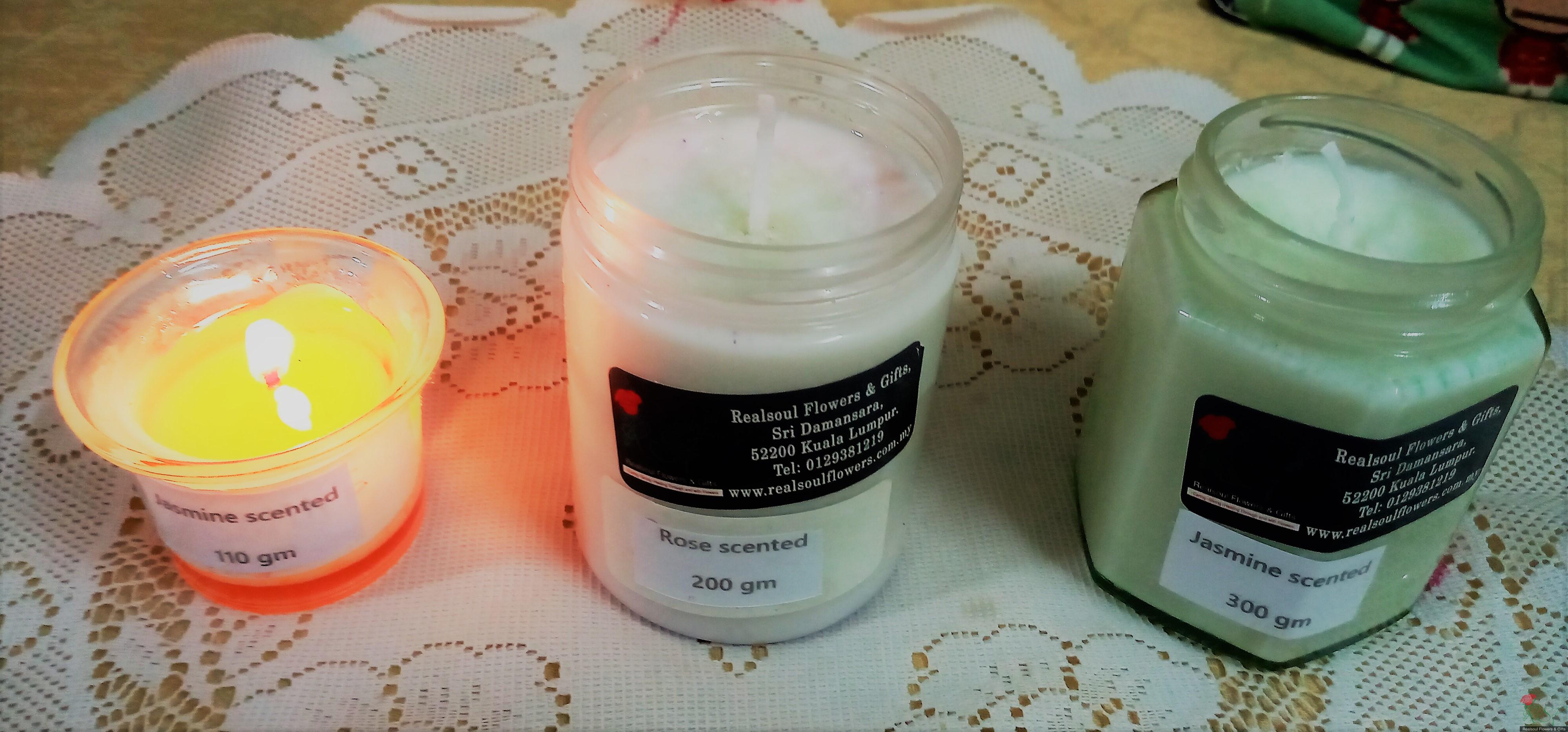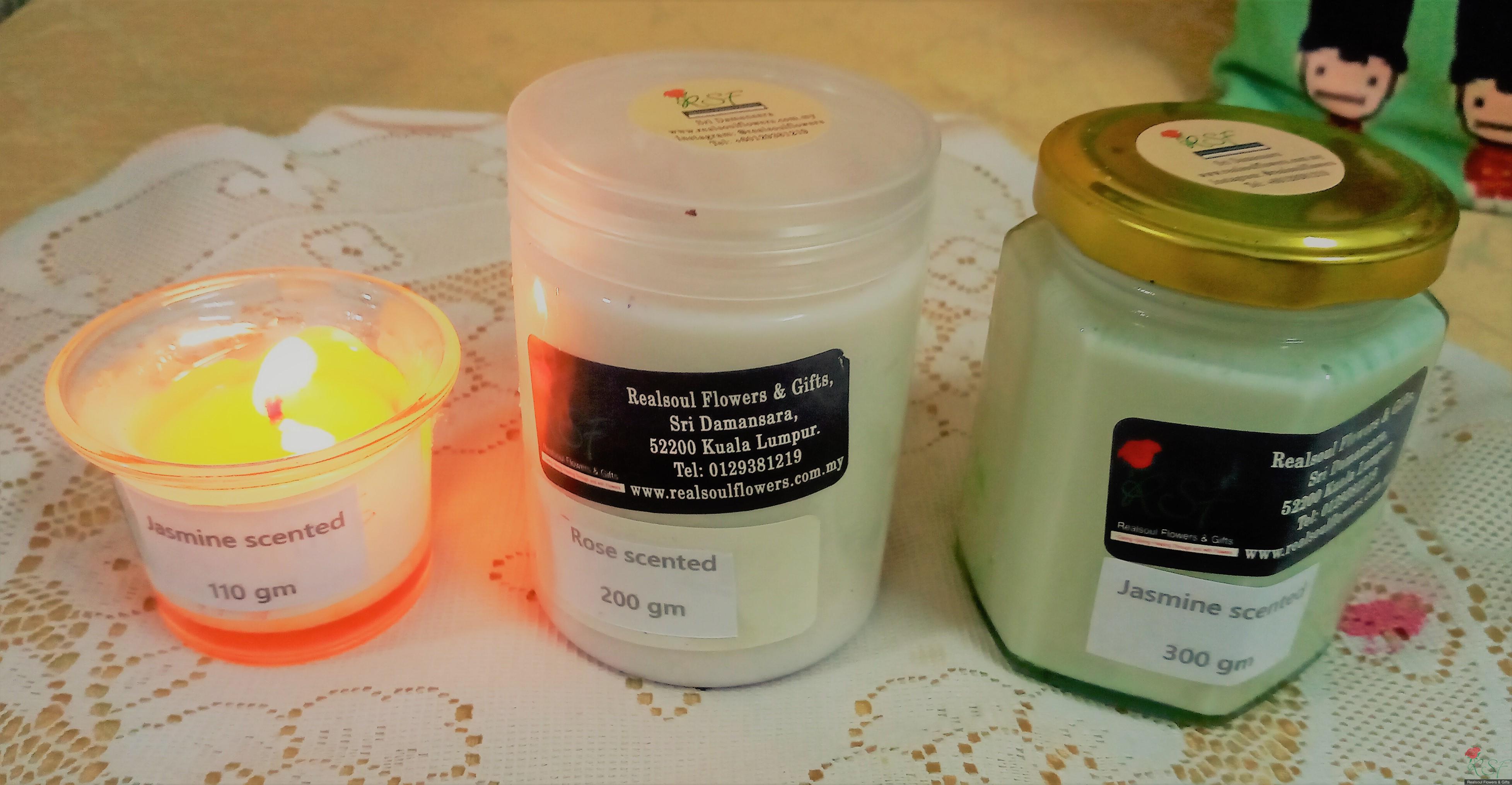 Miscellaneous & Gifts: Our very own RSF jasmine soy wax candles. Ideal as gift item on its own or as part of a floral arrangement add ons. Ships worldwide. This item is placed in a glass jar, 300 g in weight, 8.3 cm height, jasmine scented, 7.1 fluid oz. Candle is coloured light green. Single cotton wick is used. Burning capacity is 65 hours. Jasmine oils are said to have certain benefits such as enliven your minds, alert and make one feels young and alive. We have the smallest candle in 1.4 fluid oz volume. The item can be added to any of our floral arrangement in the form of bouquet/basket/boxed/vase arrangement.