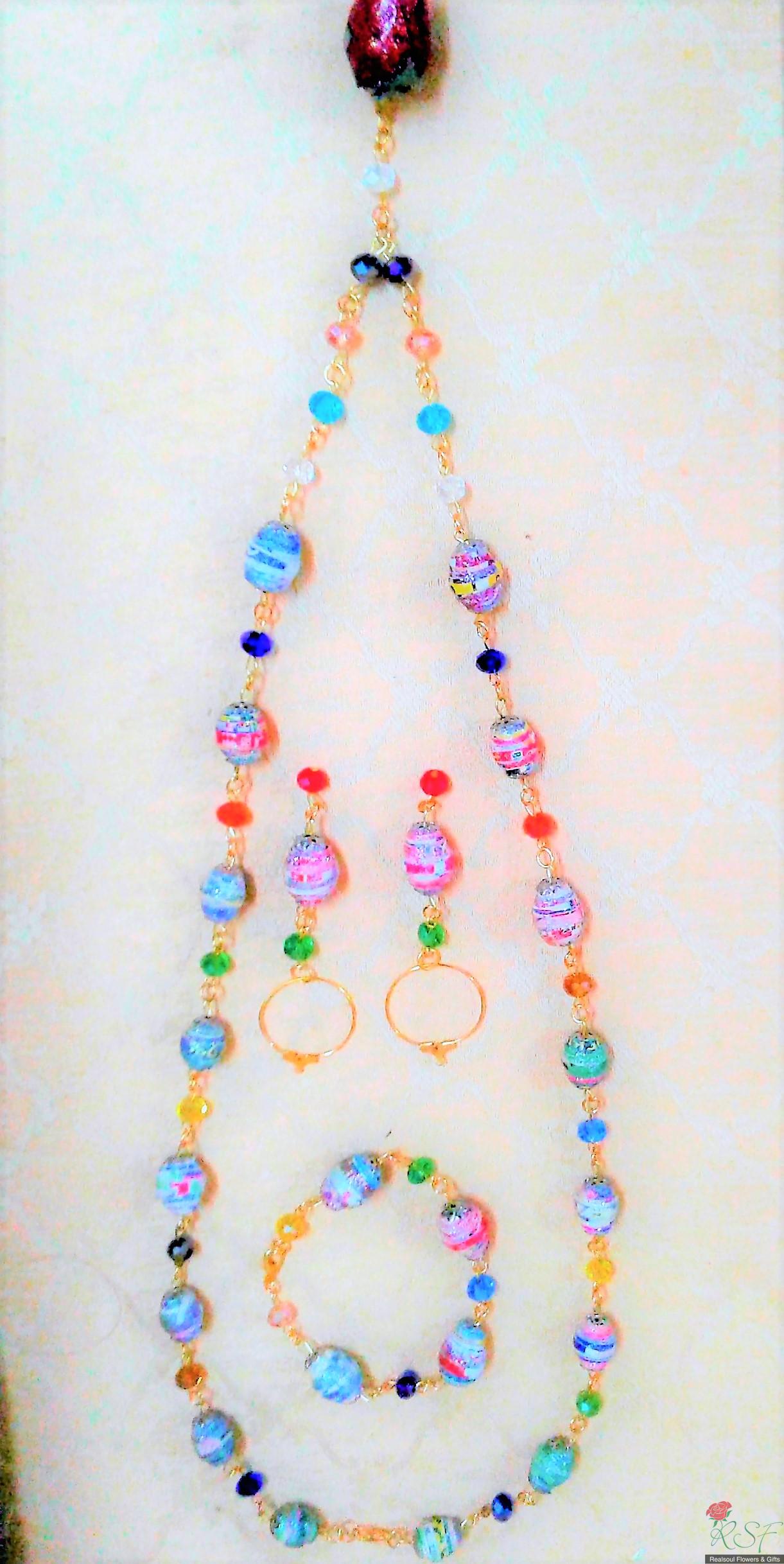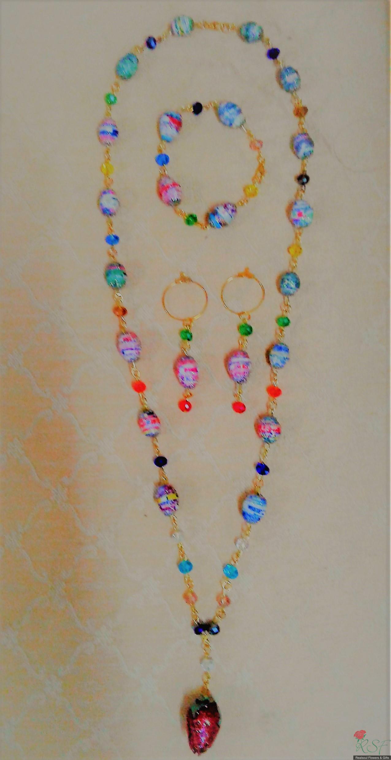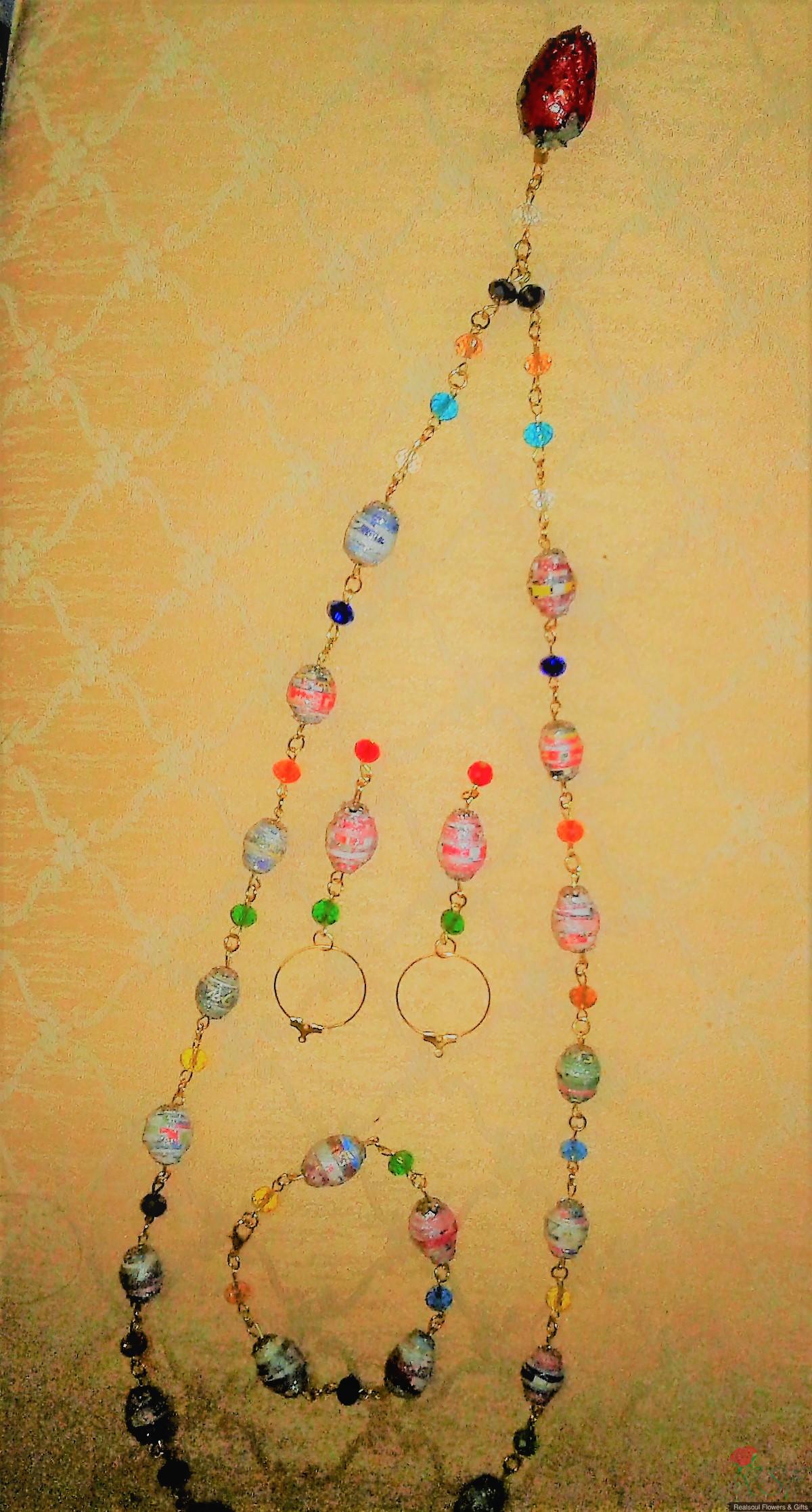 MISCELLANEOUS & GIFTS: This paper beads jewellery set consists of three (3) items namely: 1. Real rose preserved pendant necklace with lobster clasp endings, long size MYR155.00, (2) Bracelets, MYR62.00 & (3) Earring pair, MYR58.00. Suitable for evening or formal wear. SHIP WORLDWIDE.