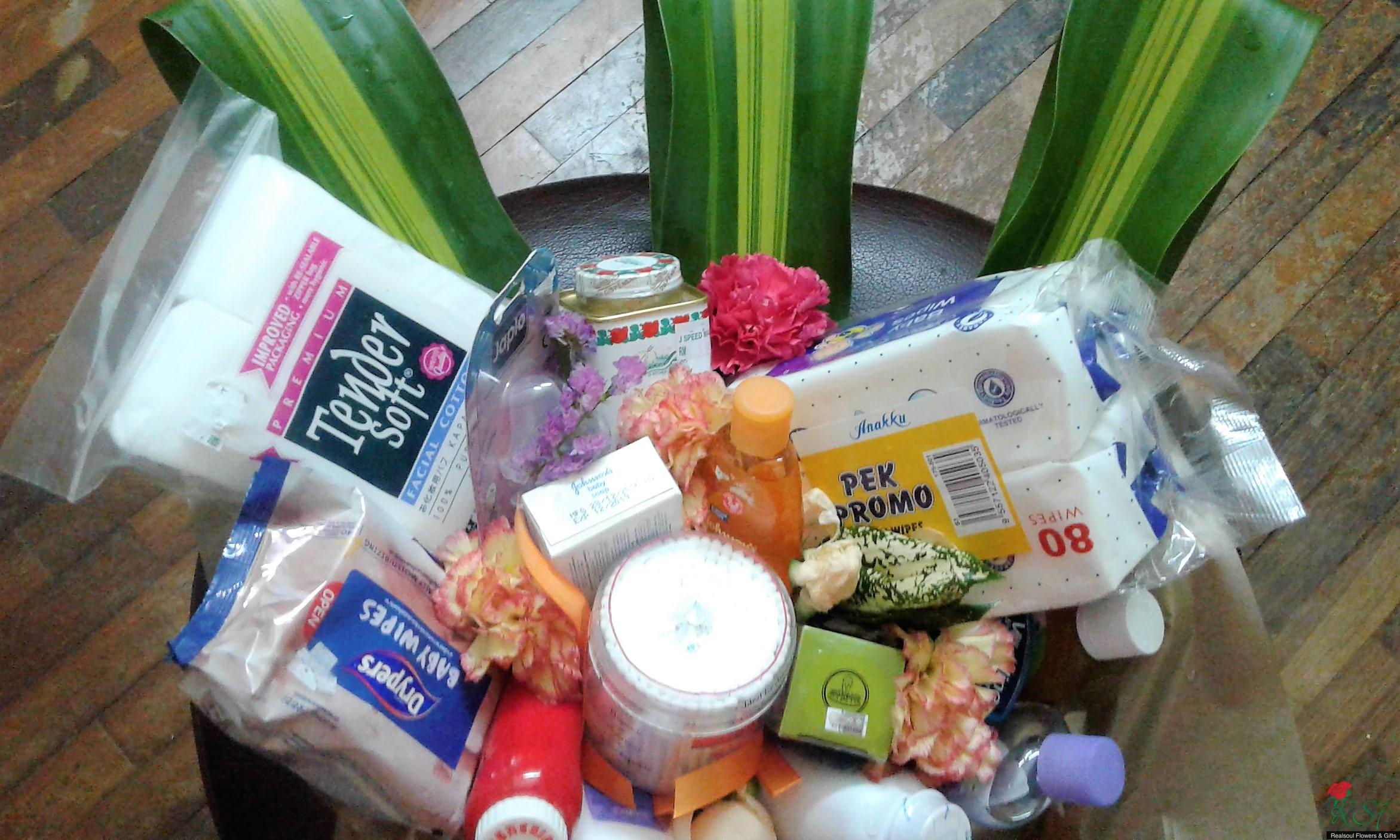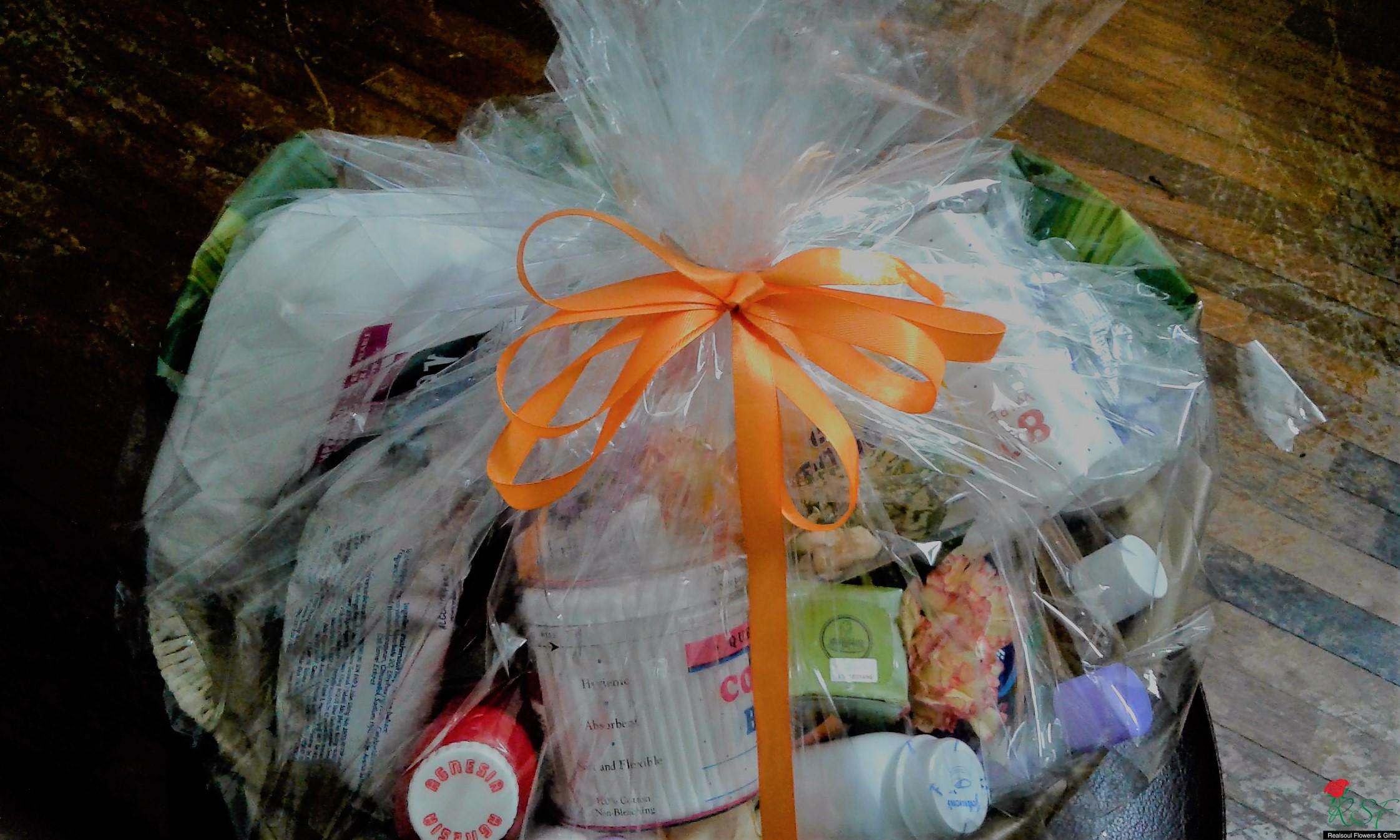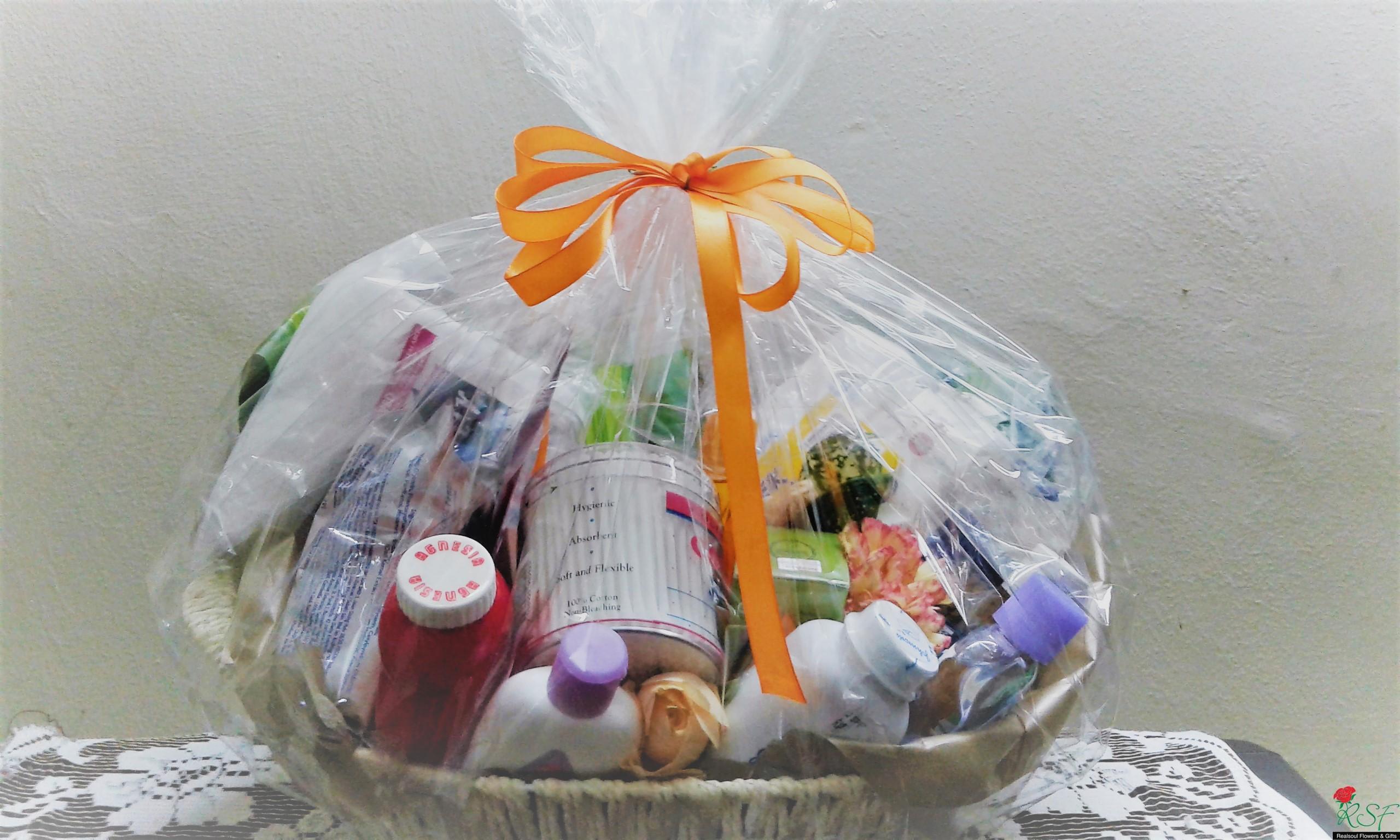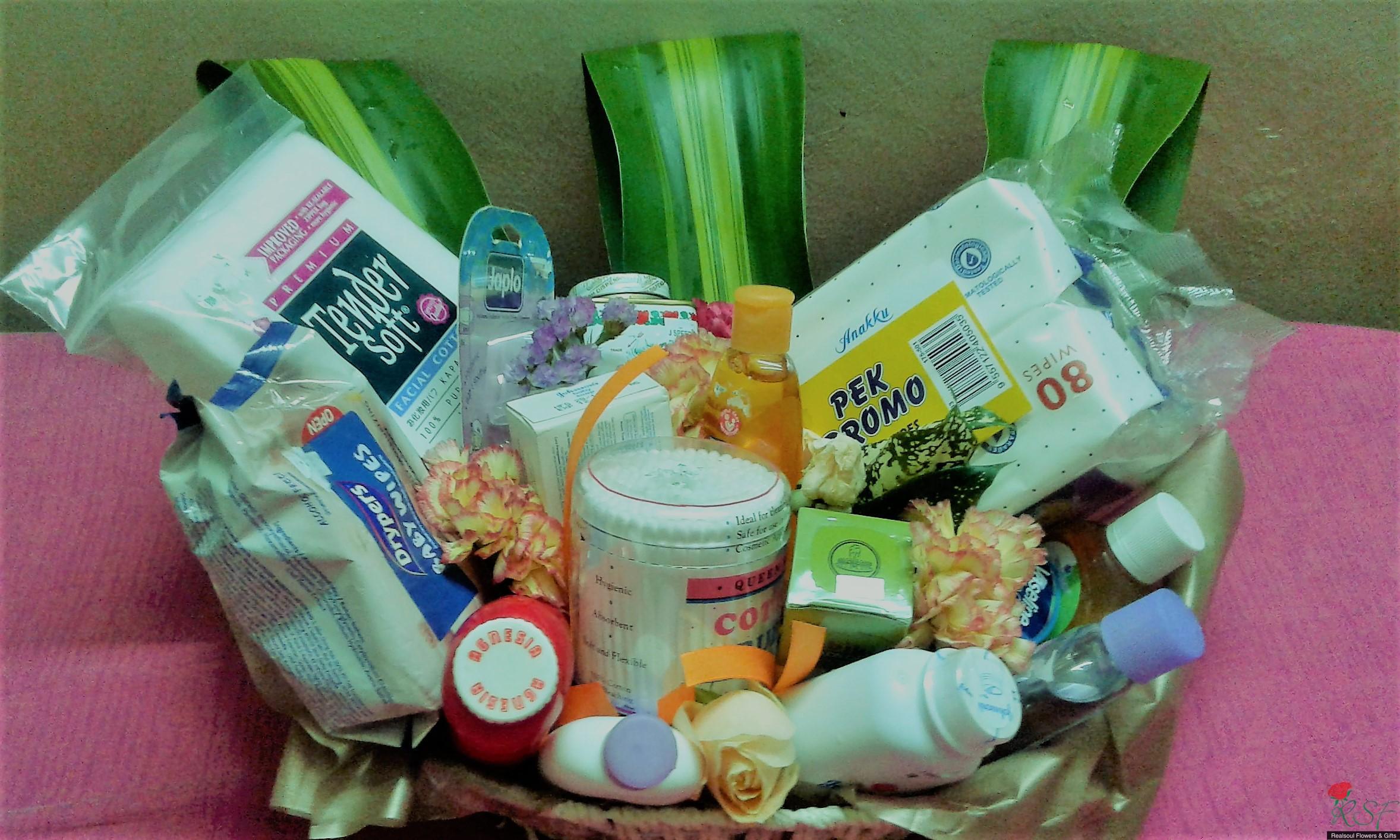New Born : 16 items in the basket and flower decoration. Products arranged can be customised and includes the mother's health care during confinement (health care drinks ect.).