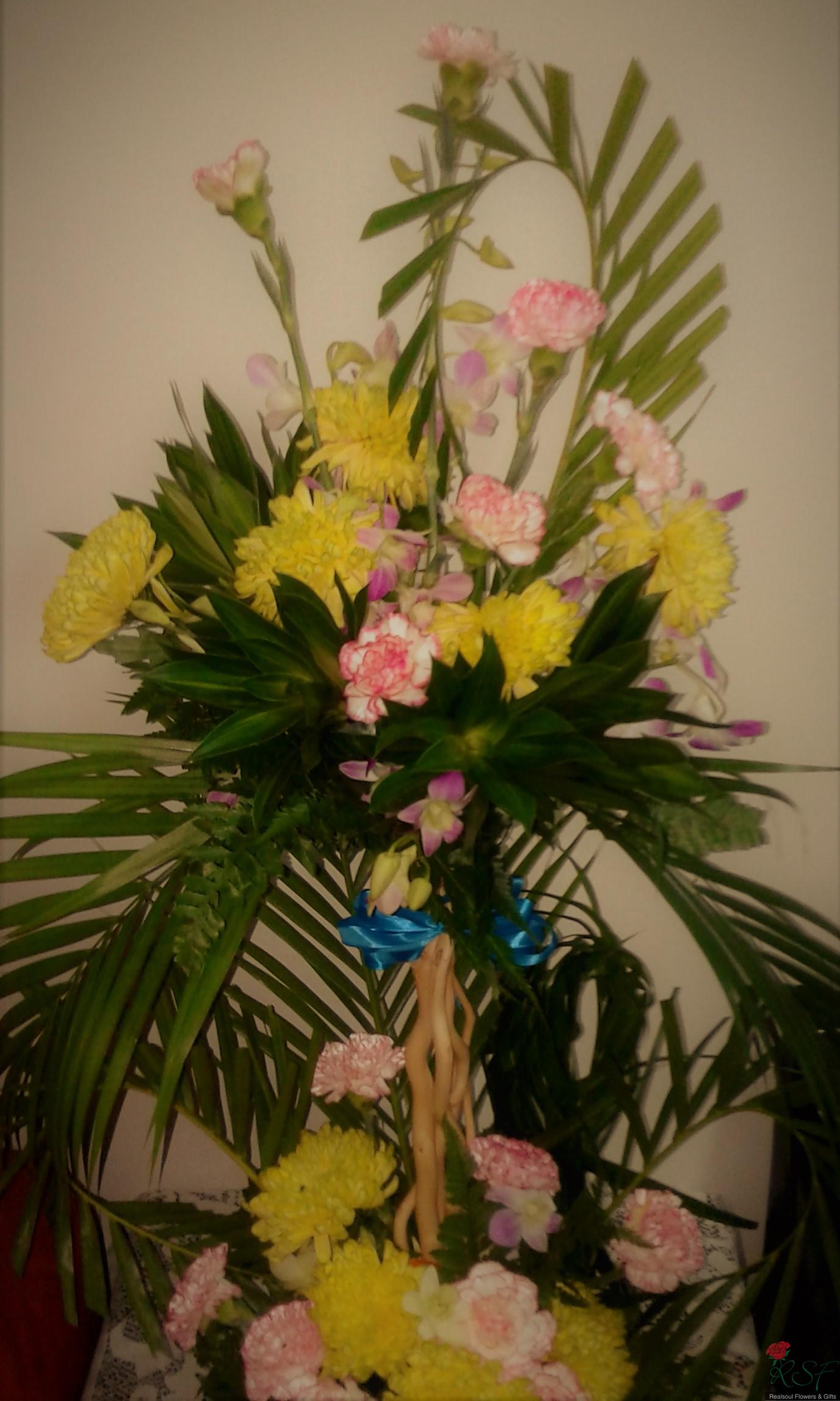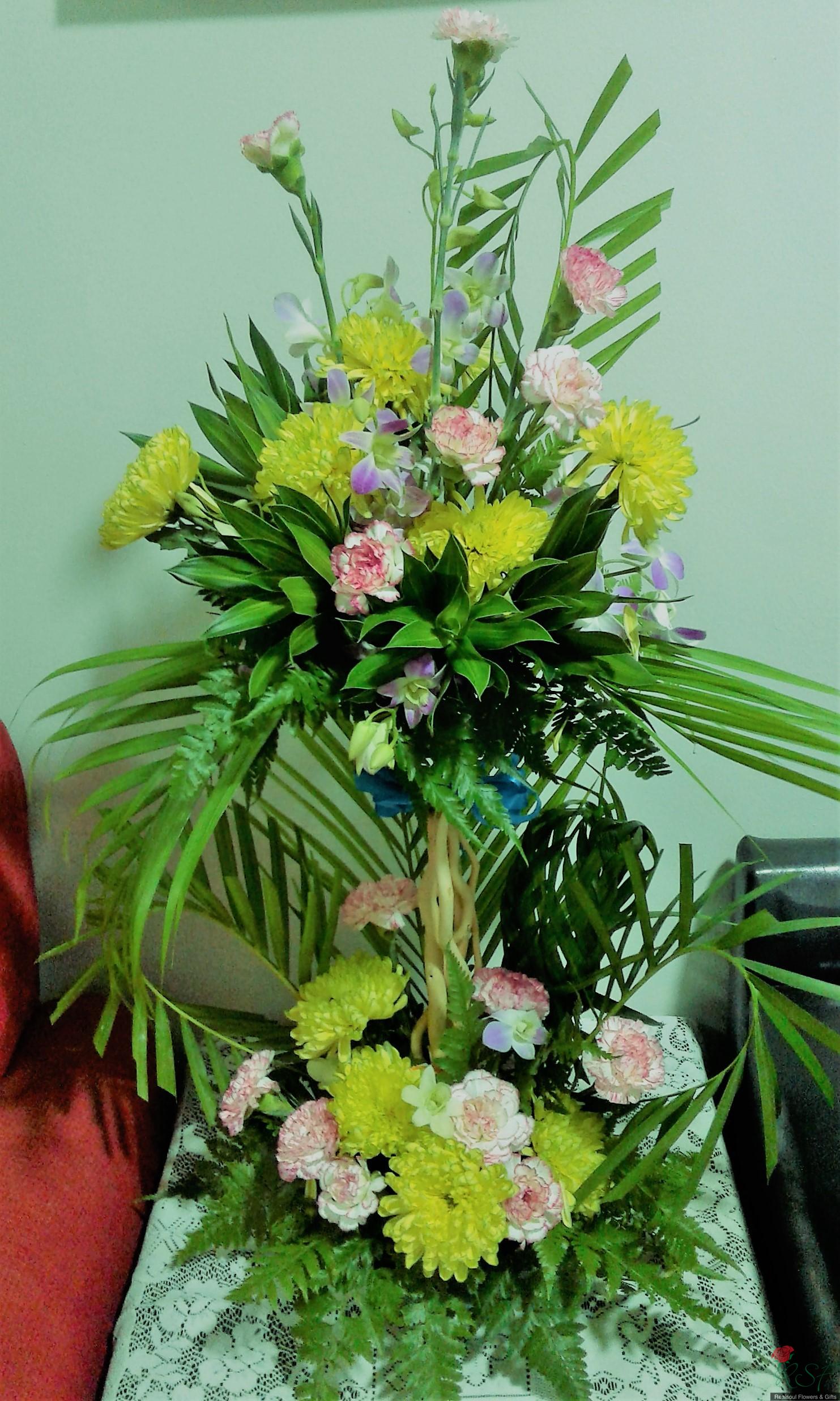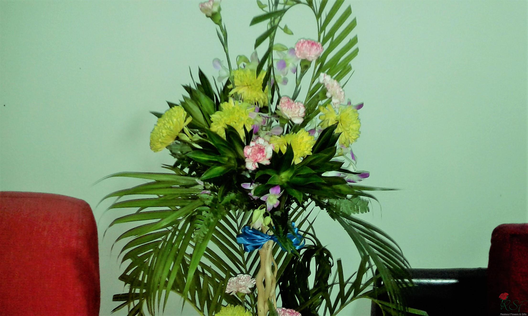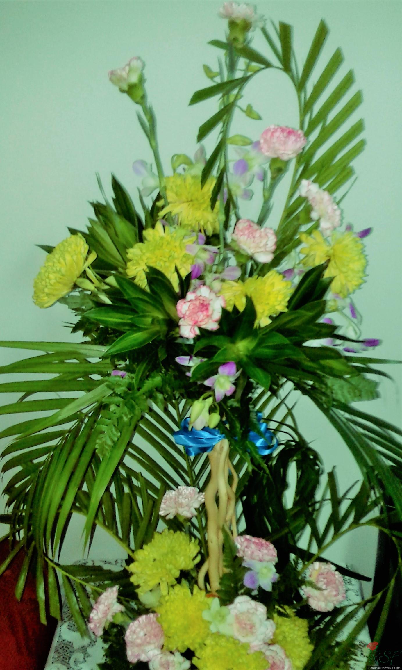 Opening ceremony/hotels: Carnations, chrysanthemums, song of jamaica, dendrobium orchids, palm leaves, and ferns in a tall arrangement suitable for wall, hallway or even low table.