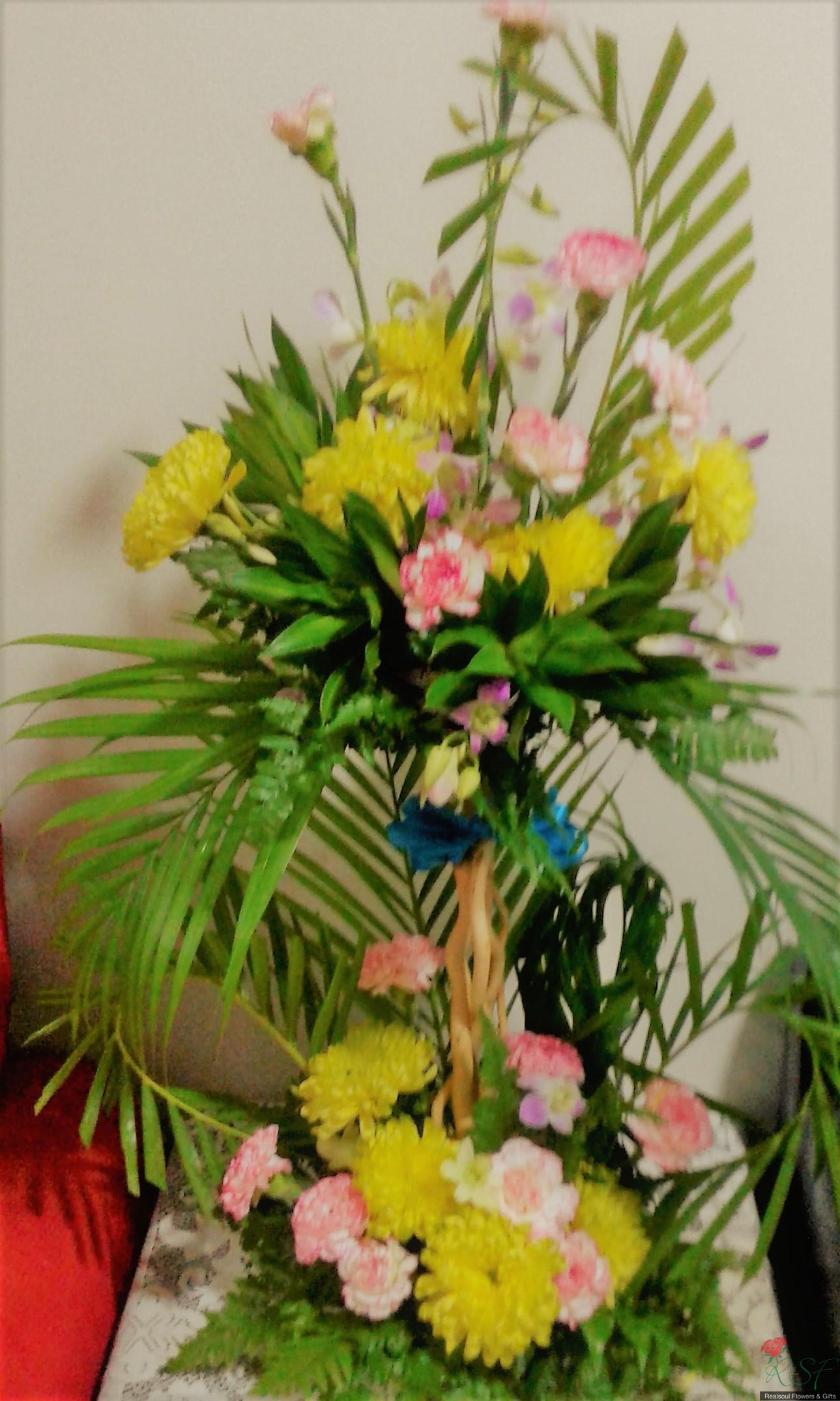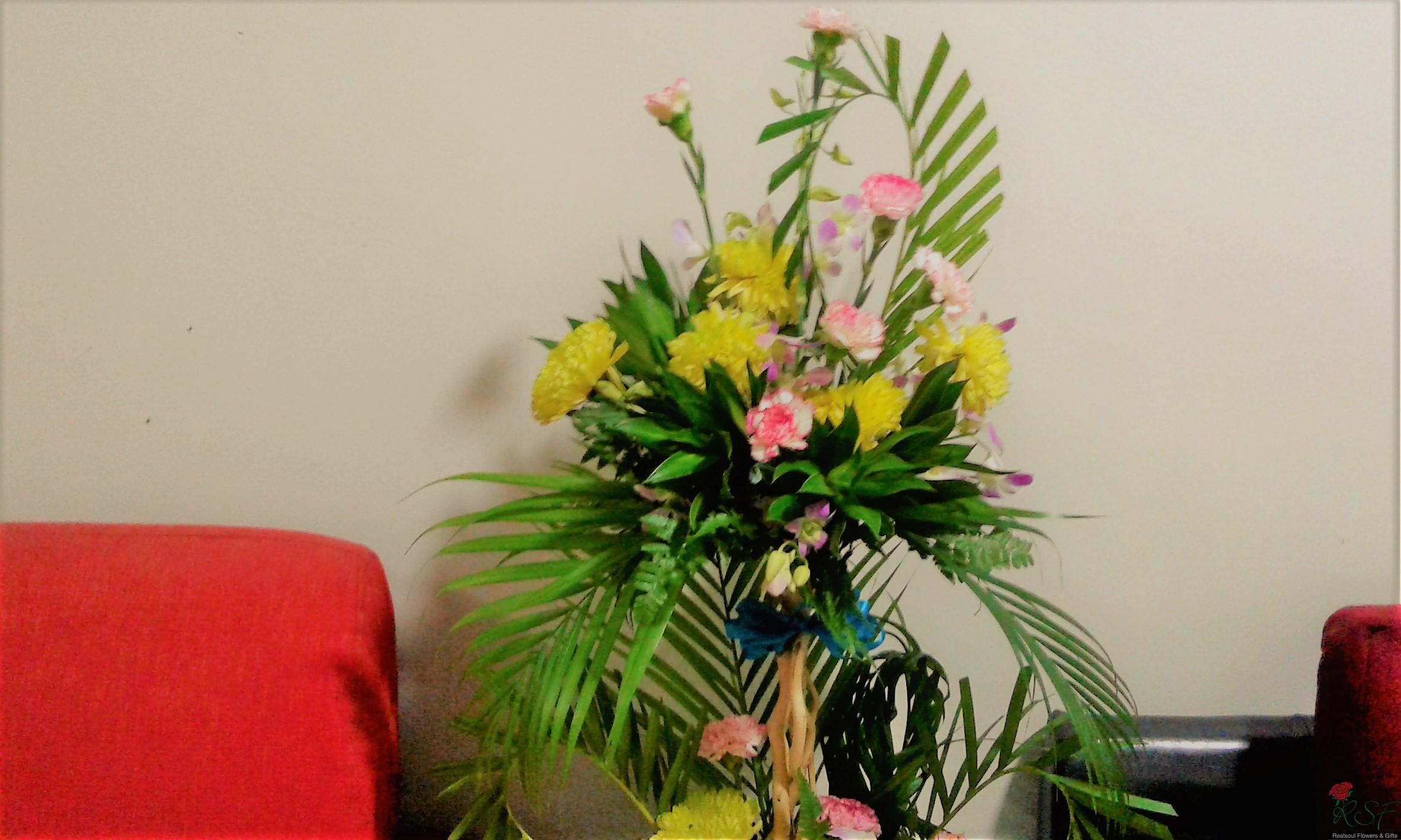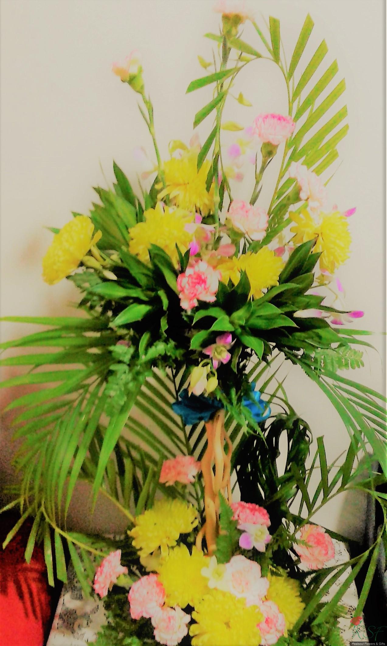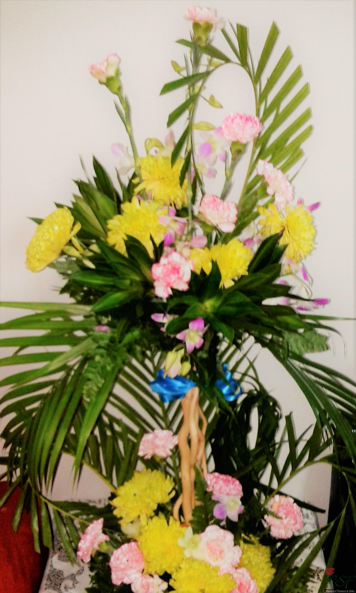 Opening ceremony/hotels: Carnations, chrysanthemums, song of jamaica, dendrobium orchids, palm leaves, and ferns in a tall arrangement suitable for wall, hallway or even low table.
