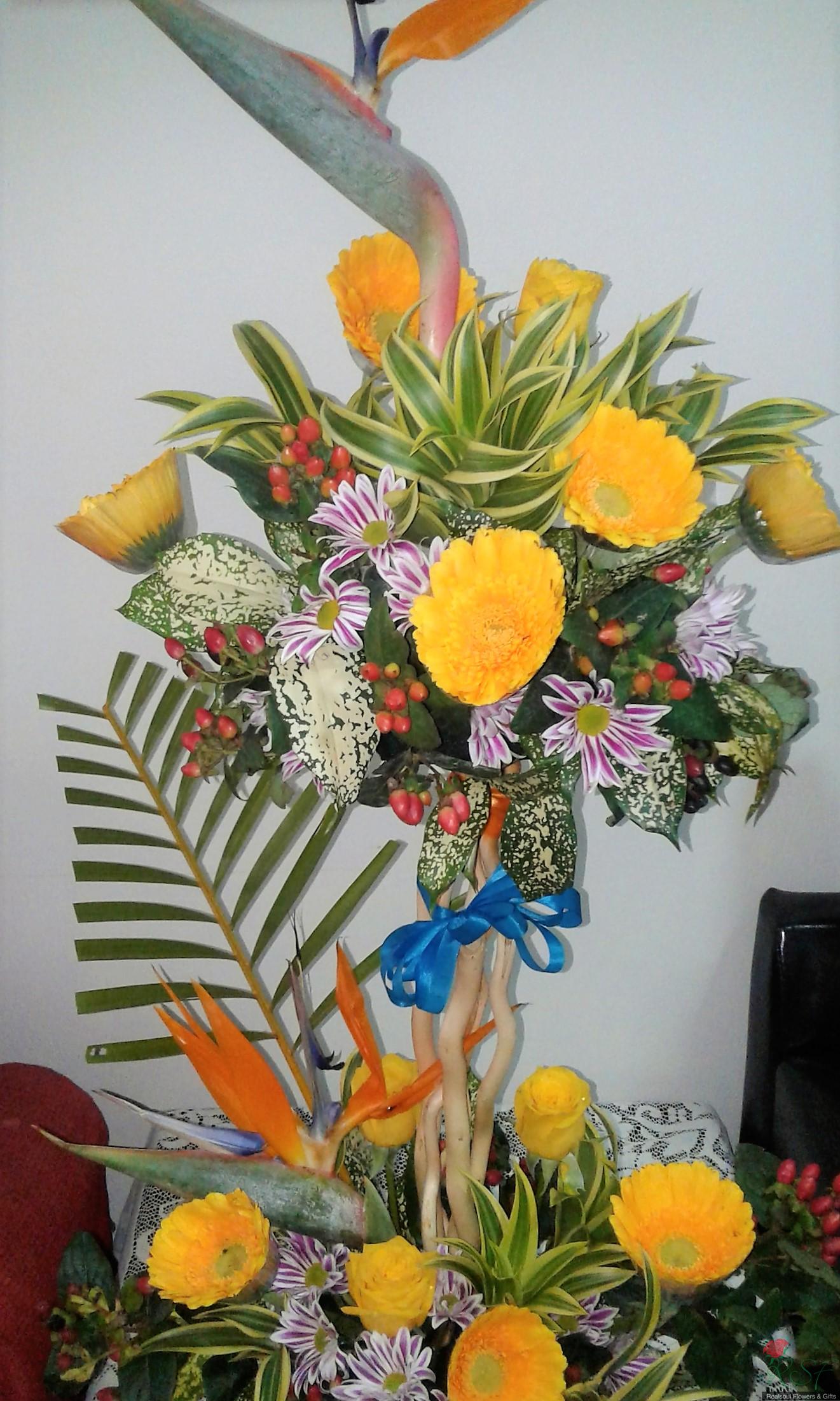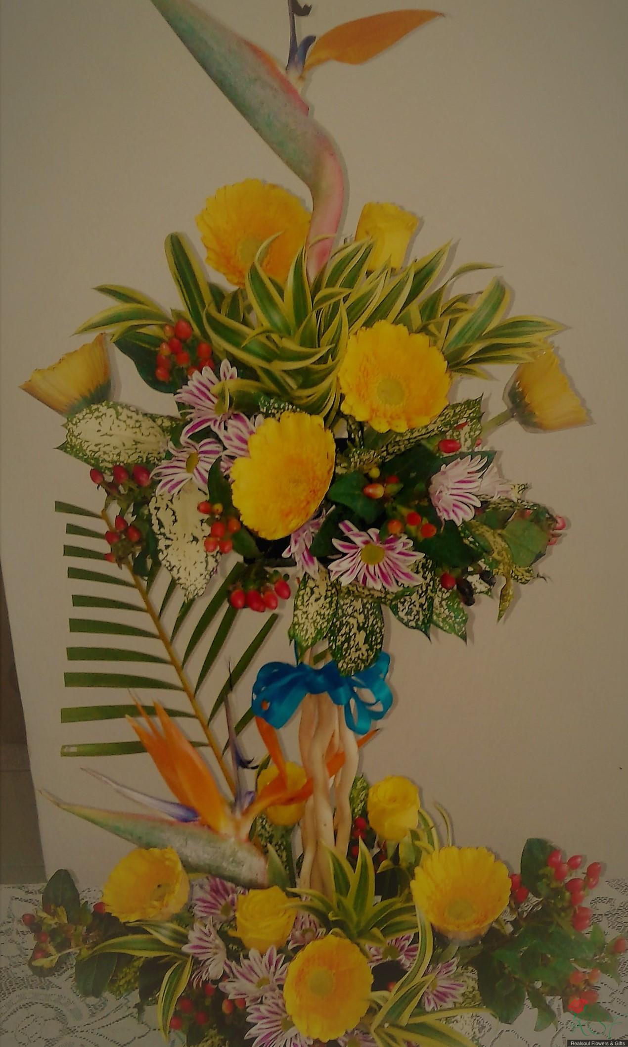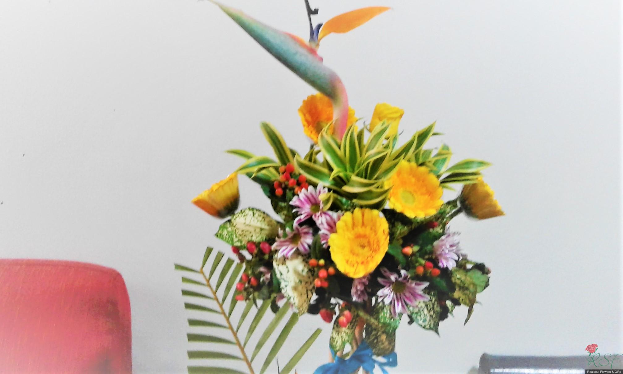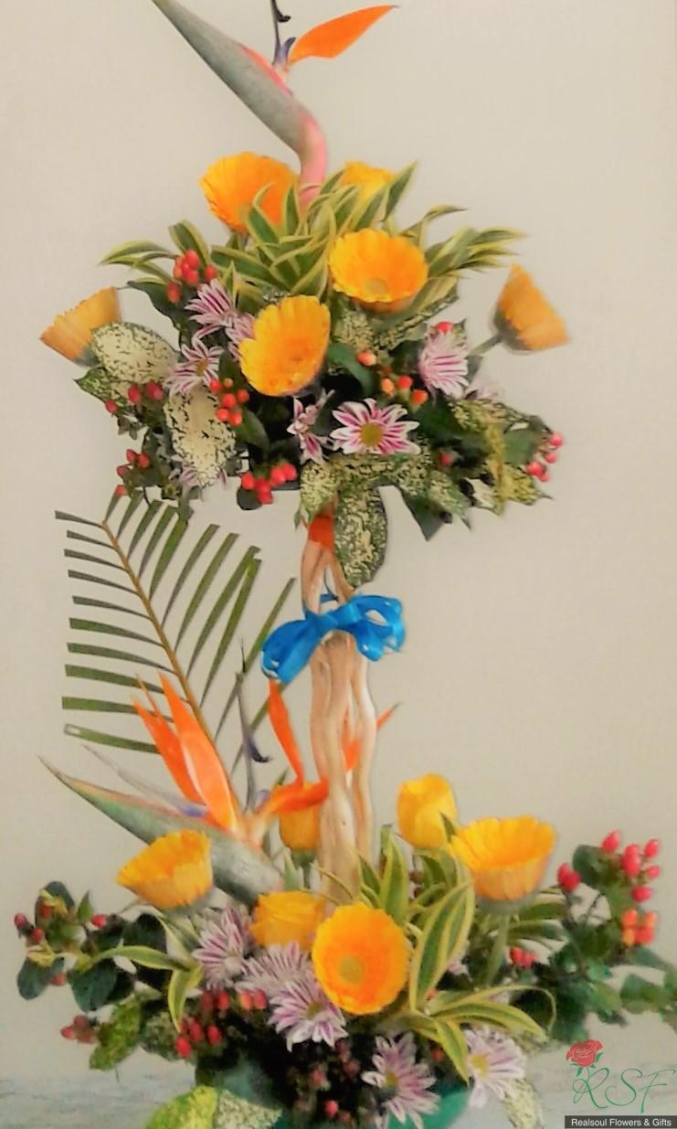 OPCH108- Topiary style arrangement for hallway/ wall decor (Rekaan topiary dengan daisi gerbera dan bird of paradise) SHIP TO MALAYSIA ONLY