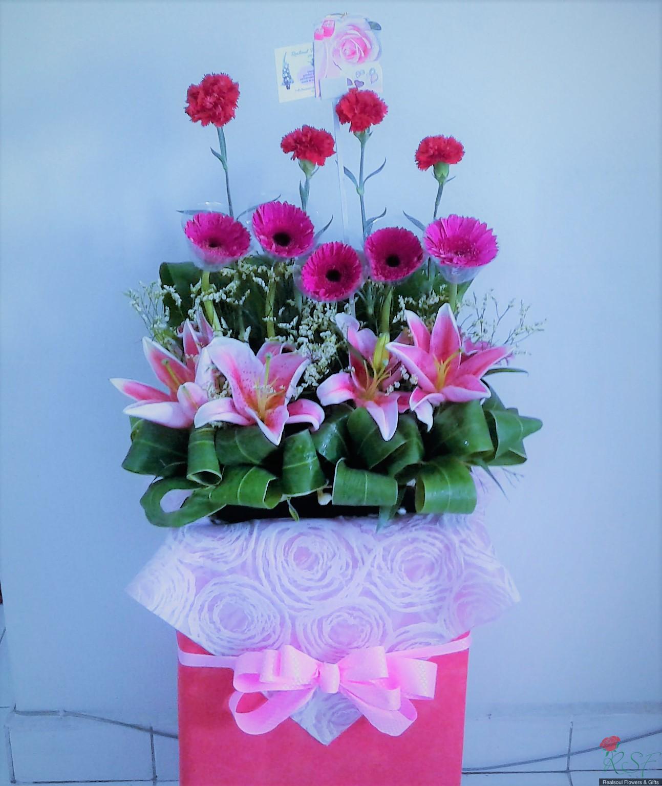 Opening ceremony/hotels: Gerbera daisies, carnations, lilies, cordyline leaves, song of jamaica and fillers on a deco box. Suitable for night decoration.