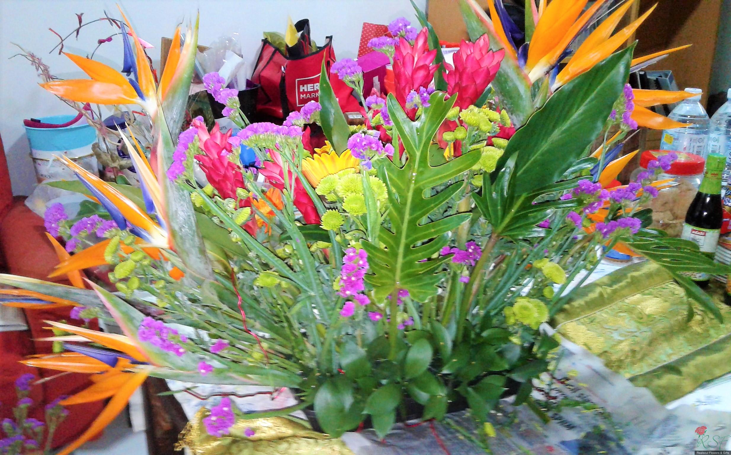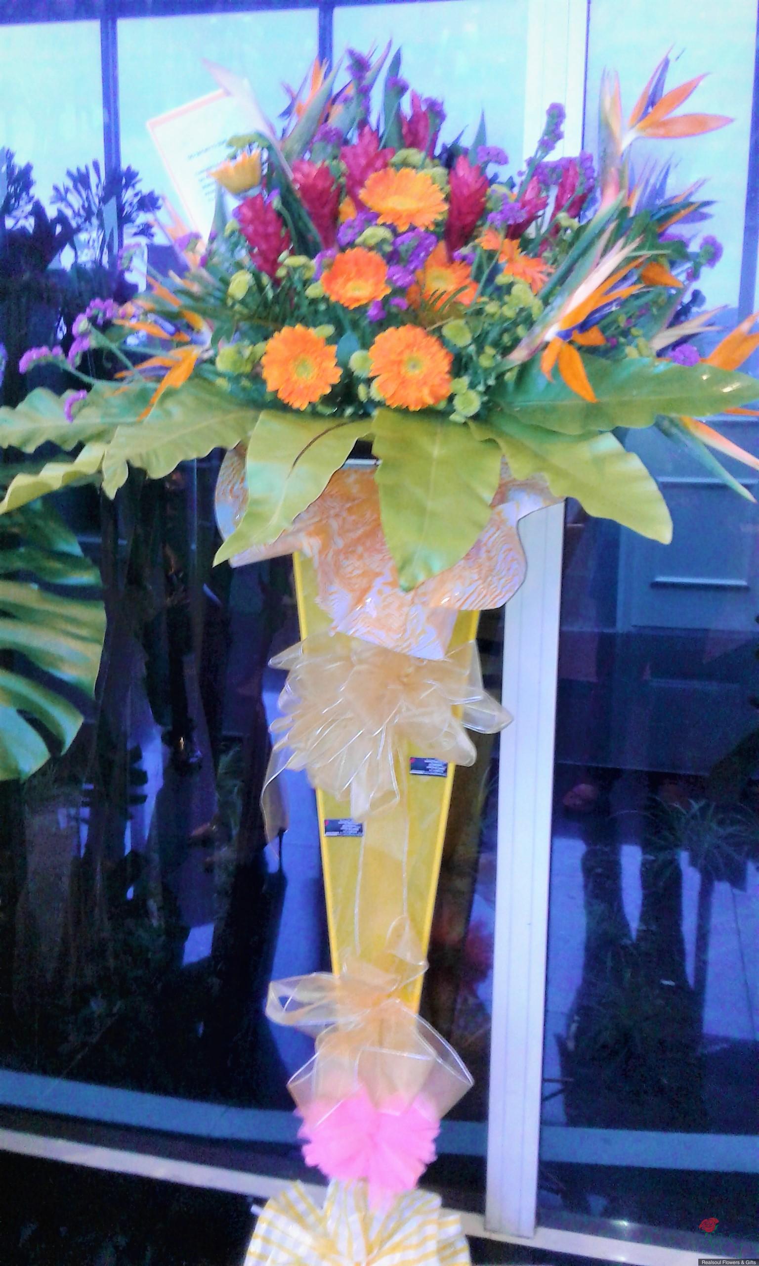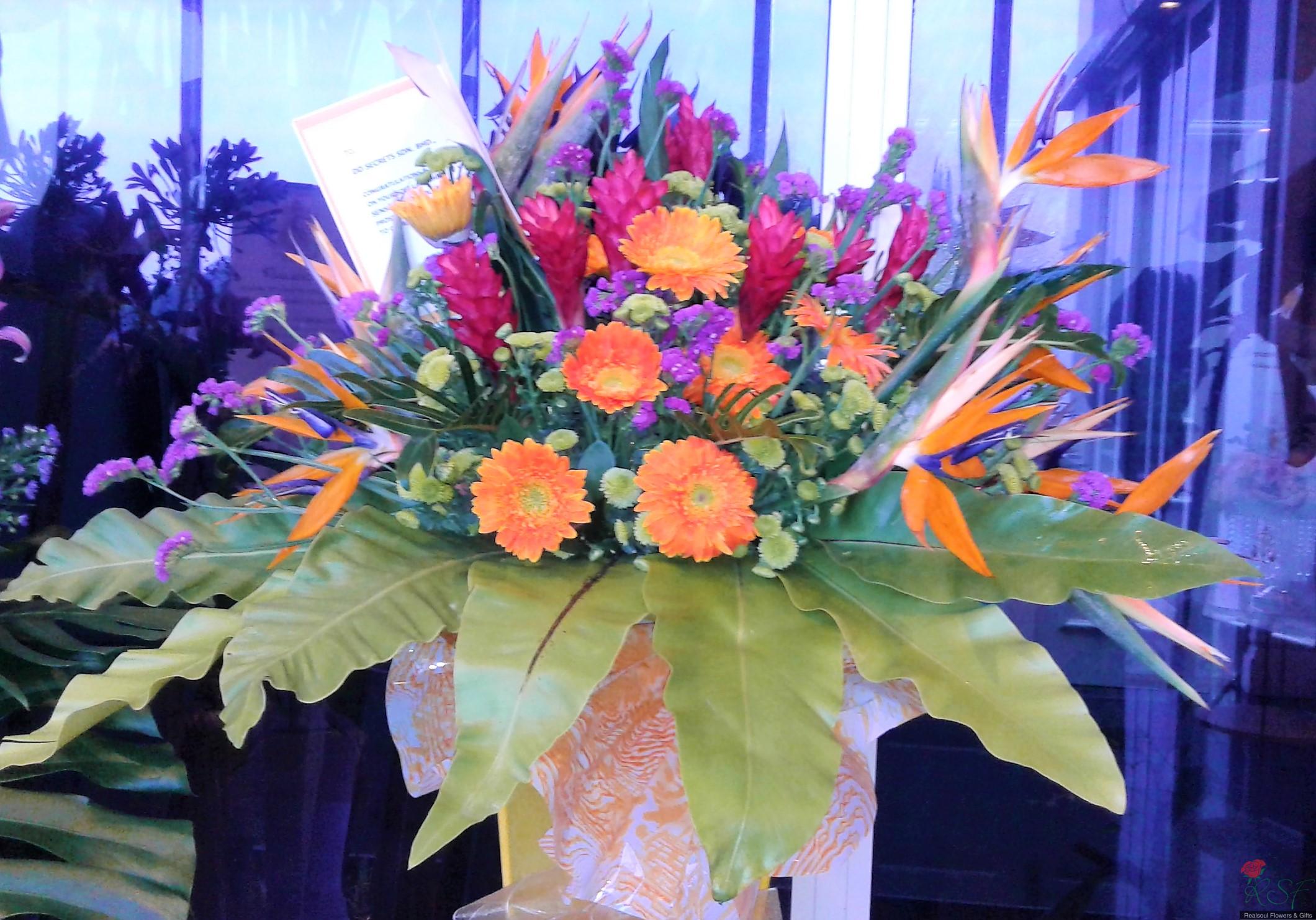 Opening Ceremony/ Hotel Flowers: This arrangement is recently designed for a client for a product launching event in Bukit Kiara Sime Darby Convention Centre. The design consists of orange yellow theme to liven up the occasion. The design consists of bird of paradise, ginger flowers, gerbera daisies, green button pom poms, statice and several green foliages, dragon leaves, ruscus and birds nest.