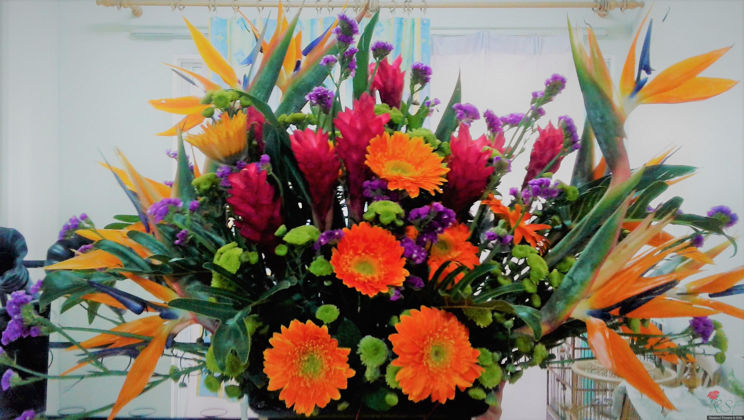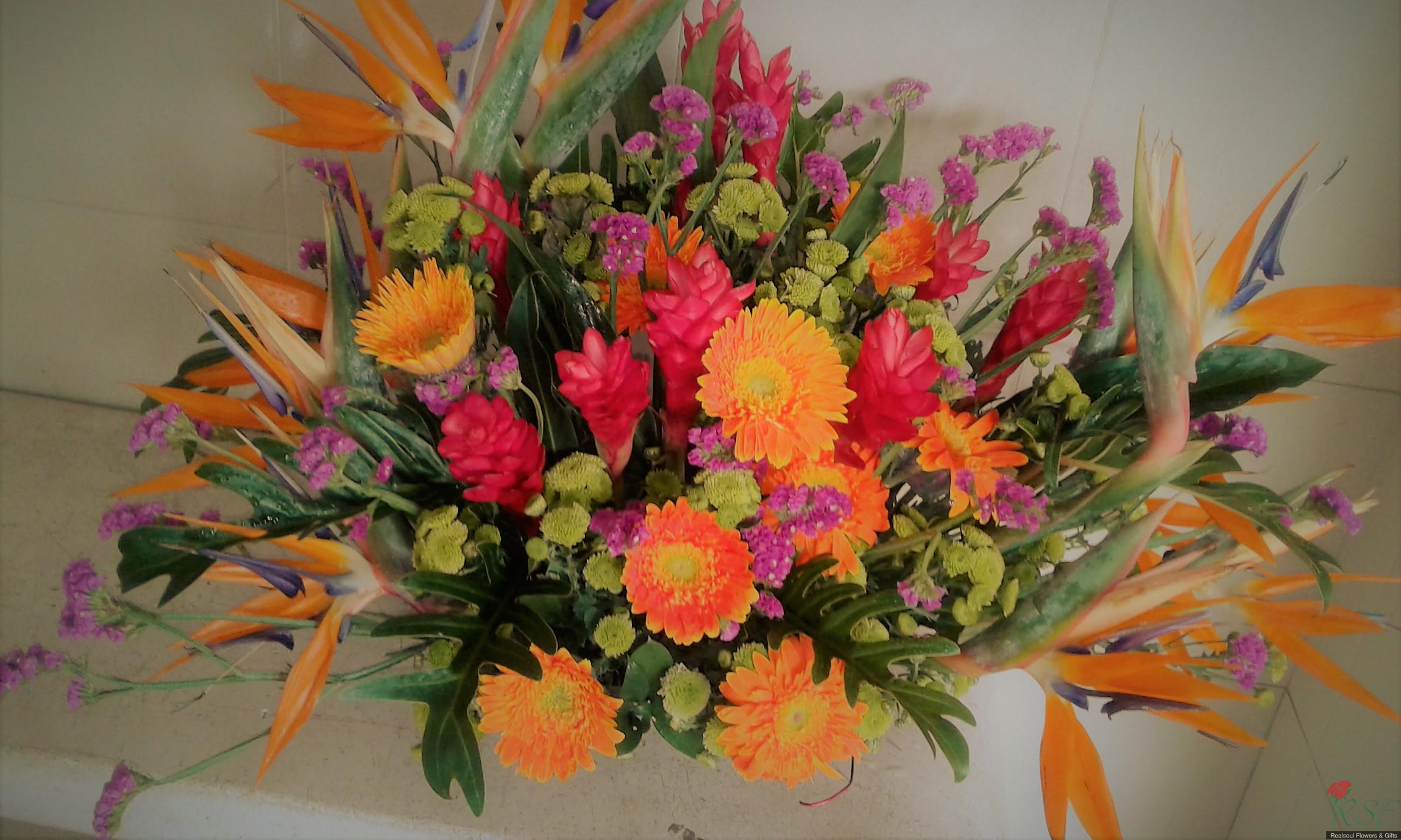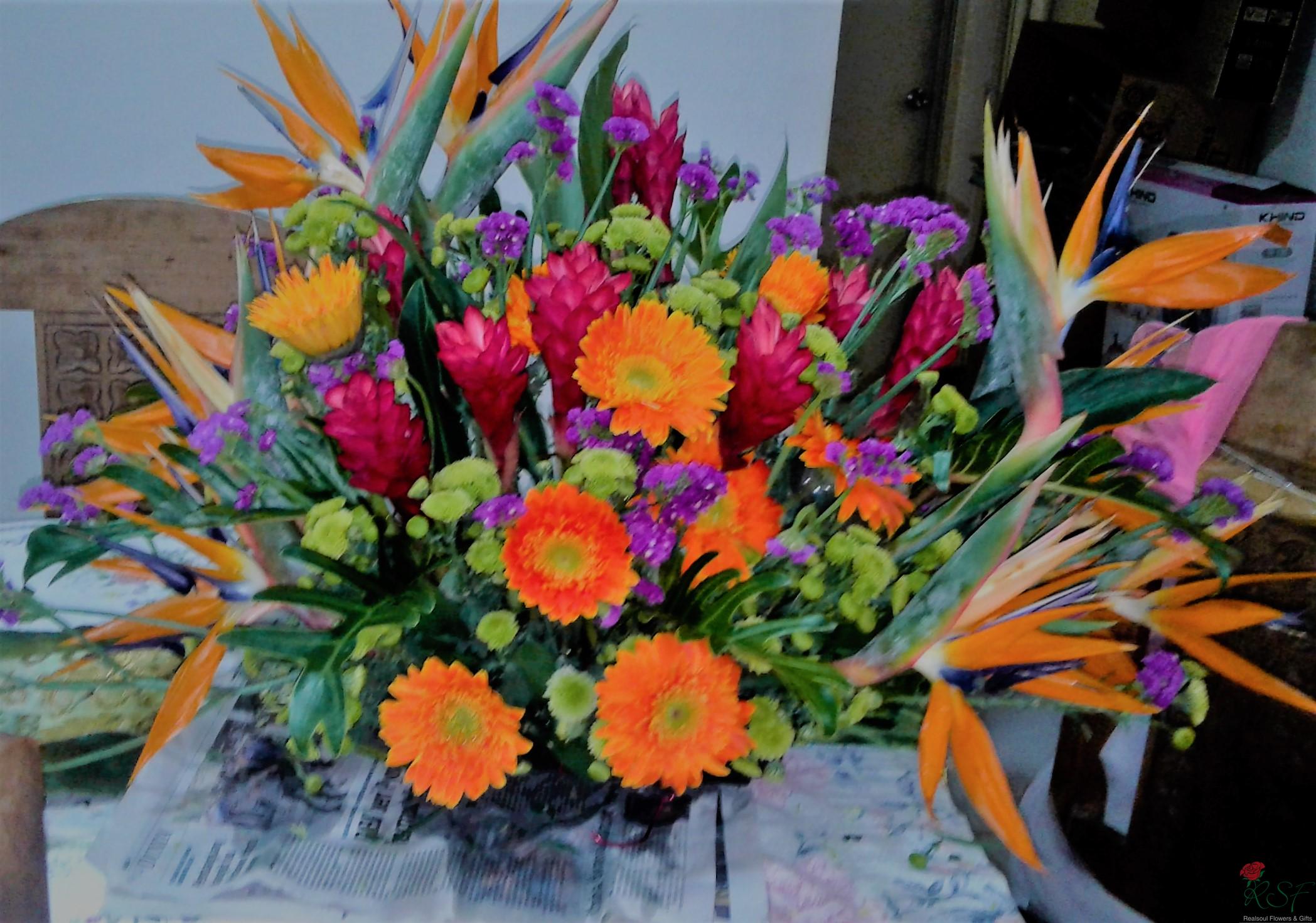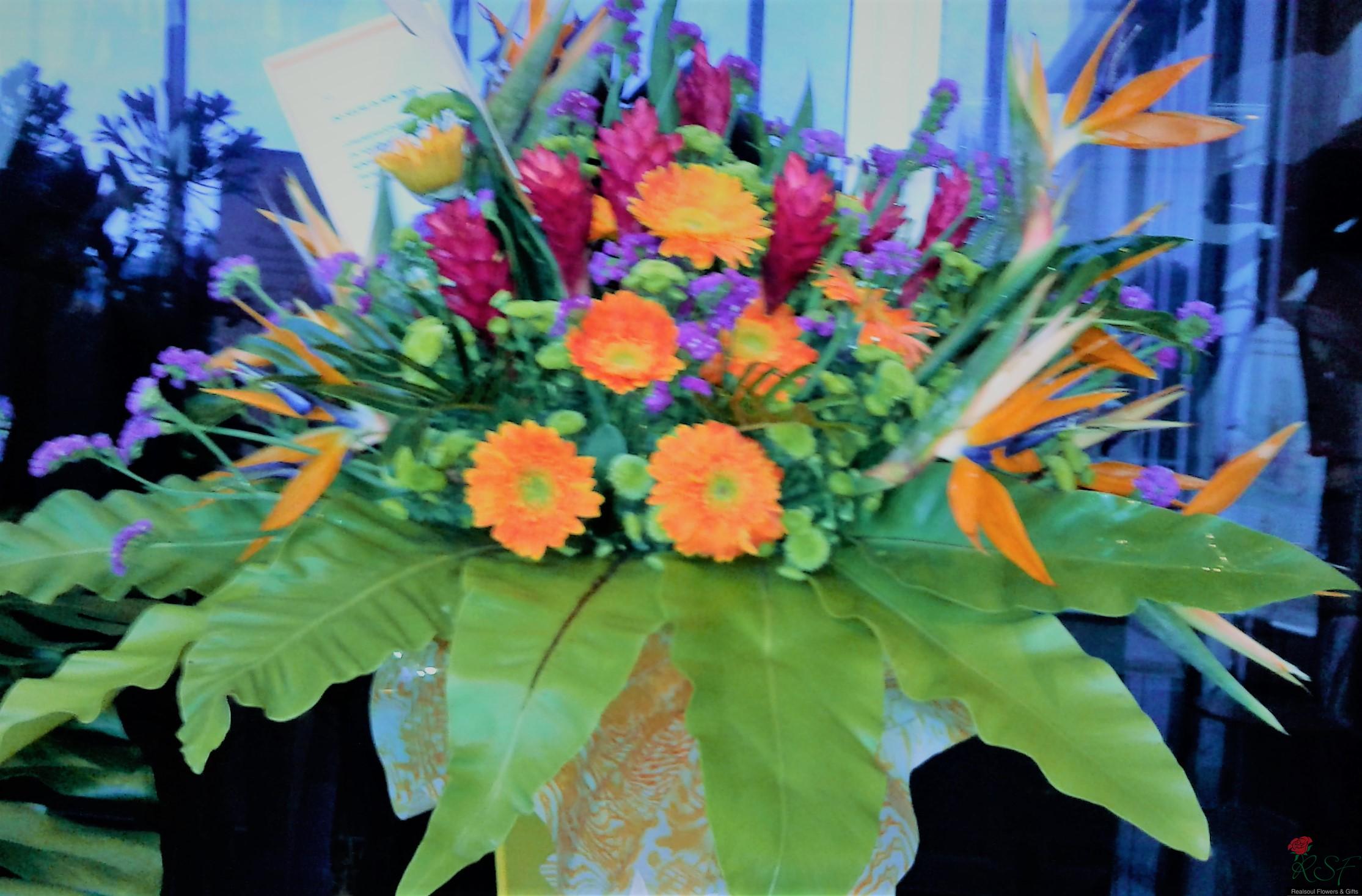 Opening Ceremony/ Hotel Flowers: This arrangement is recently designed for a client for a product launching event in Bukit Kiara Sime Darby Convention Centre. The design consists of orange yellow theme to liven up the occasion. The design consists of bird of paradise, ginger flowers, gerbera daisies, green button pom poms, statice and several green foliages, dragon leaves, ruscus and birds nest.