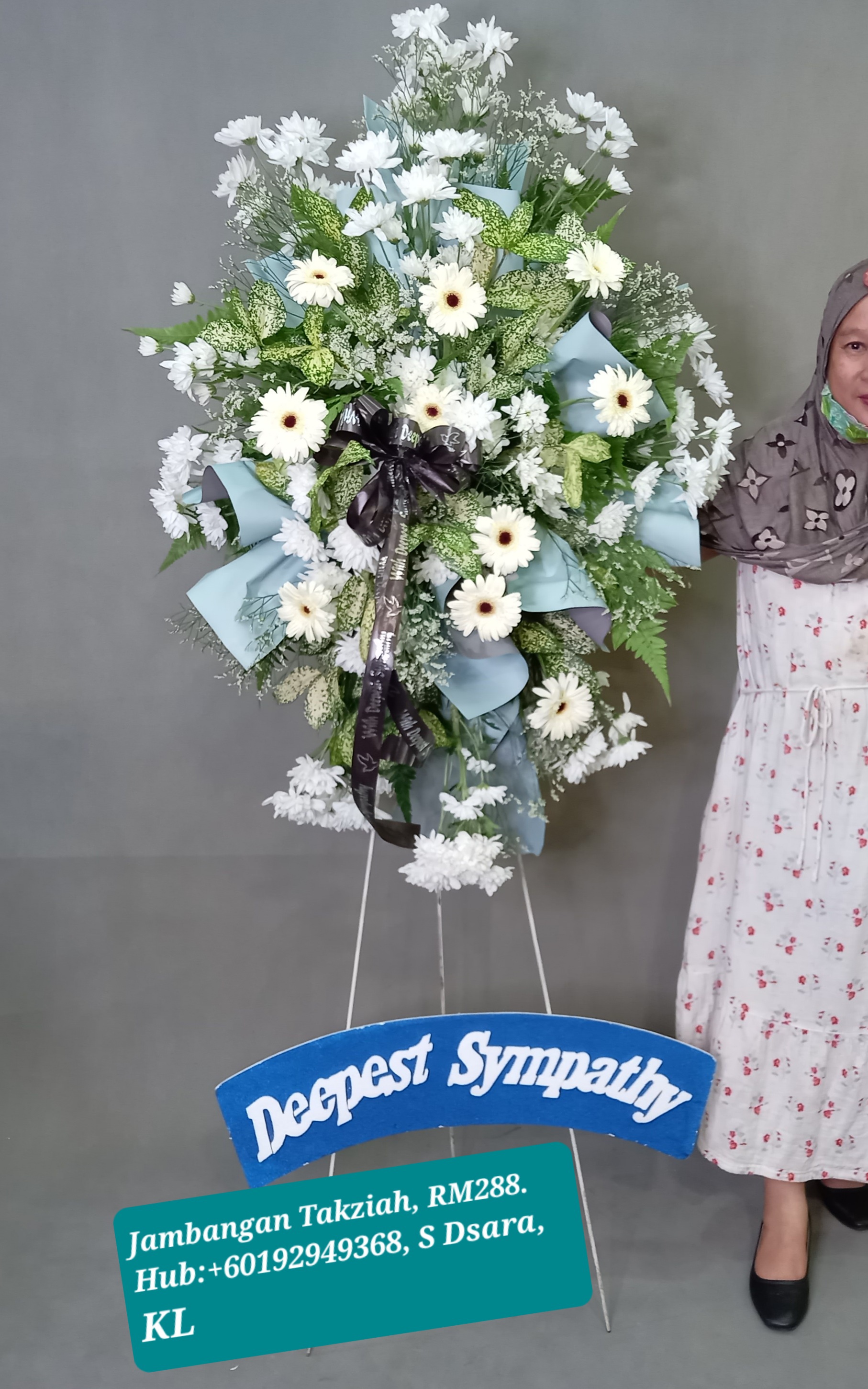 THIS FUNERAL ARRANGEMENT OF OVAL SHAPED ON A STAND USES 3 MAJOR FRESH FLOWERS NAMELY: WHITE GERBERA DAISIES, WHITE CHRYSANTHEMUM POMPOMS, CASPIA AND 2 KINDS OF GREEN FOLIAGES WITH WRAPPING PAPER DECOR. IT STANDS AT MORE THAN FIVE FEET TALL.