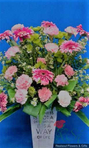Vase arrangement: Pink carnations, gerbera daisies, green pompons, fillers, foliage and medium high ceramic vase.