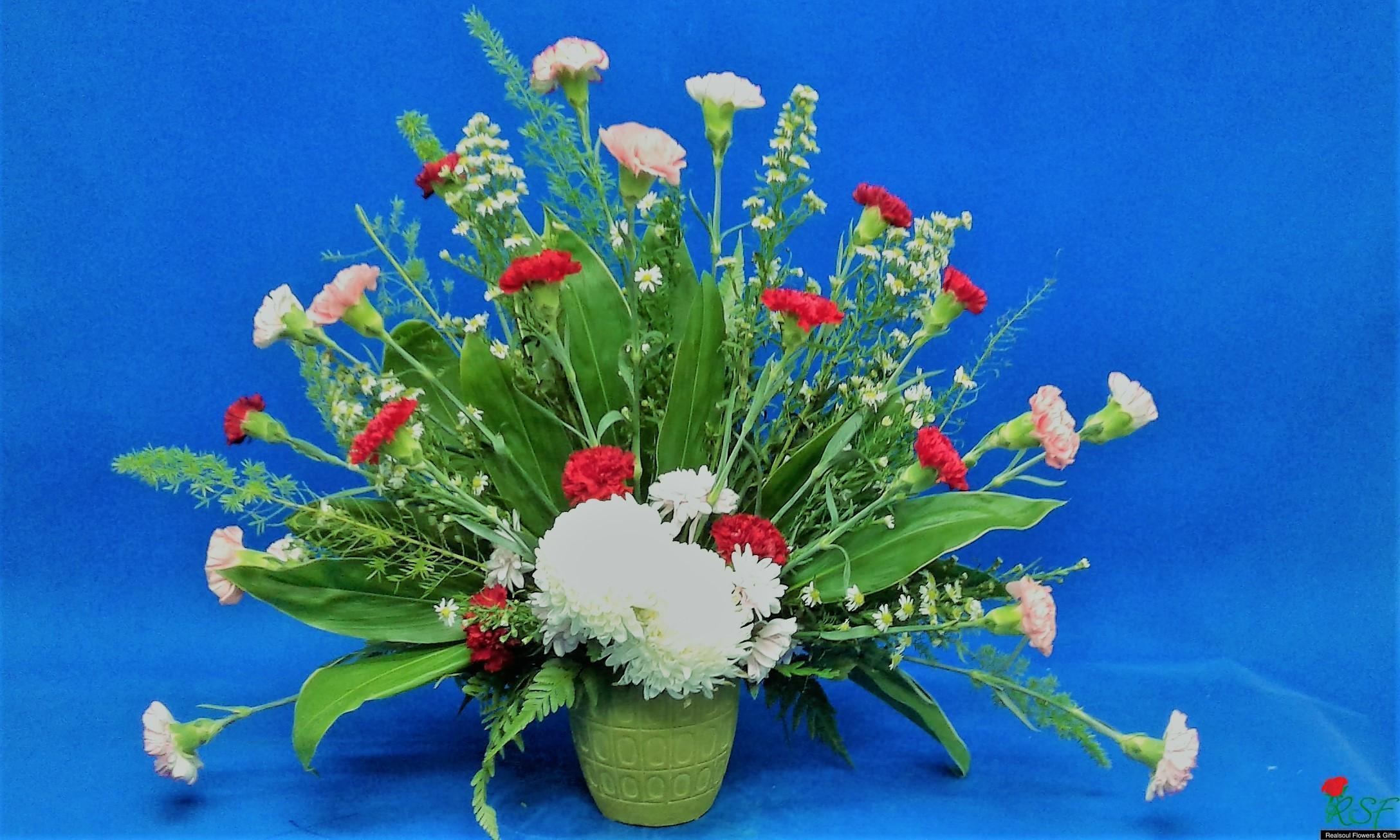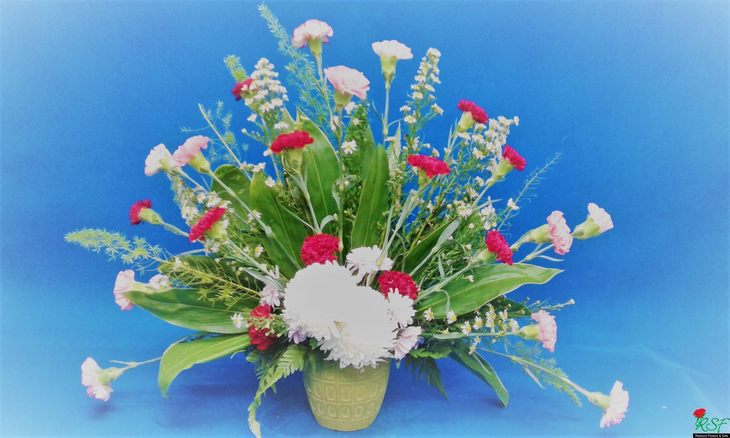 Vase arrangement: Carnations, chrysanthemums, statice, peacock, pompoms and foliage in a ceramic vase. Suitable for 'get well soon' gift or as a living room decor or birthday gift.