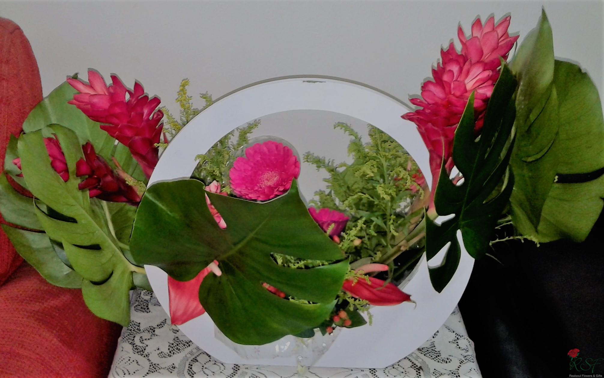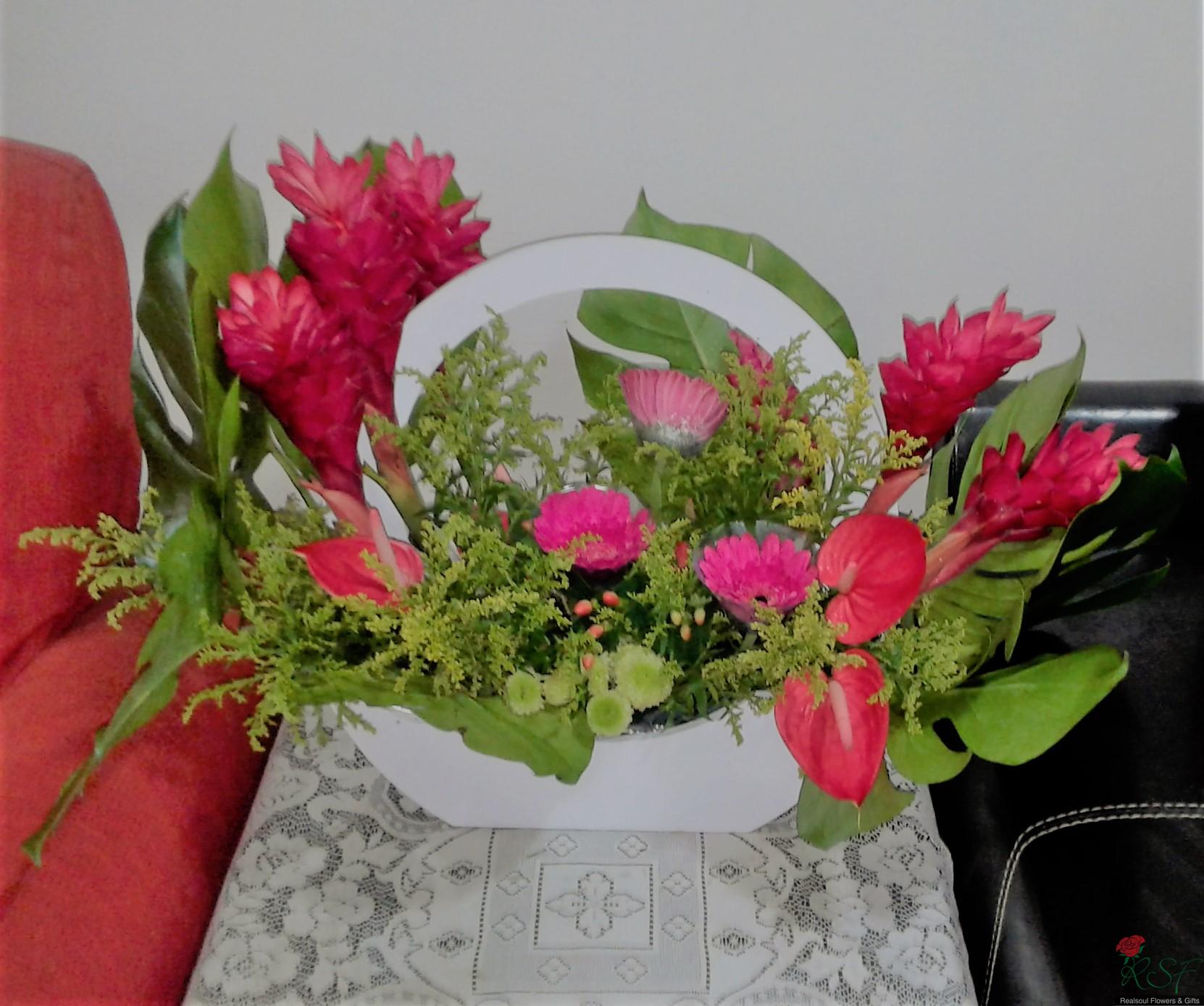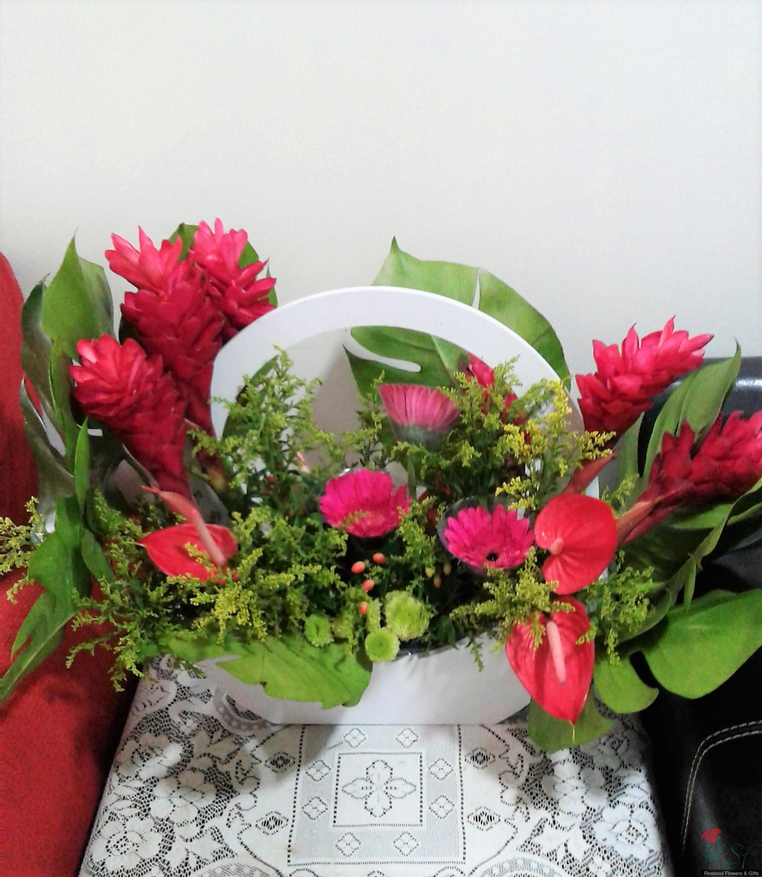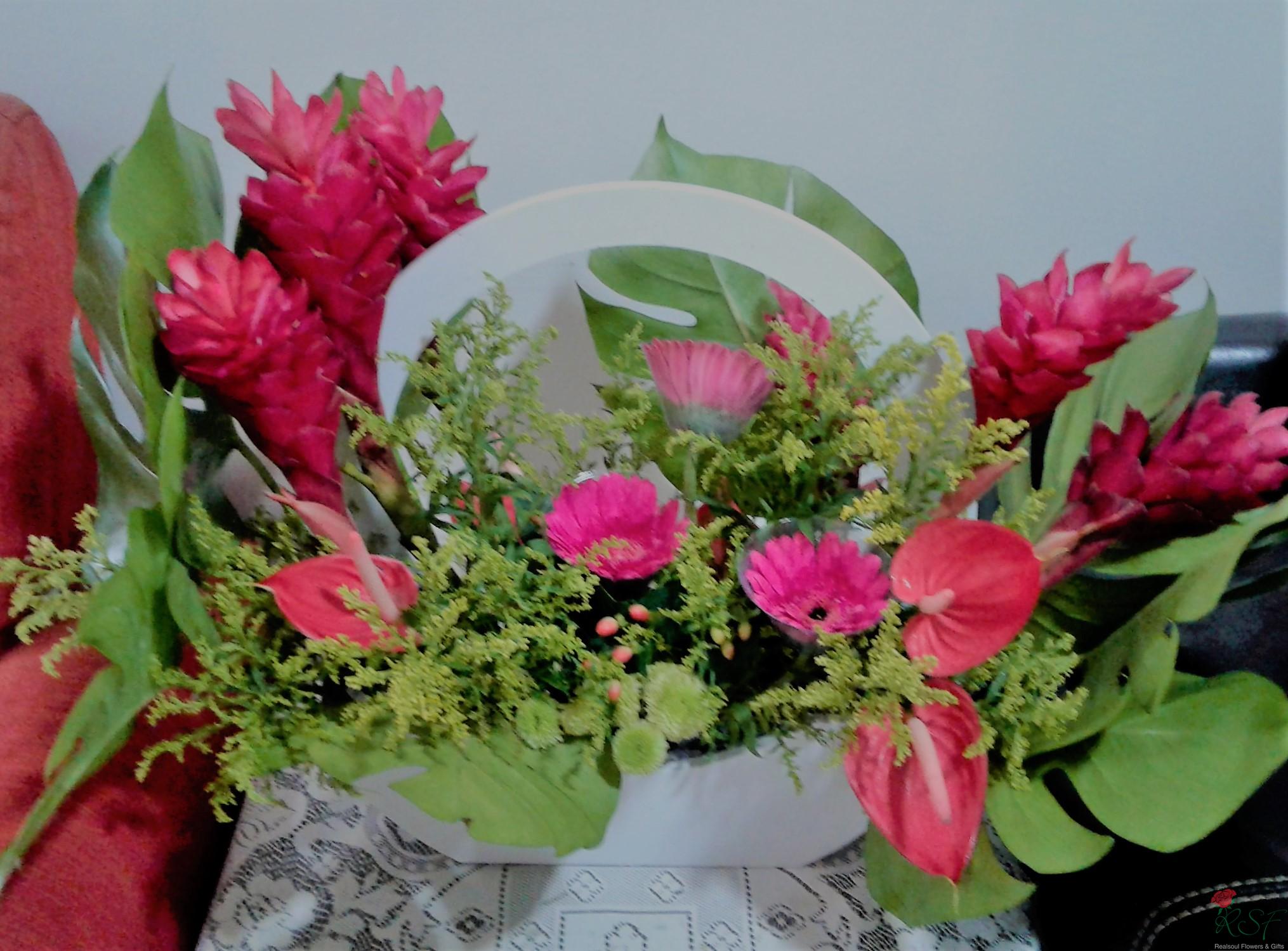 Vase arrangement: In a wooden container (front and back portion), are ginger flower, gerbera daisies, anthurium, peacock, pompomps, and monsteira leaves.