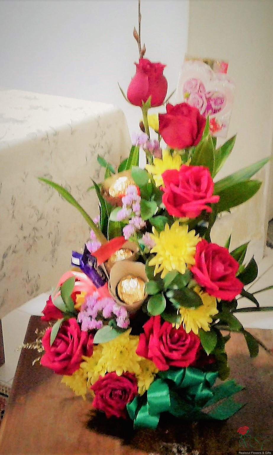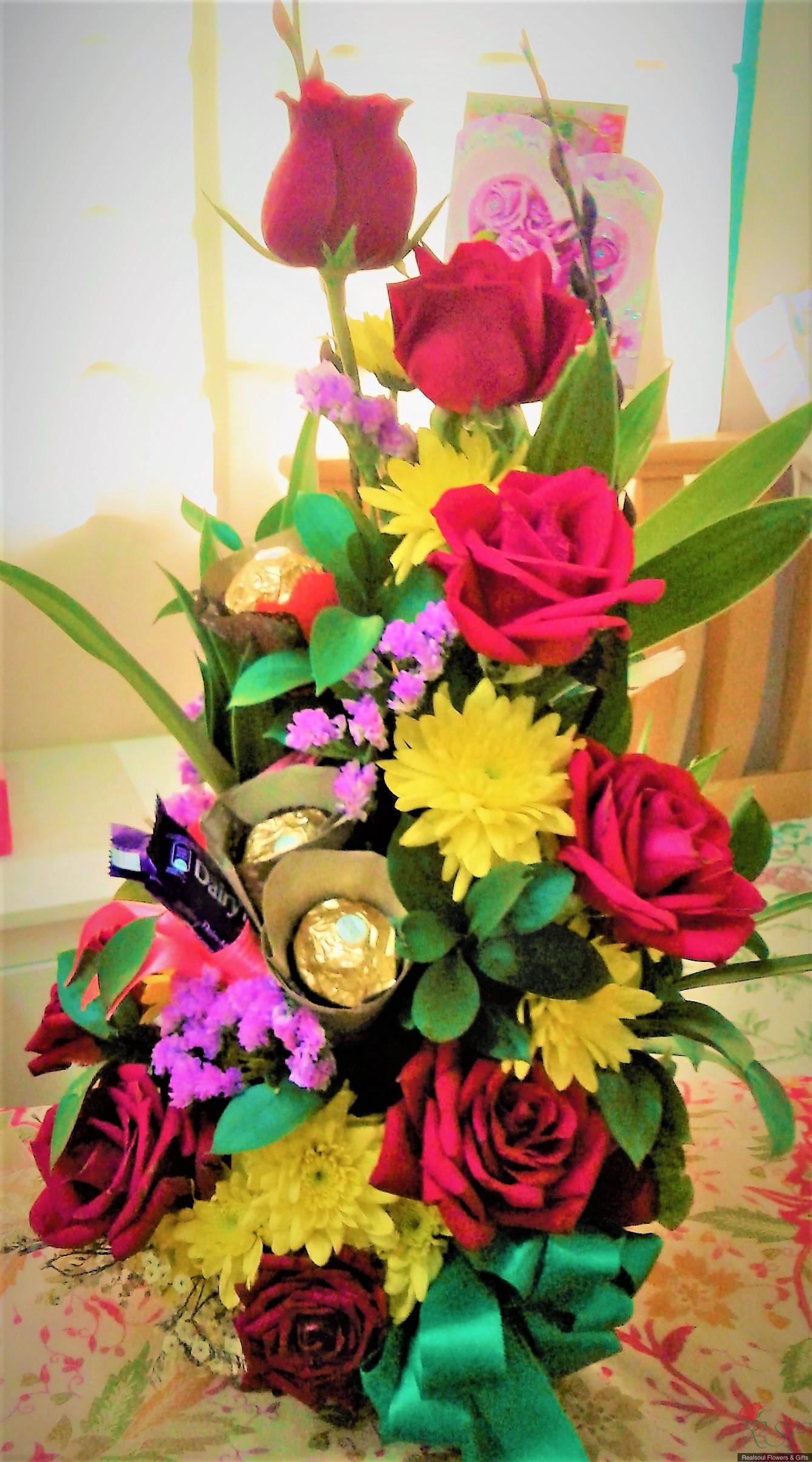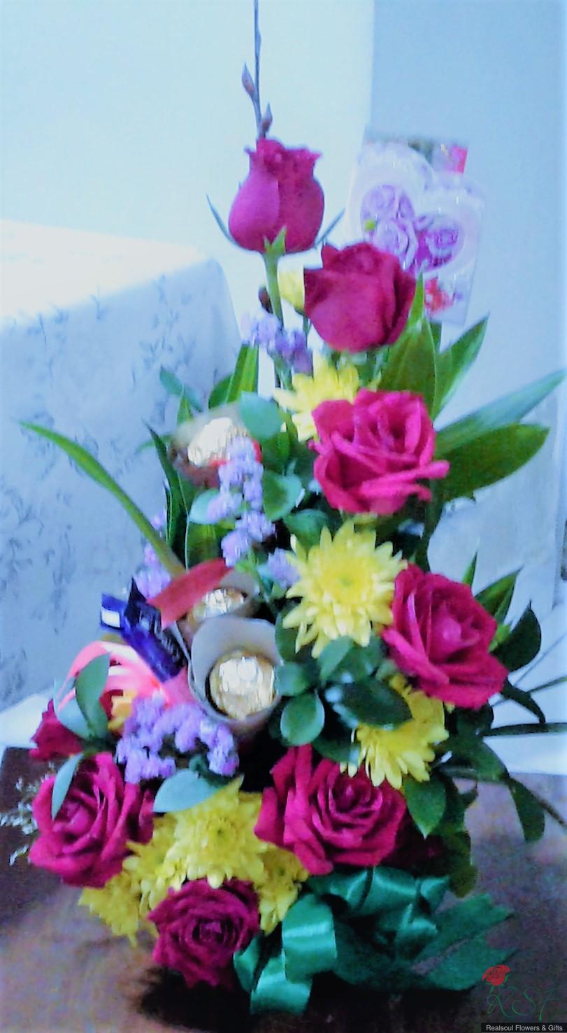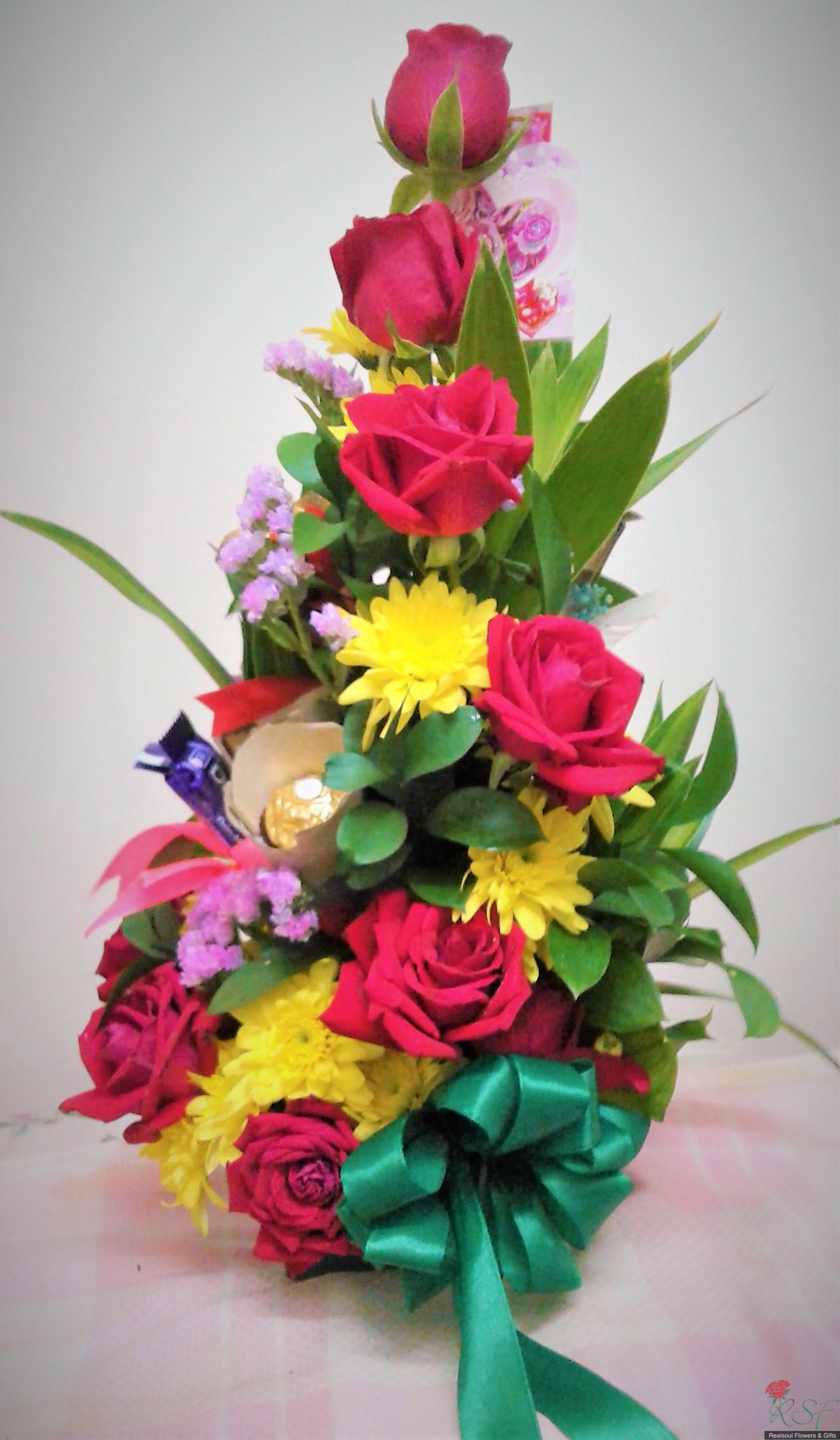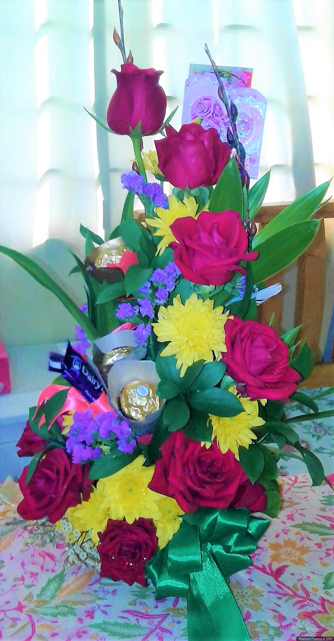 Vase Arrangements: This compact design seems to have it all-in-one and looks perfect for a Raya floral gift, Birthday gift for Mom or Dad or any celebrative gift. Order today while the offer is still on for Raya. This design is created for a client as a birthday gift for her Mom and delivered recently. The design includes 9 roses, pompoms, statice, caspia, ruscus, song of india, pussy willow and dove feather. Additionals include dairy milk chocolate bars, Ferrero Rocher, and a pack of Liptontea bags. Its priced at RM155.