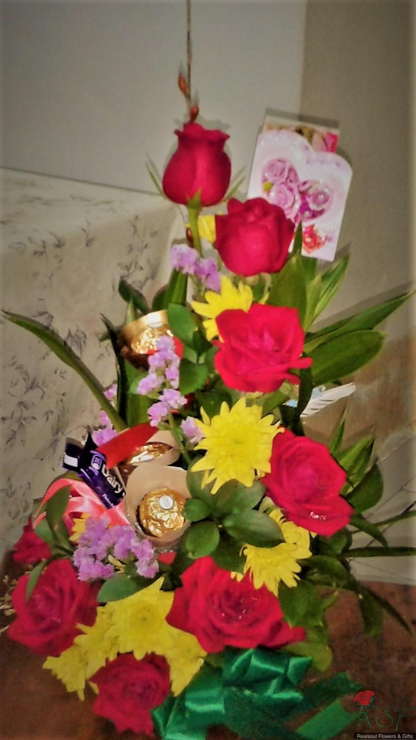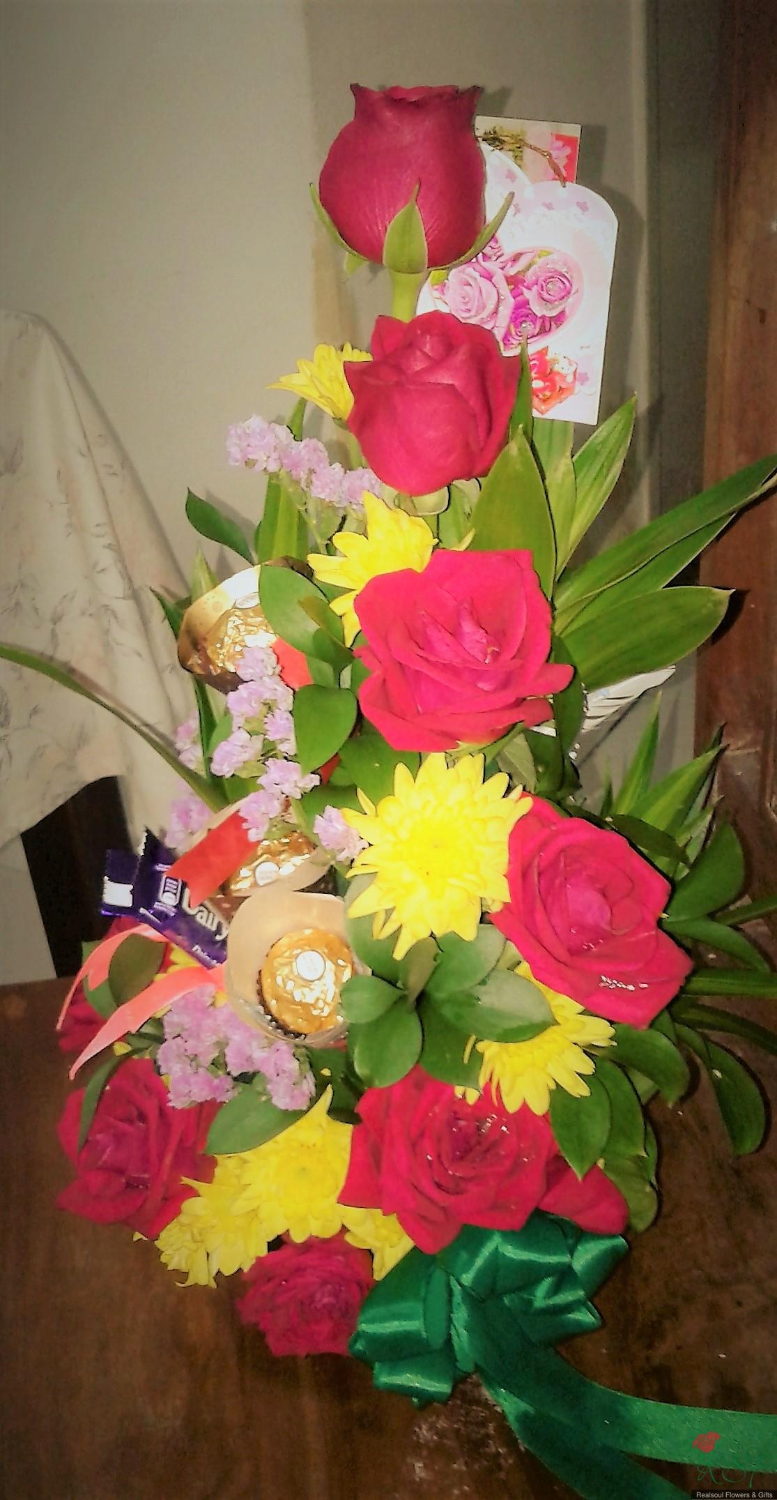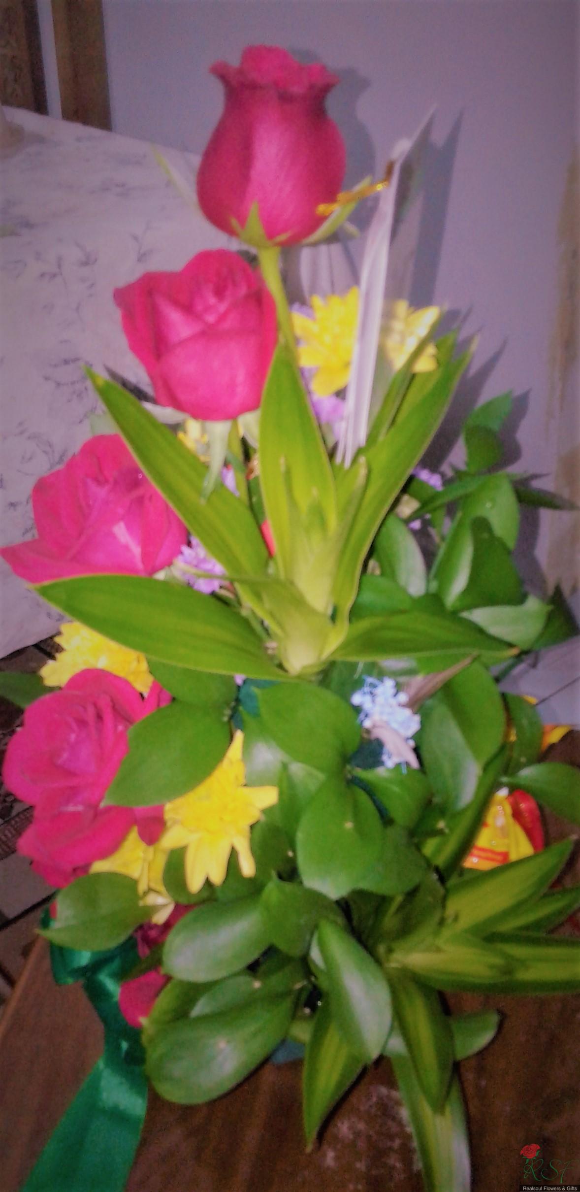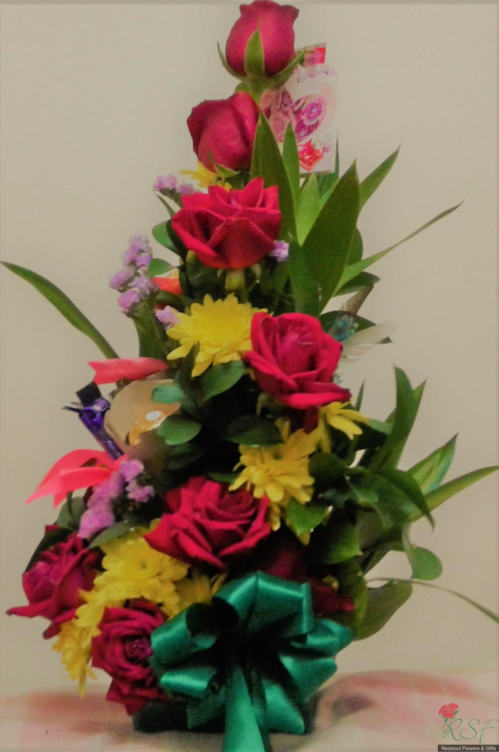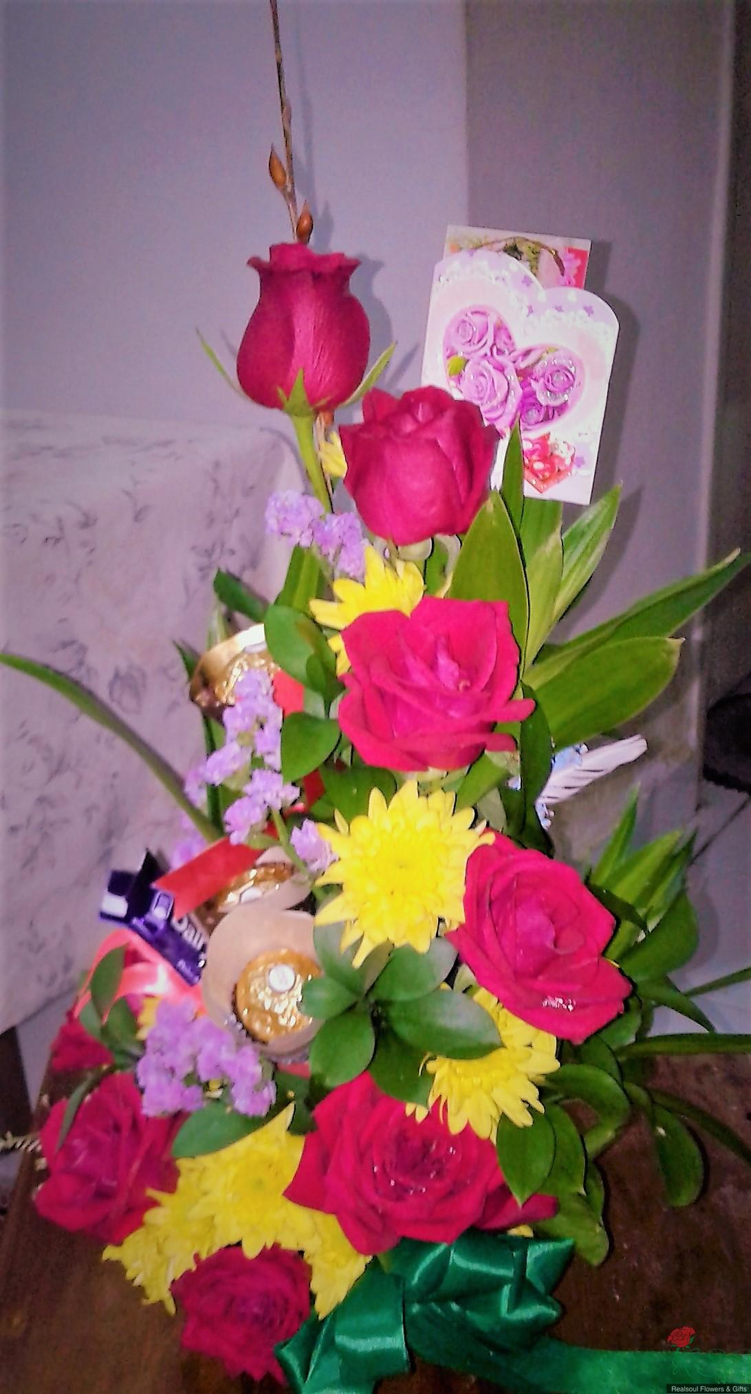 Vase Arrangements: This compact design seems to have it all-in-one and looks perfect for a Raya floral gift, Birthday gift for Mom or Dad or any celebrative gift. Order today while the offer is still on for Raya. This design is created for a client as a birthday gift for her Mom and delivered recently. The design includes 9 roses, pompoms, statice, caspia, ruscus, song of india, pussy willow and dove feather. Additionals include dairy milk chocolate bars, Ferrero Rocher, and a pack of Liptontea bags. Its priced at RM155.