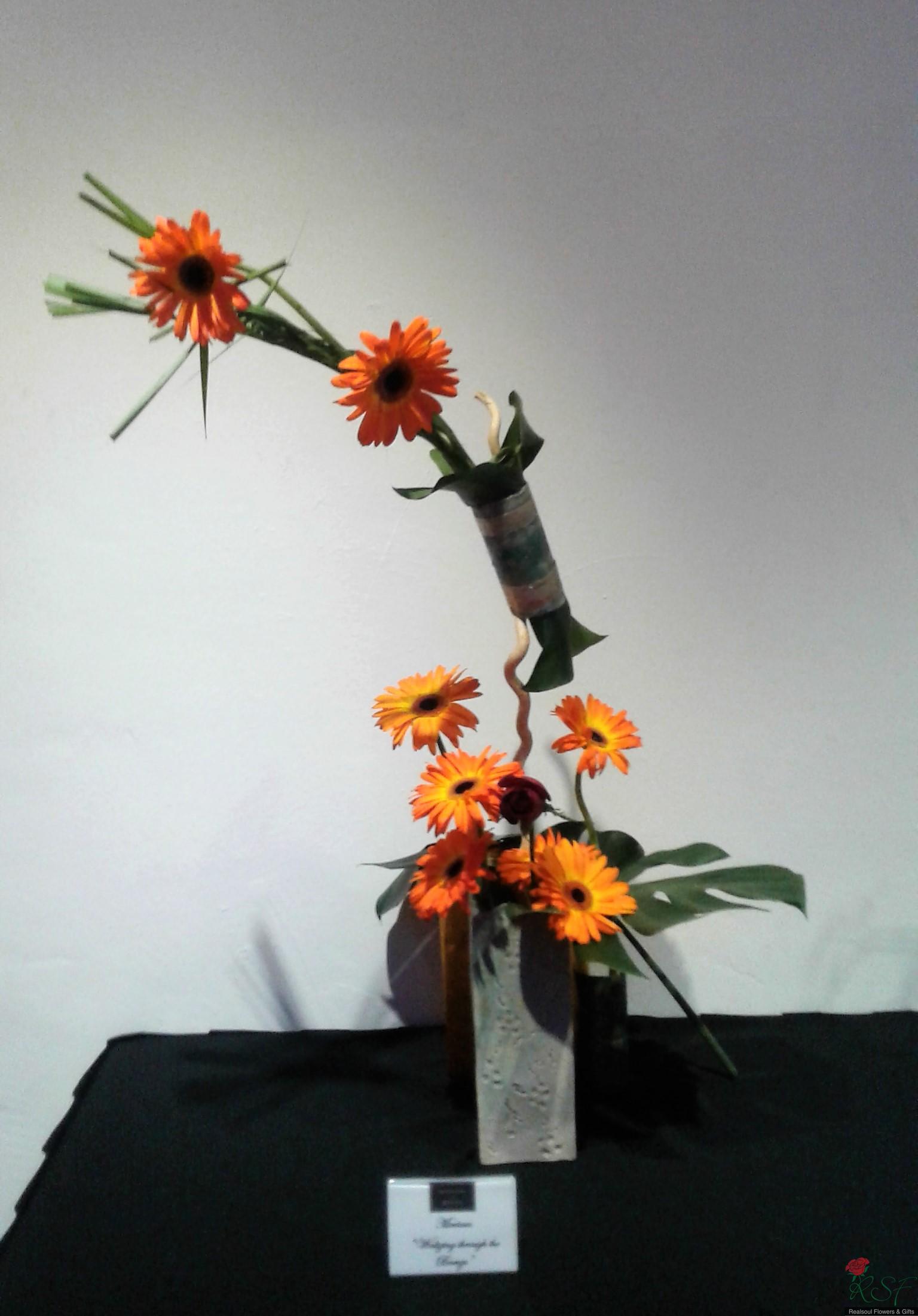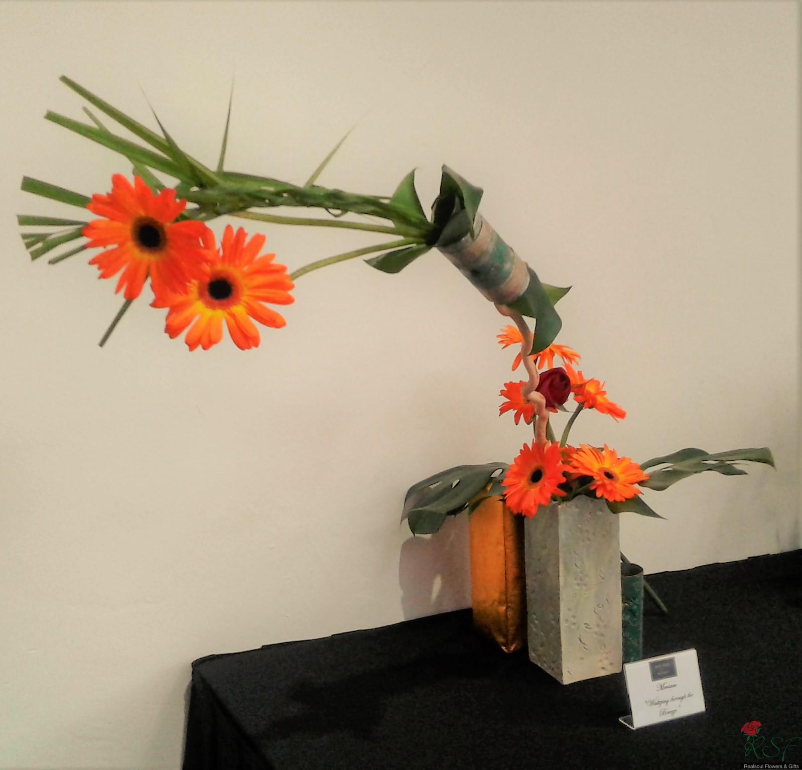 NOTE: This Sogetsu free style design was exhibited at the Geometrical Ikebana Exhibition, One Utama Gallery in October 2017. The design titled "Waltzing through the breeze" was featured in the STAR newspaper article.