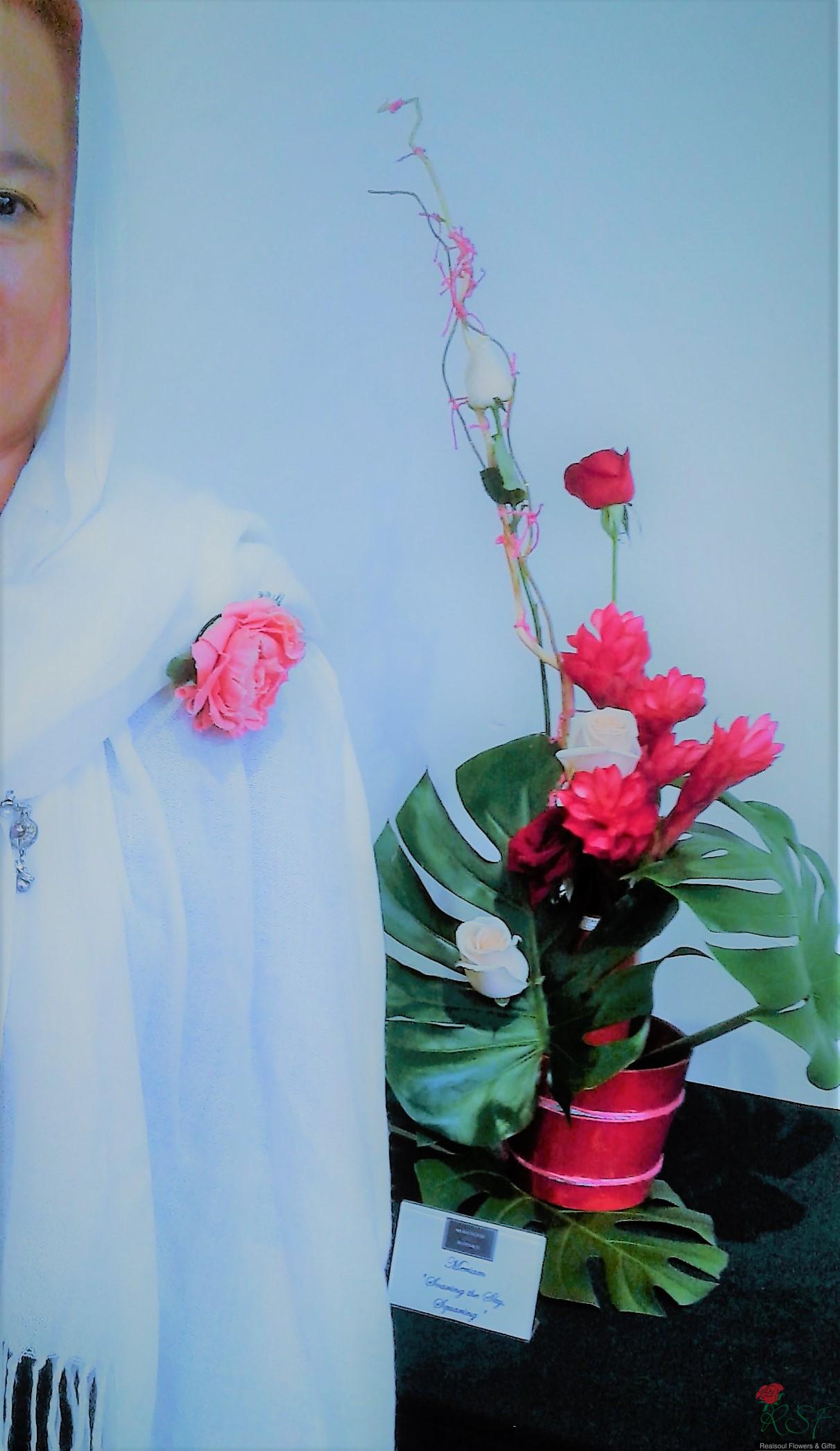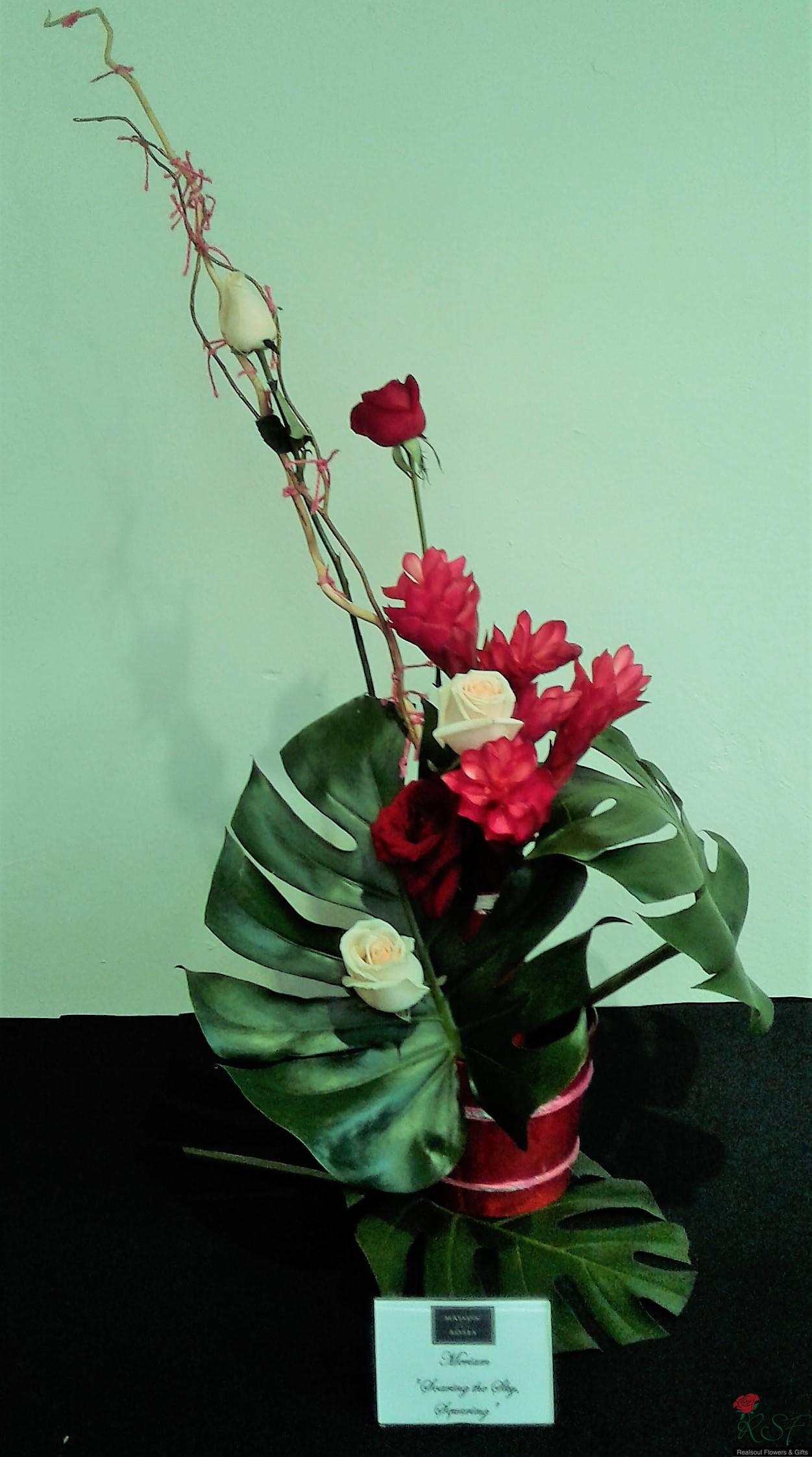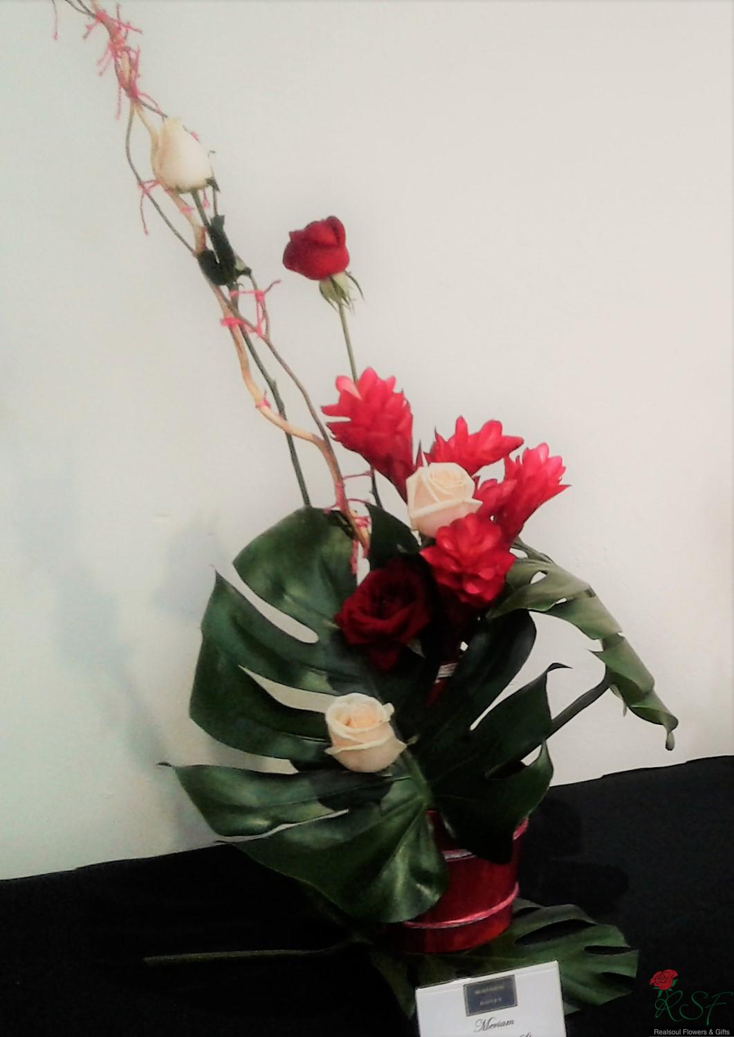 Vase/Table arrangements: This Sogetsu school free style high arrangement (nageire) consists of roses, ginger flowers, monsteira leaves, salix branches in a red painted cylindirical container placed in a red open pot decorated with pink strings.