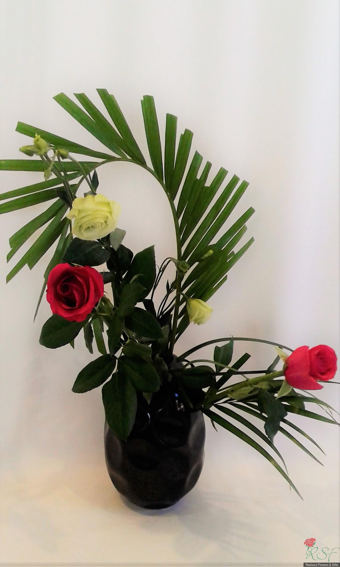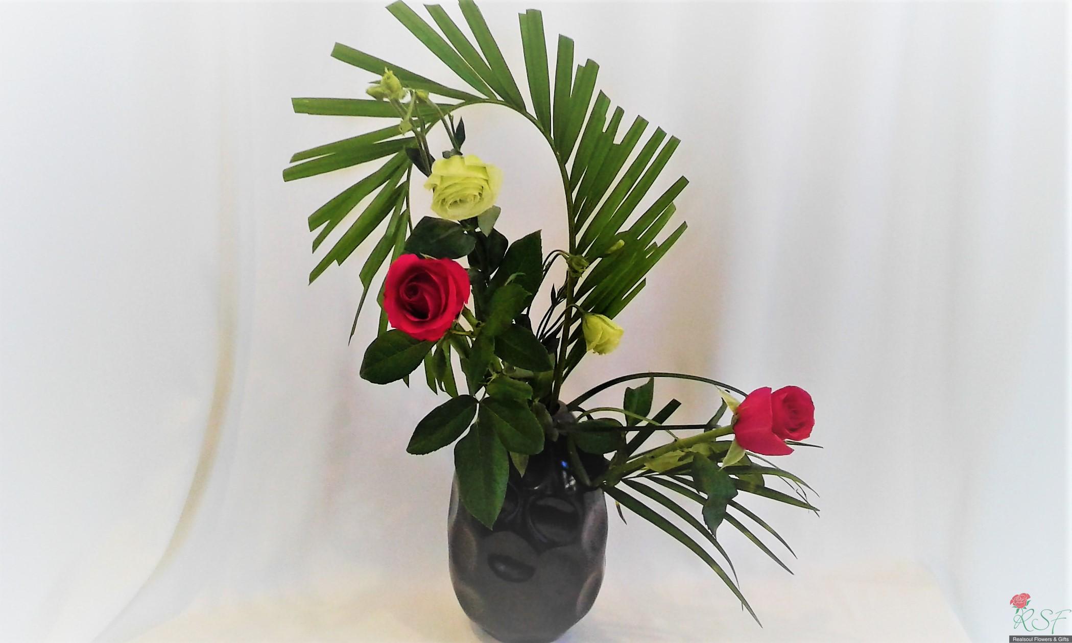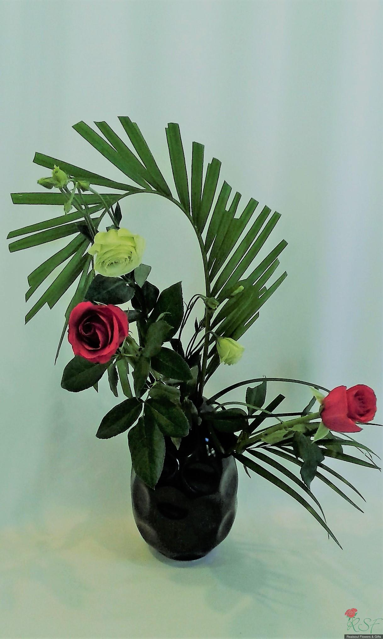 Vase/Table arrangements: Roses, eustoma and palm leaves are used in this arrangement using tall black ceramic container.