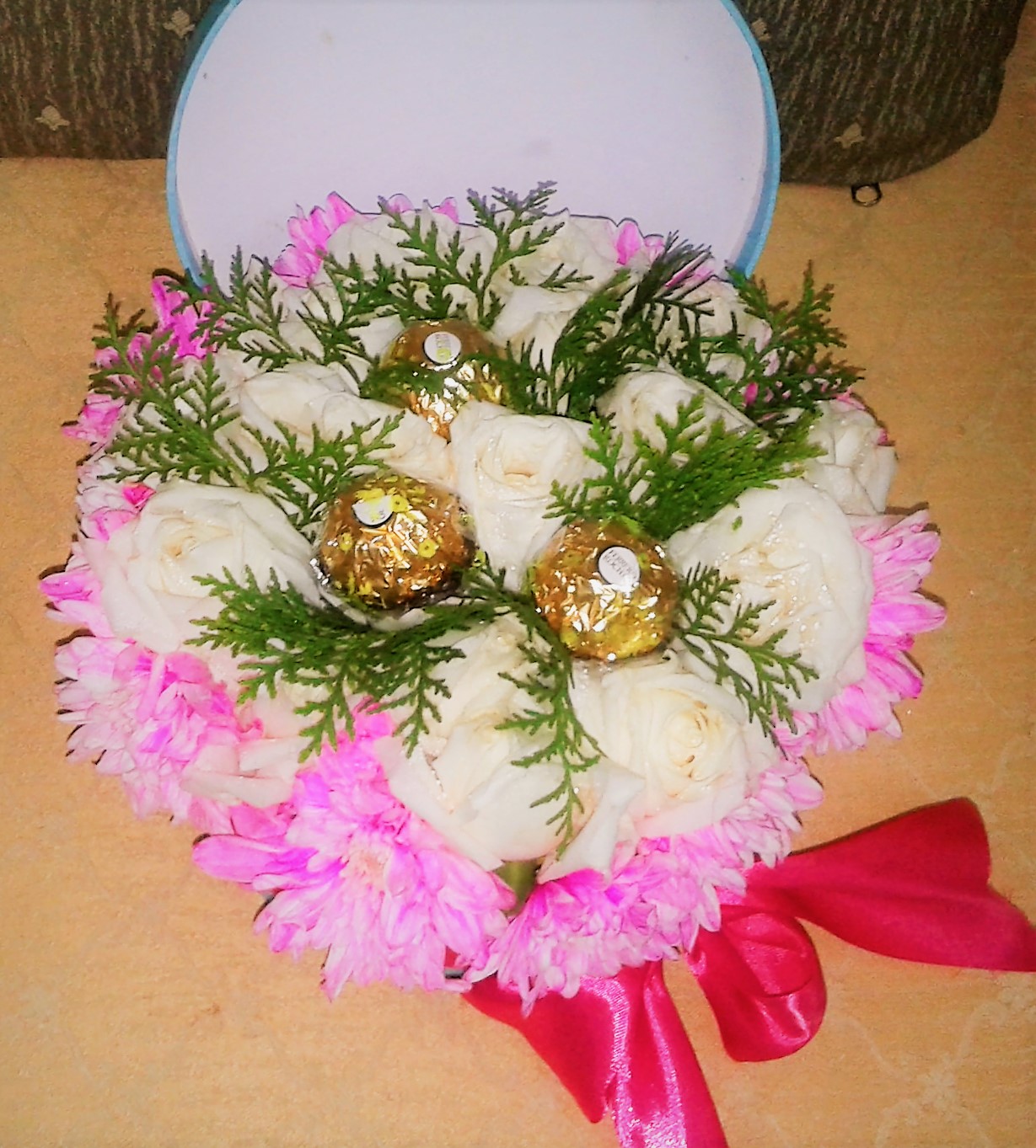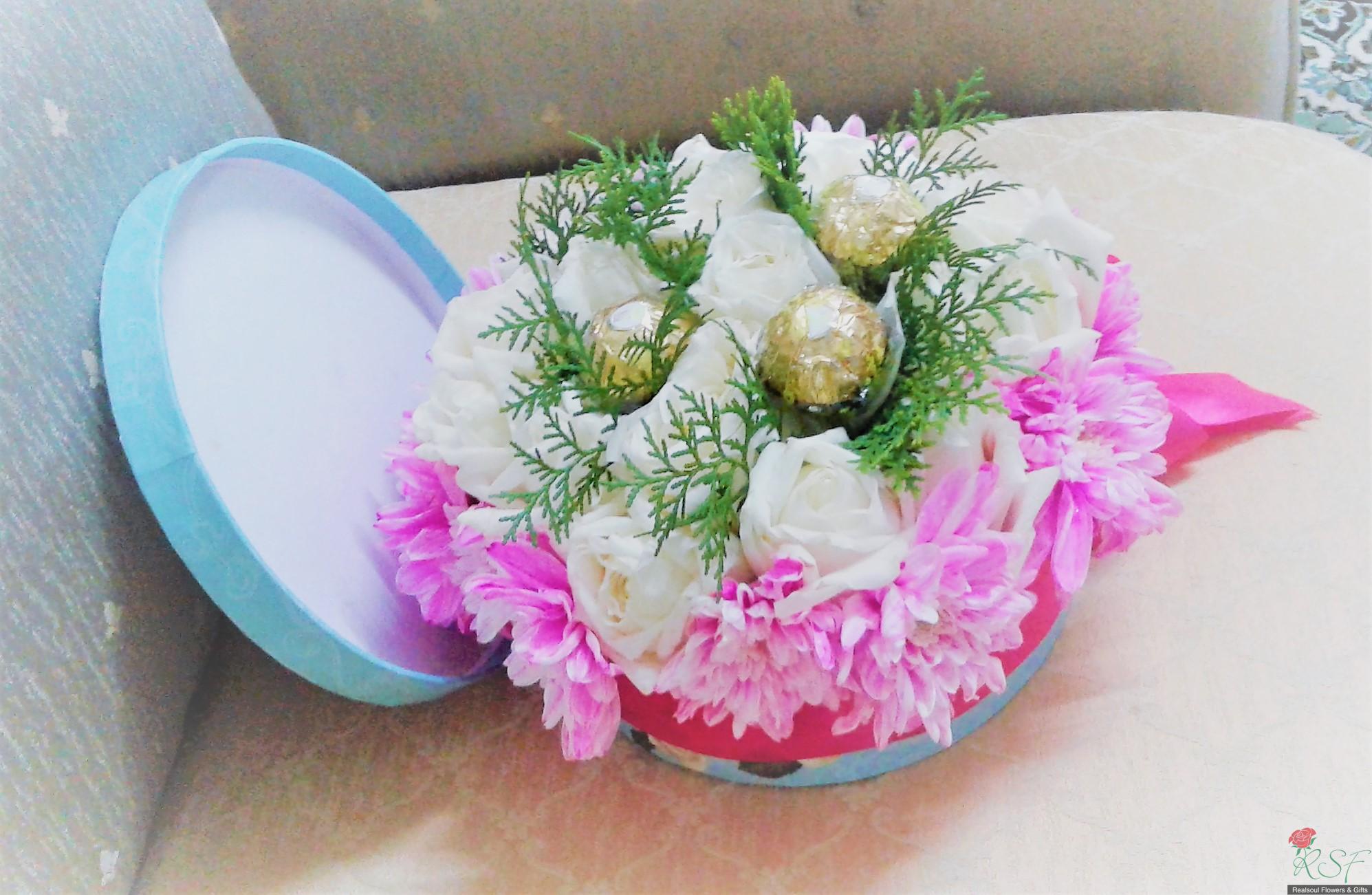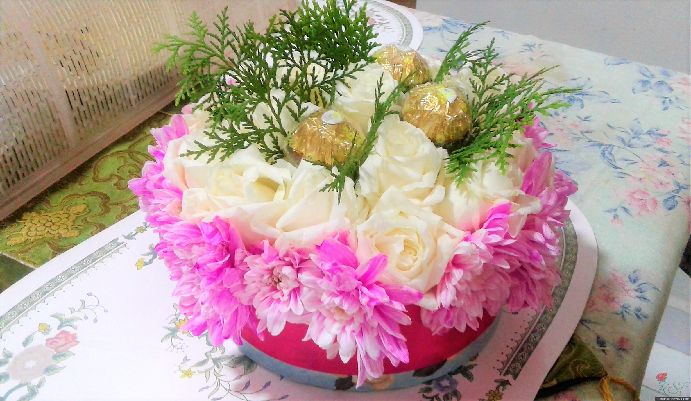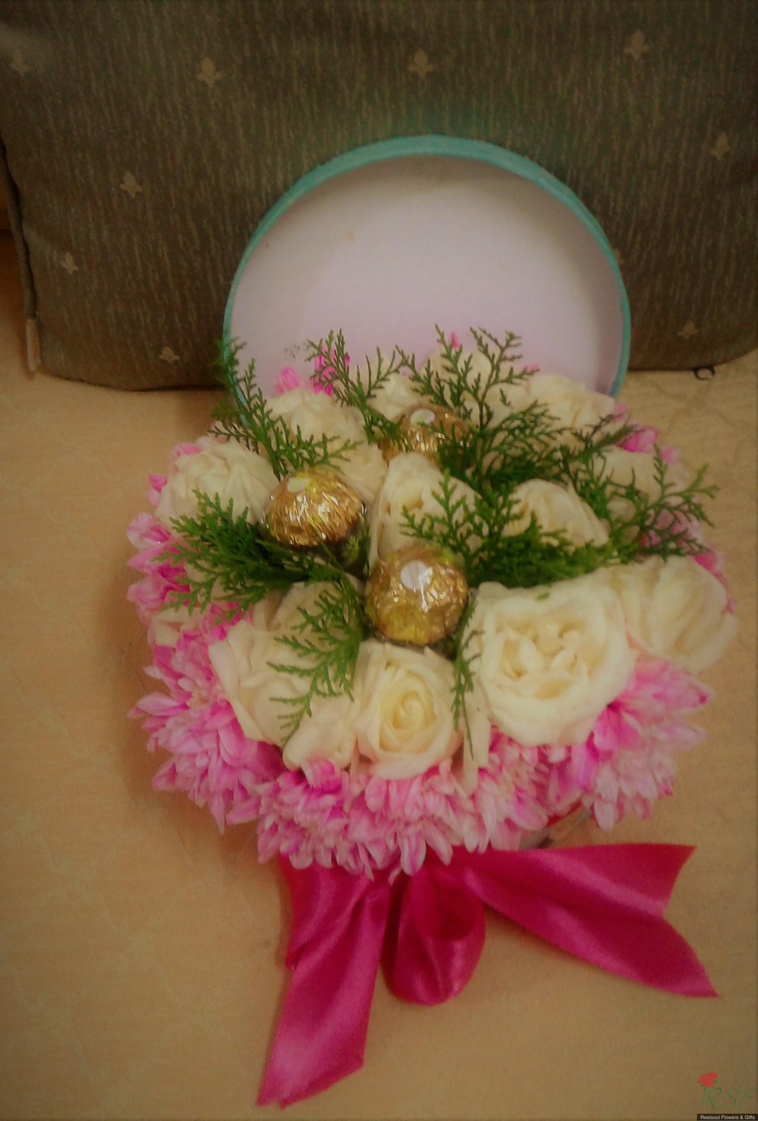 Vase/Table Arrangements: This arrangement in a round box was designed for a client and consists of 16 white roses (on cliet's request), 3 Ferrero Rocher, pink pompoms, and pine leaves (pine leaves were removed upon client's request and replaced with dried statice instead, and client is happy with it), and decorated with ribbon. For orders please see the "Order & Payment" page.