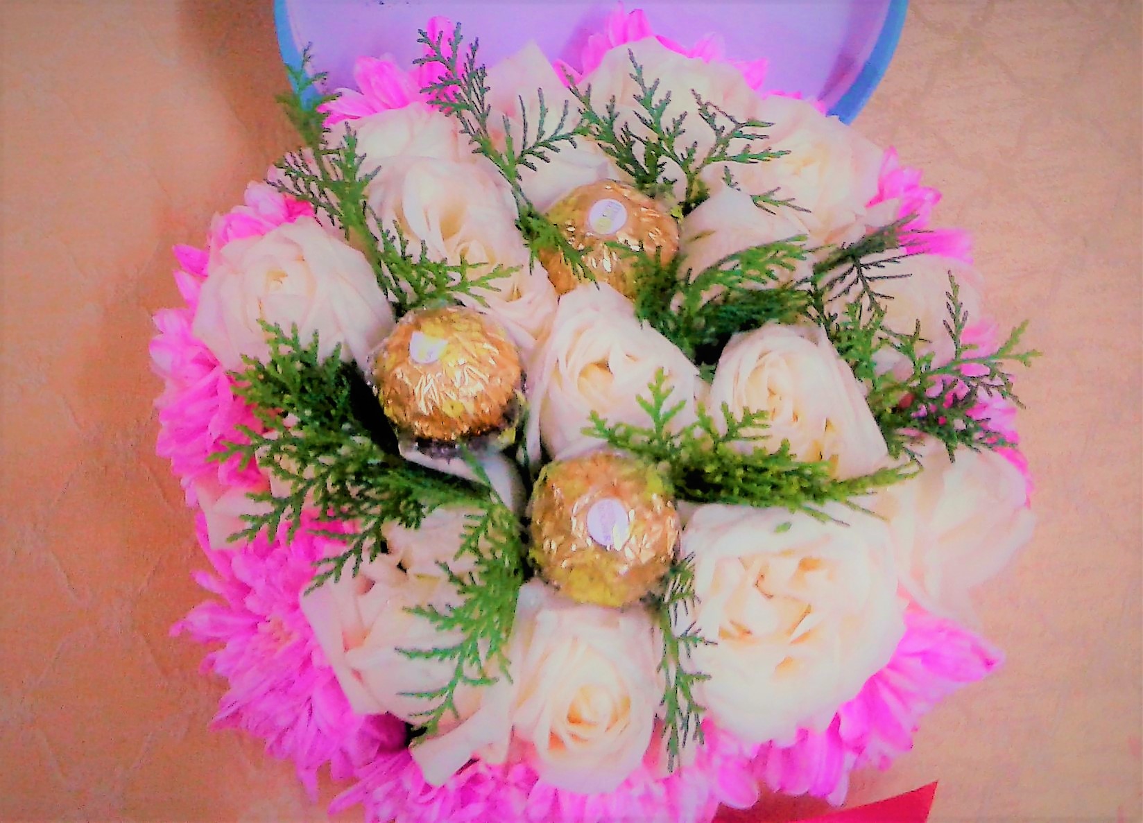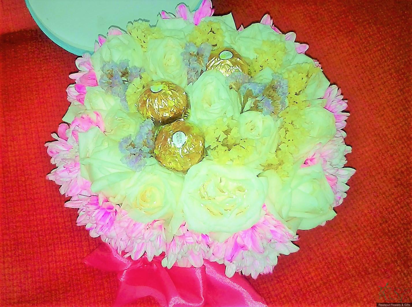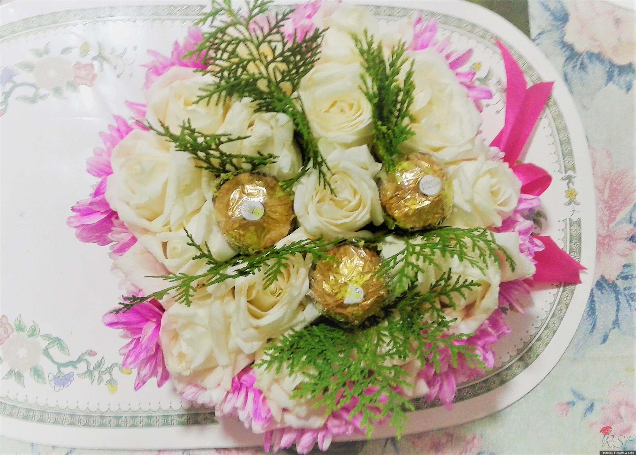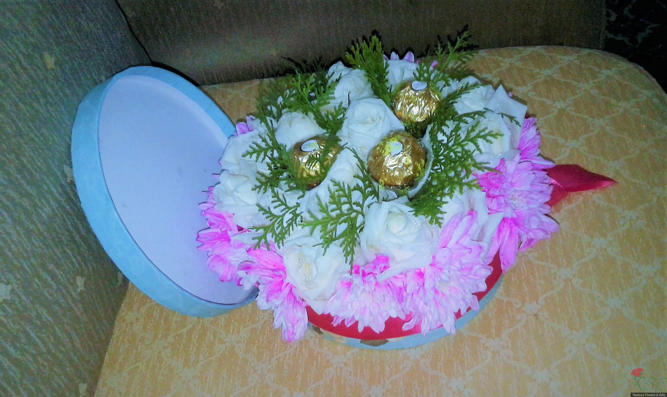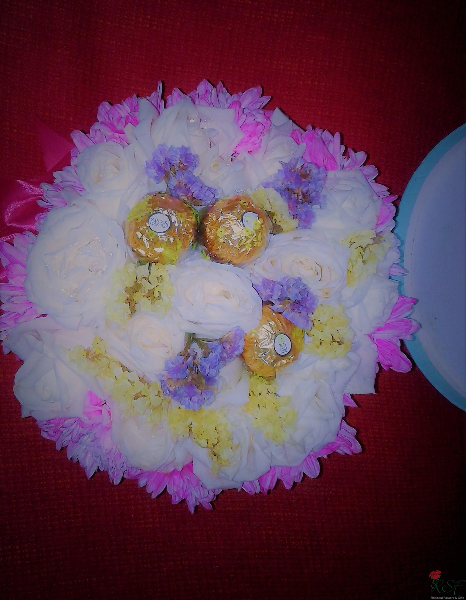 Vase/Table Arrangements: This arrangement in a round box was designed for a client and consists of 16 white roses (on cliet's request), 3 Ferrero Rocher, pink pompoms, and pine leaves (pine leaves were removed upon client's request and replaced with dried statice instead, and client is happy with it), and decorated with ribbon. For orders please see the "Order & Payment" page.