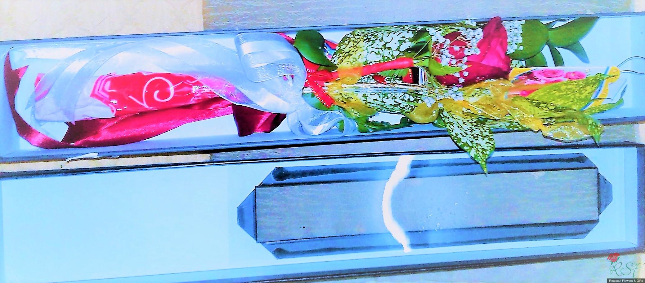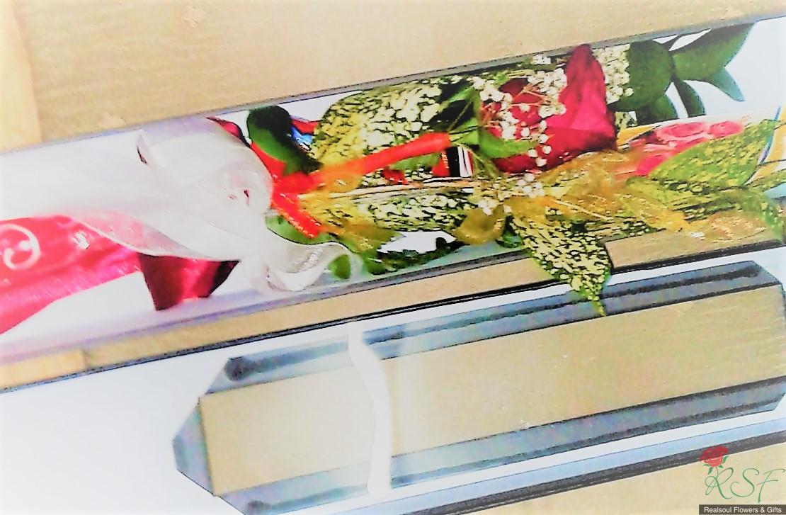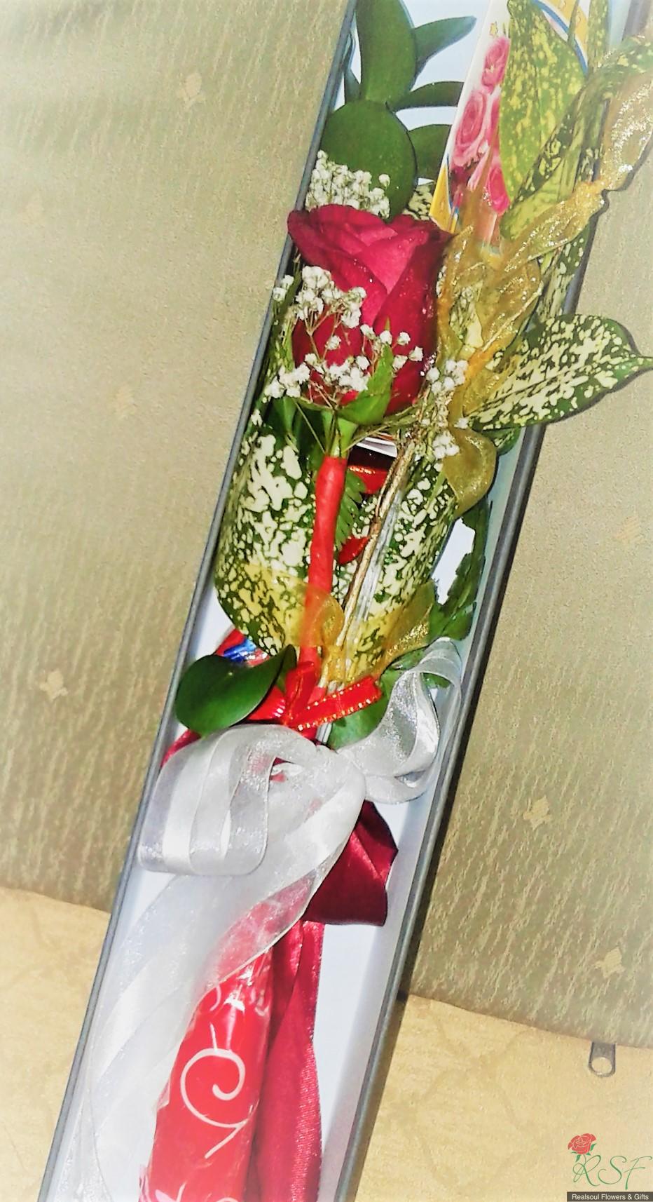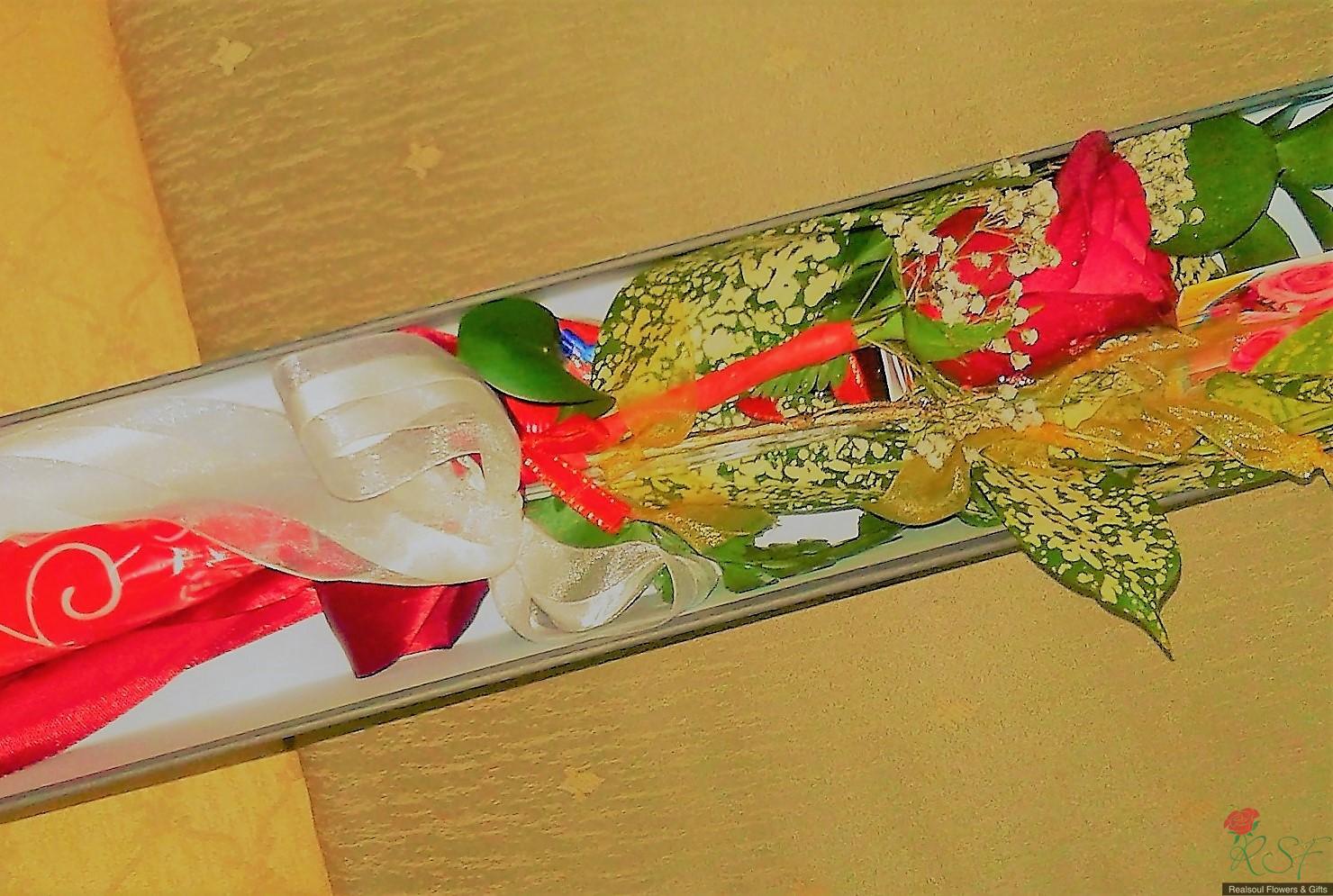 Valentine Day Ideas: This specially designed bouquet to celebrate Valentine's Day in February consists of a red rose, decorated with fillers and foliage, with smarties pack and placed in an elongated hard box with cover. A wishing card added. It's been displayed at Lulu Hypermarket, KL during the mid month of February 2018.