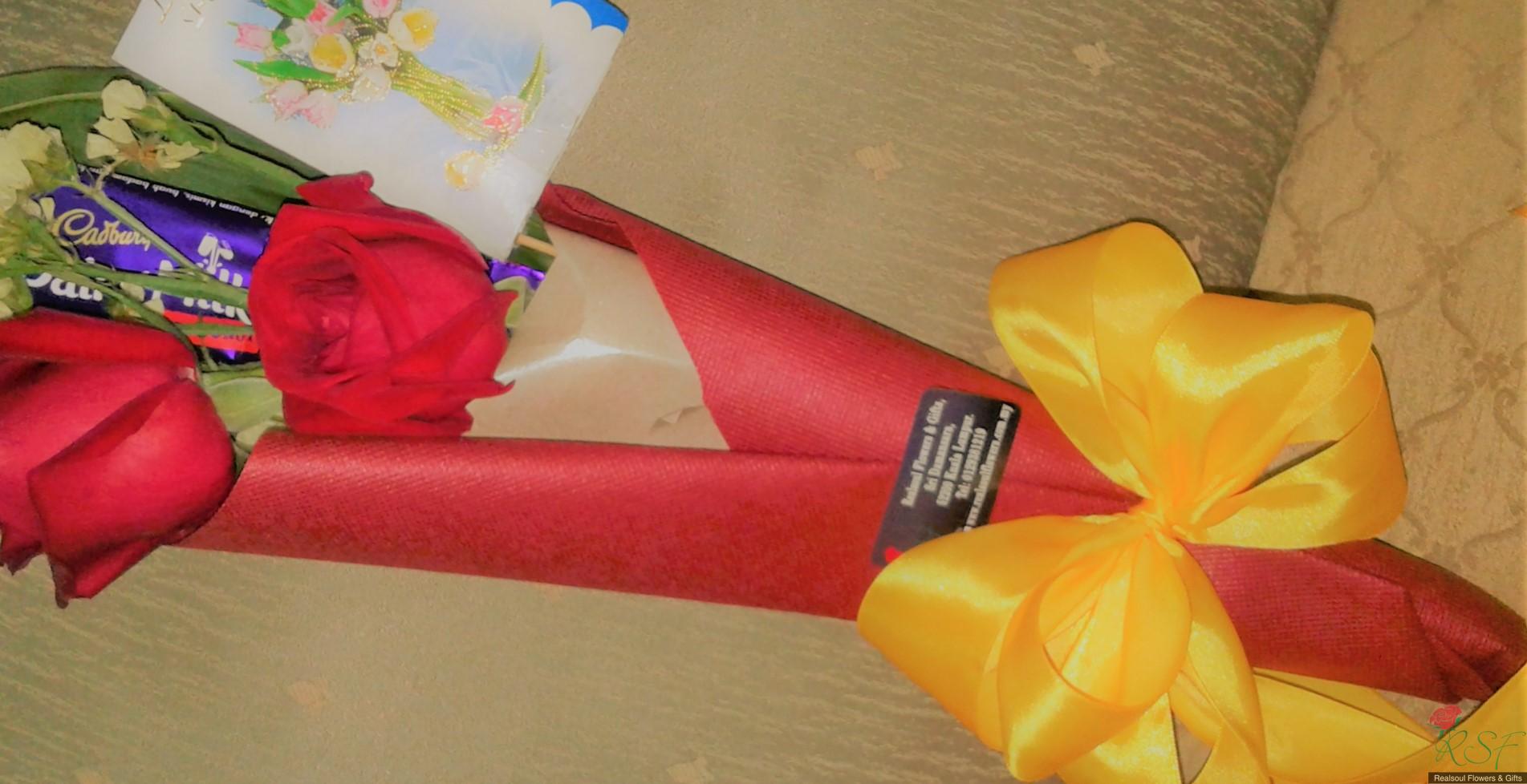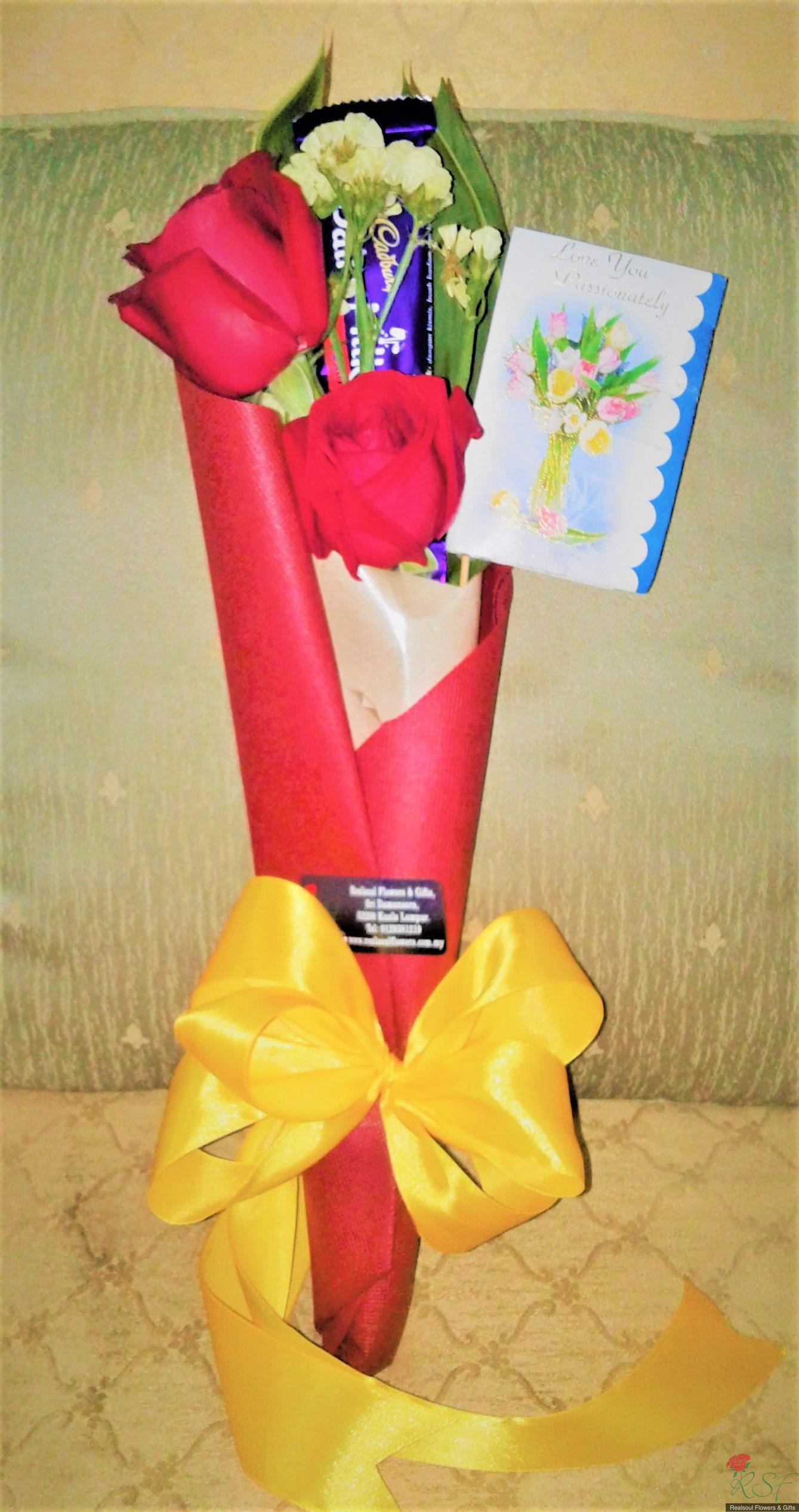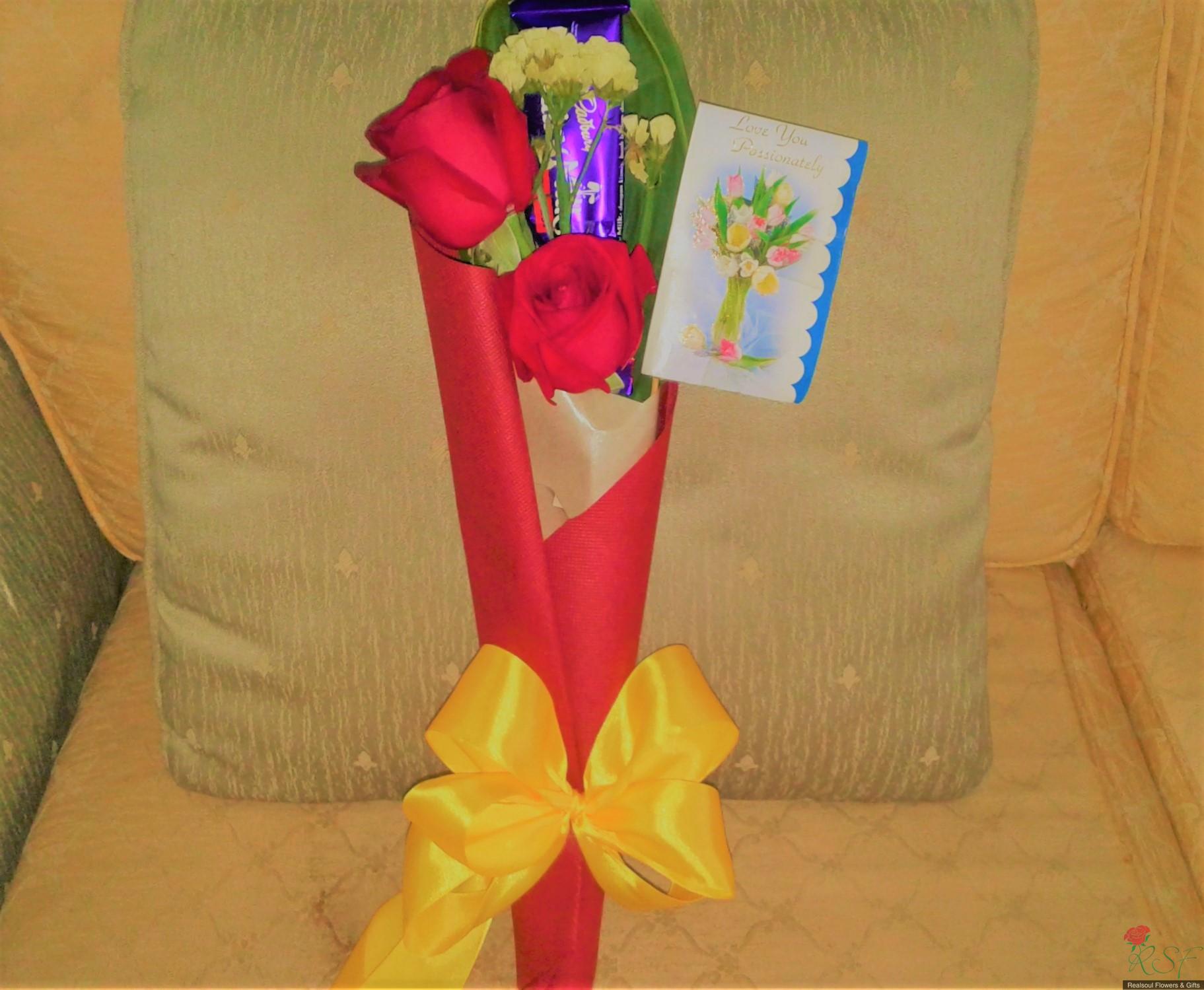 Valentine Day/Door Gift Ideas: This simple hand bouquet is ideal for any personal gift to a person you care or it can be also a guest to a host gift while visiting. It comes with 2 red roses, 2 bars of chocolates, statice, foliage and a wishing card. Nicely wrapped and decorated with a bow ribbon.