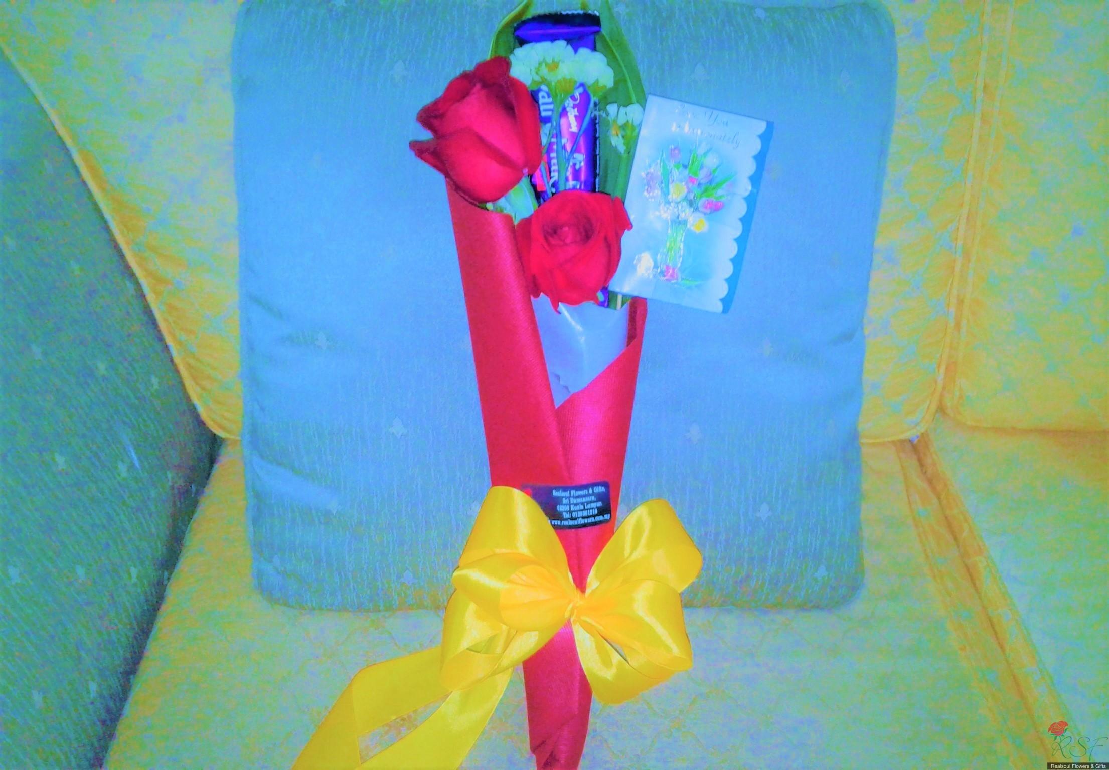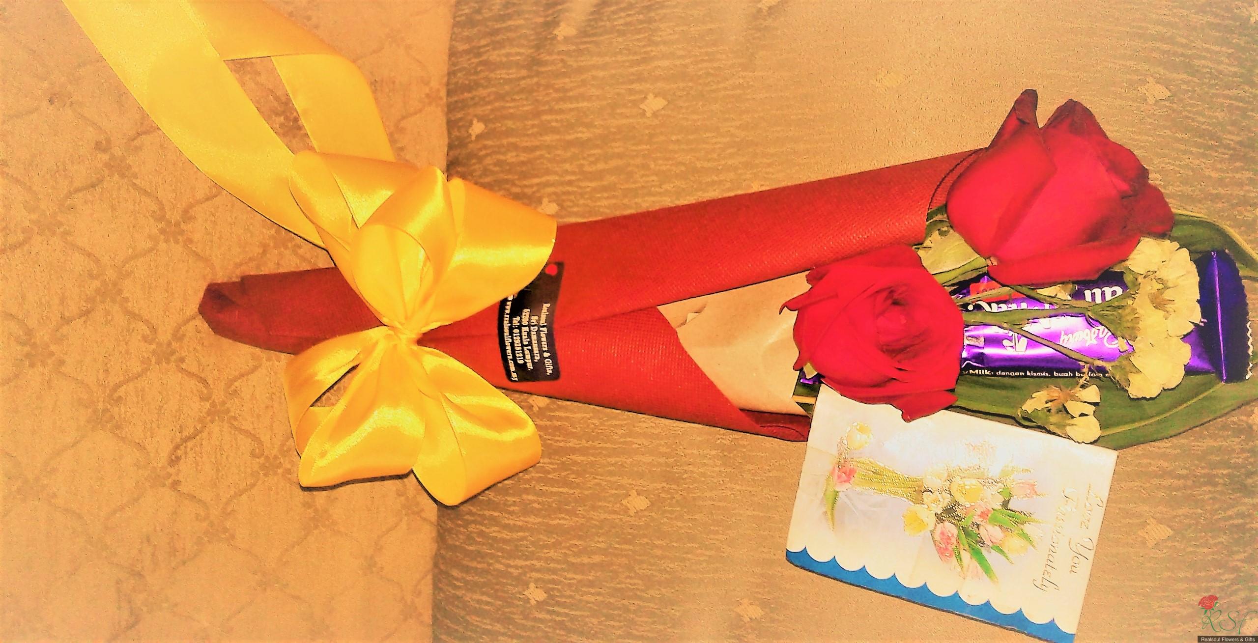VTI 121 - Two roses and two chocolate bars, ideal for any personal gift to a loved one (Dua kuntum ros, dua bar coklat, sesuai sebagai hadiah peribadi kepada orang tersayang). Client's Review (Kuala Lumpur 27/6/2018): " Isteri saya suka bunga ini."