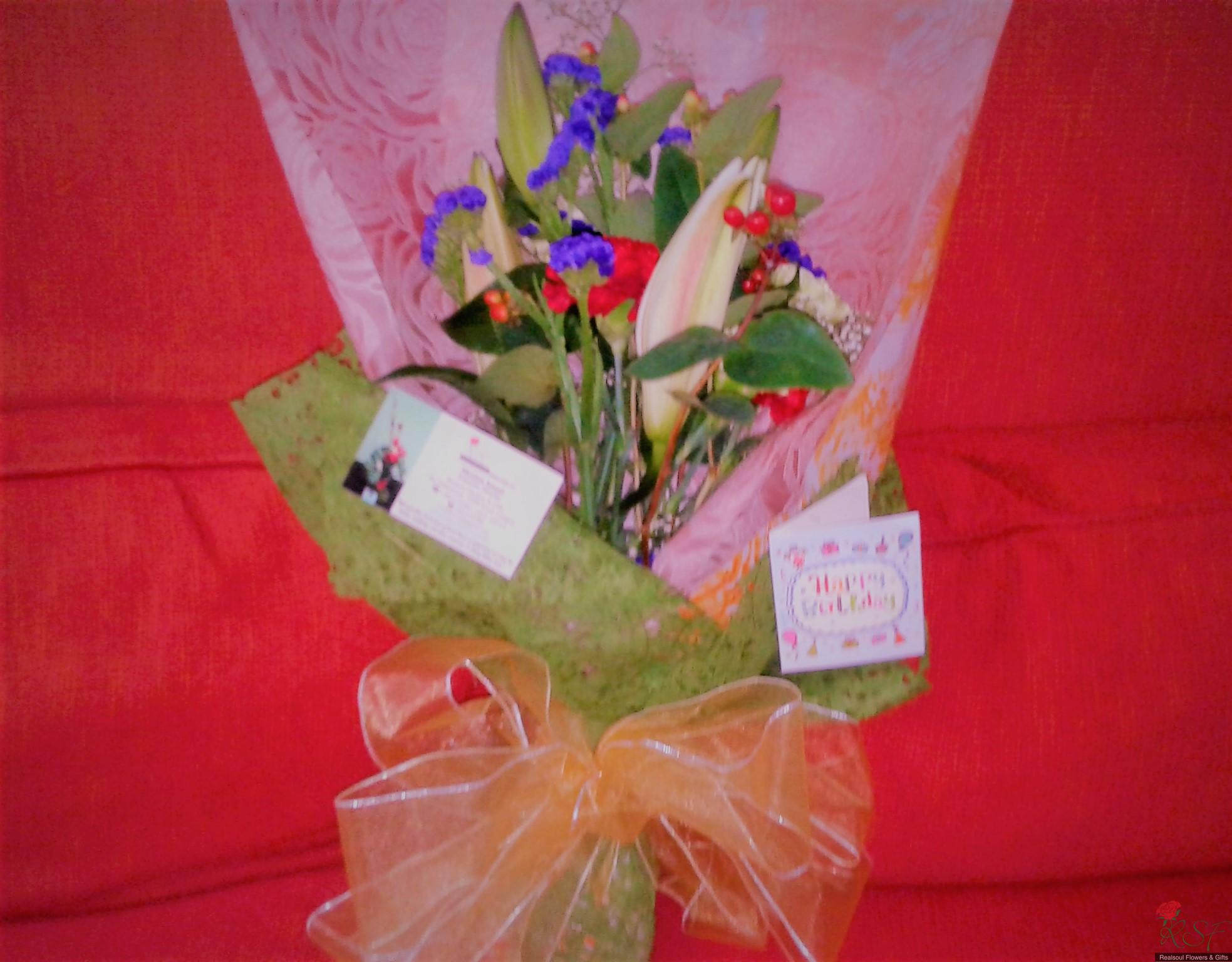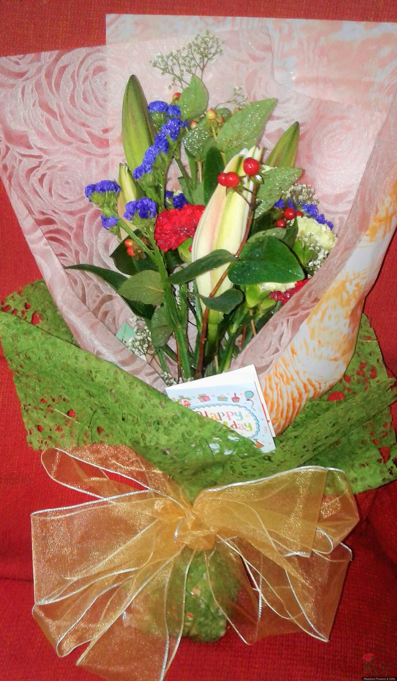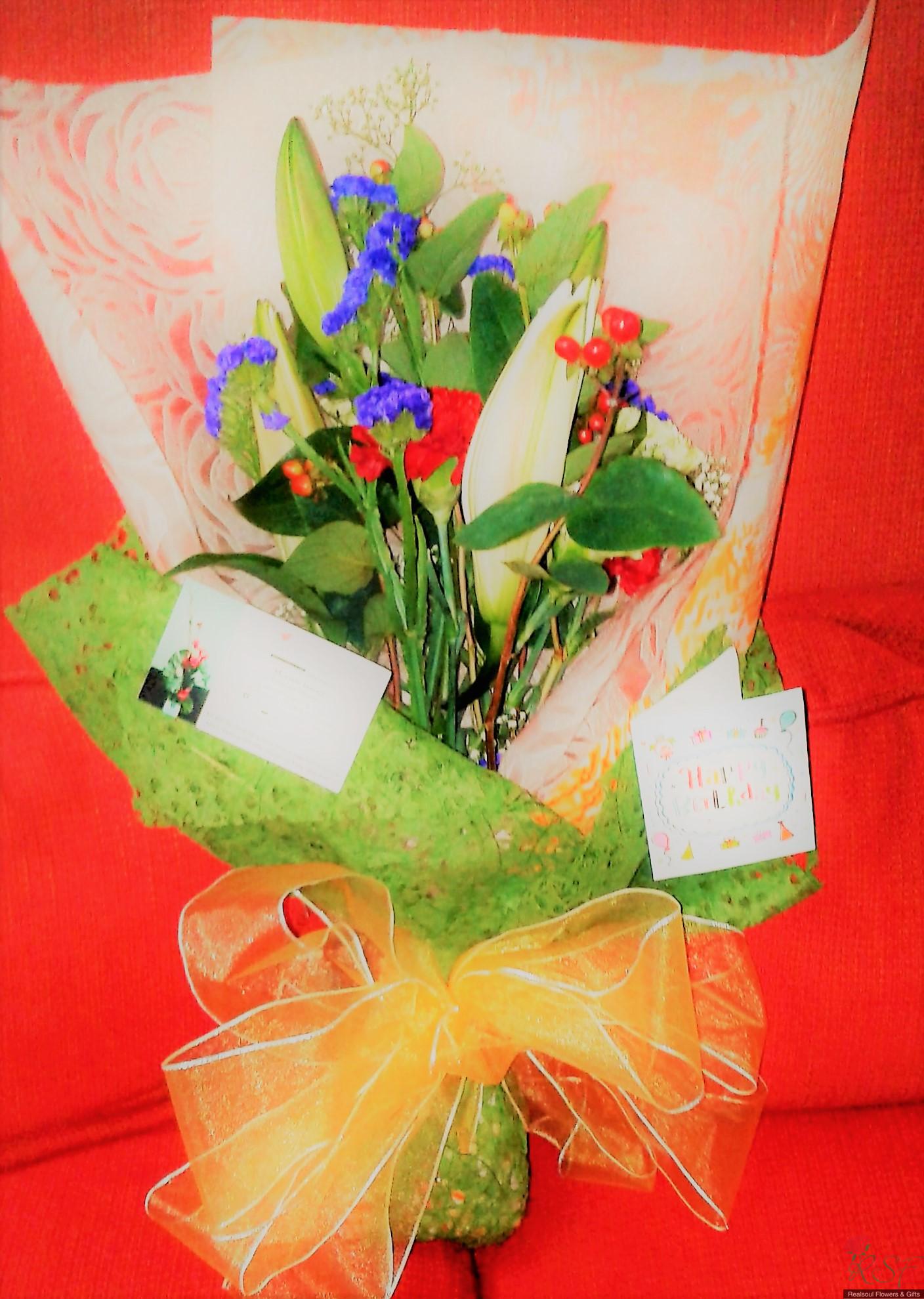 VALENTINE DAY IDEAS: Elegantly wrapped with minimalist "JUST floral look with NO other leaves added" makes this bouquet of ONE stalk lily and EIGHT carnations as focal flowers combined with red hipericum beries, purple statice and babys breath the ideal Valentine Bouquet along with any other gift separately ordered like beaded jewellery or real preserved rose pendant or just simply chocolate brownies. This bouquet was originally designed for a client's Birthday recently. It is decorated with large golden organza ribbon. The minimalist look in a floral bouquet is currently trending among younger aged clients and this minimalist look is suitable for Valentine Day gift. Along with the bouquet client can also pair up with other gifts pictured here such as real preserved rose pendant or chocolate brownies slices.