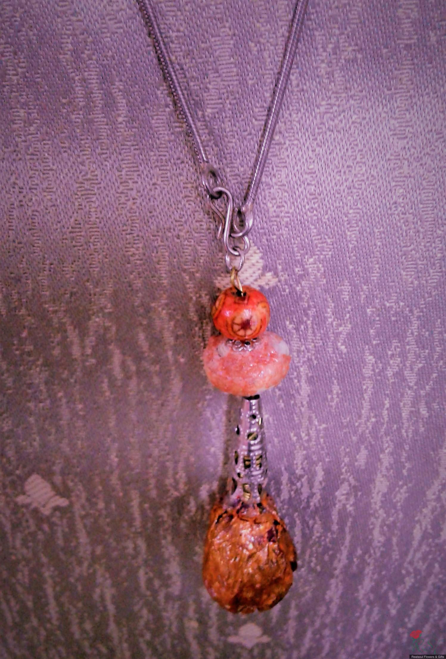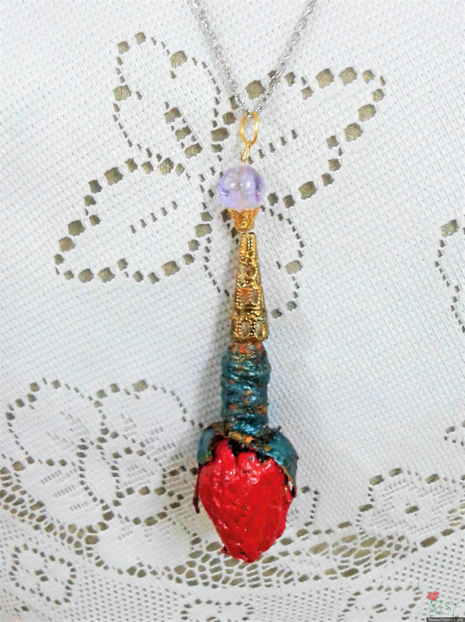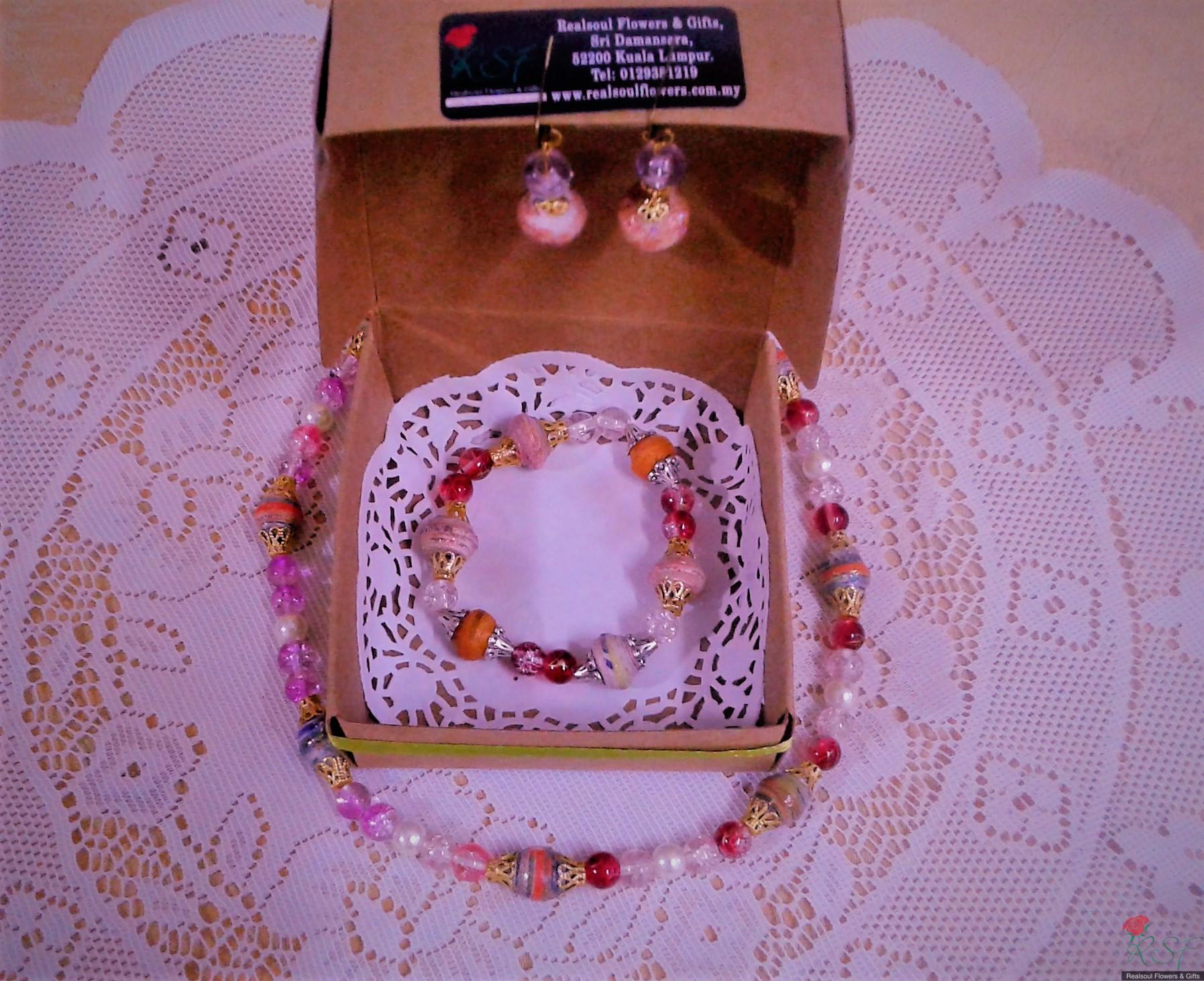VALENTINE DAY IDEAS: Elegantly wrapped with minimalist "JUST floral look with NO other leaves added" makes this bouquet of ONE stalk lily and EIGHT carnations as focal flowers combined with red hipericum beries, purple statice and babys breath the ideal Valentine Bouquet along with any other gift separately ordered like beaded jewellery or real preserved rose pendant or just simply chocolate brownies. This bouquet was originally designed for a client's Birthday recently. It is decorated with large golden organza ribbon. The minimalist look in a floral bouquet is currently trending among younger aged clients and this minimalist look is suitable for Valentine Day gift. Along with the bouquet client can also pair up with other gifts pictured here such as real preserved rose pendant or chocolate brownies slices.