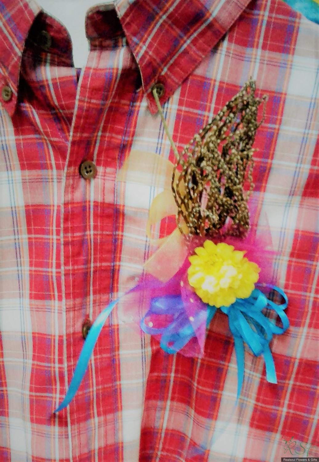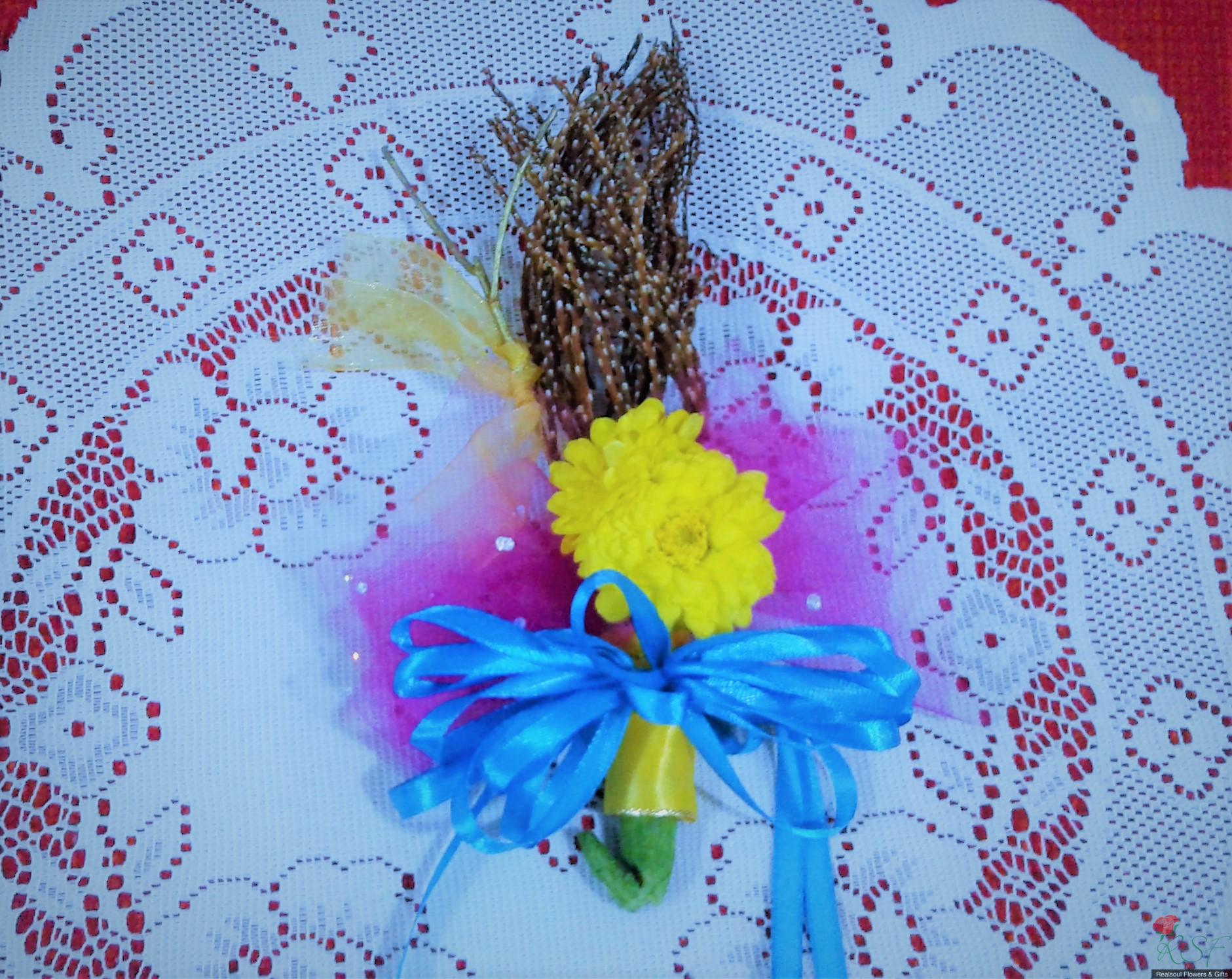 Weddings: This boutonniere is especially designed for rustic themed wedding and ideal for it. It consists of dried palm flowers, organza fabric, pompoms (or any artificial flowers), decorated twigs and fluffed ribbons. Suitable for groom or best man. Height is 20 cm and weight 28 gm. Minimum order of 4 pieces.