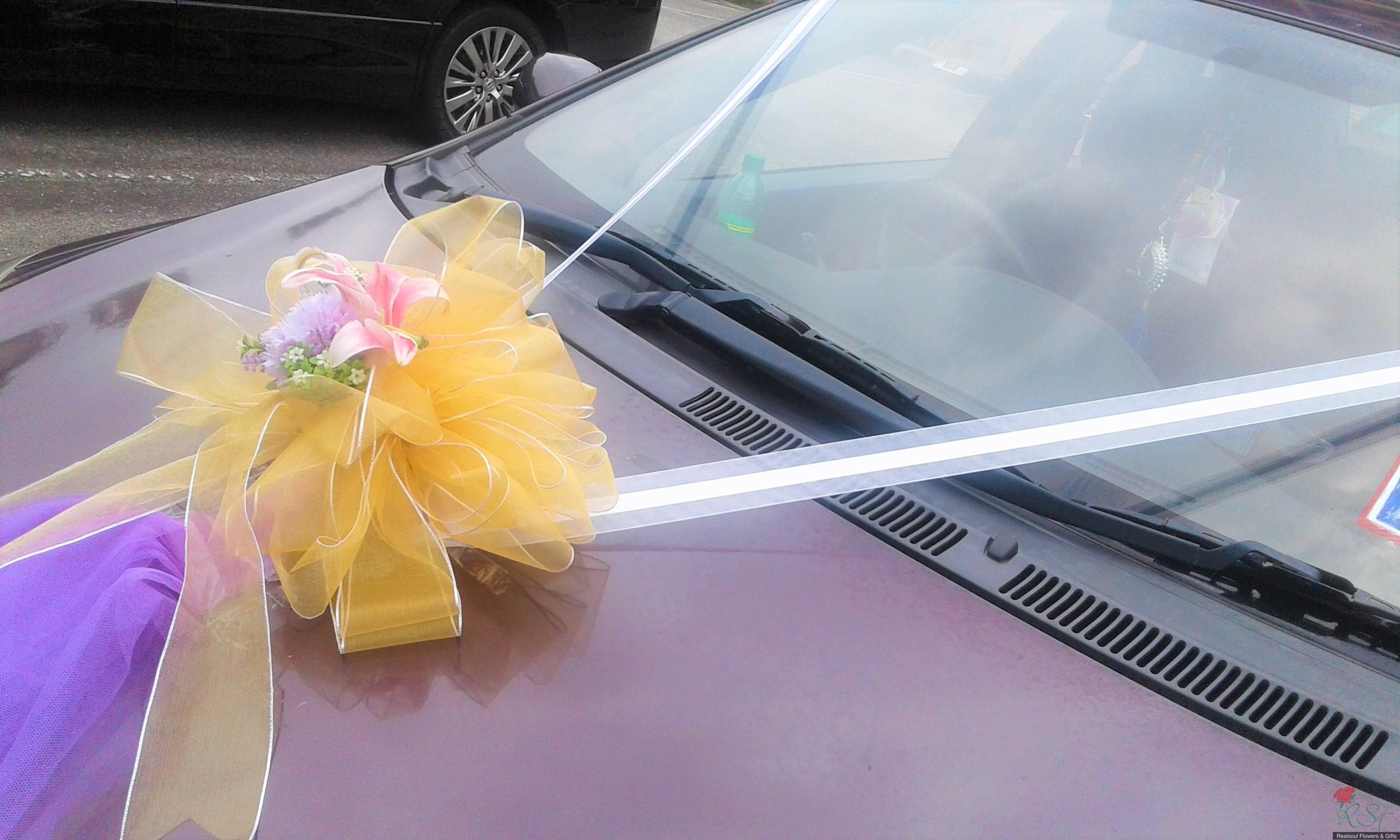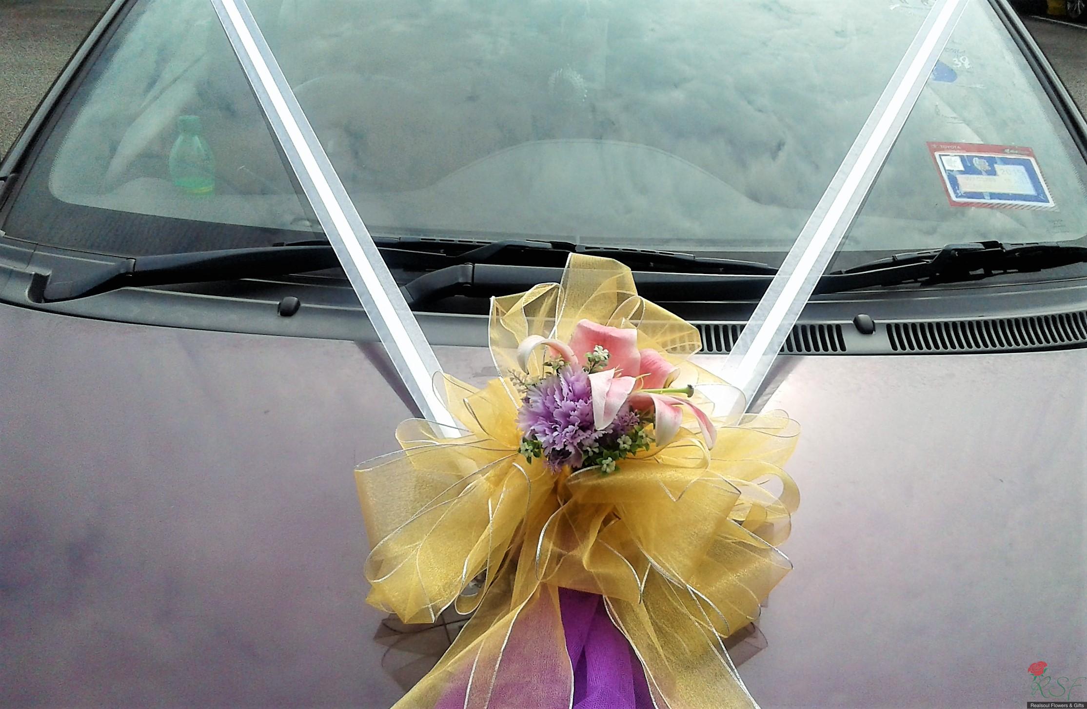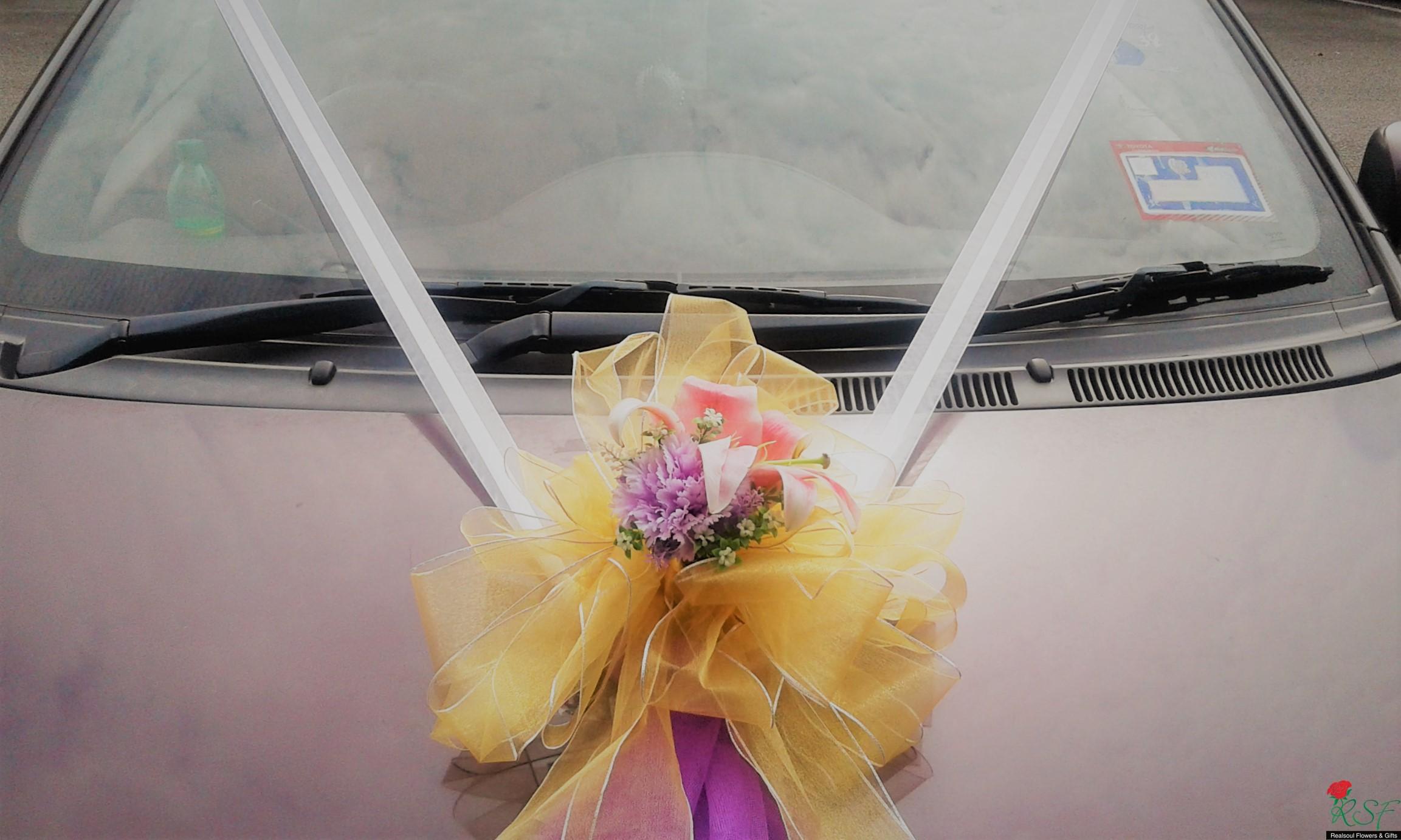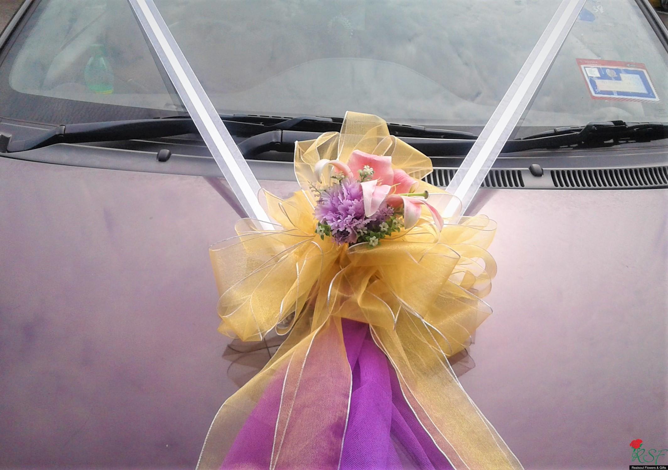 Weddings: Car decoration for bridal or any other functions' use. Here, we demonstrate samples of decoration for (1) front, (2) back and (3) side doors of the car. Client may opt for all three or either of the three options. In this design, we set price for full car decoration (1), (2), and (3) sedan type with four doors. MPVs and SUVs will have higher pricings. The flowers are mixed, artificial mostly but we will include fresh flowers upon request from the clients. In this demo, the front car decor has lily as the fresh flower, aside from artificial carnation. Silk like water resistant fabric ribbons and netting fabric are used in this design.