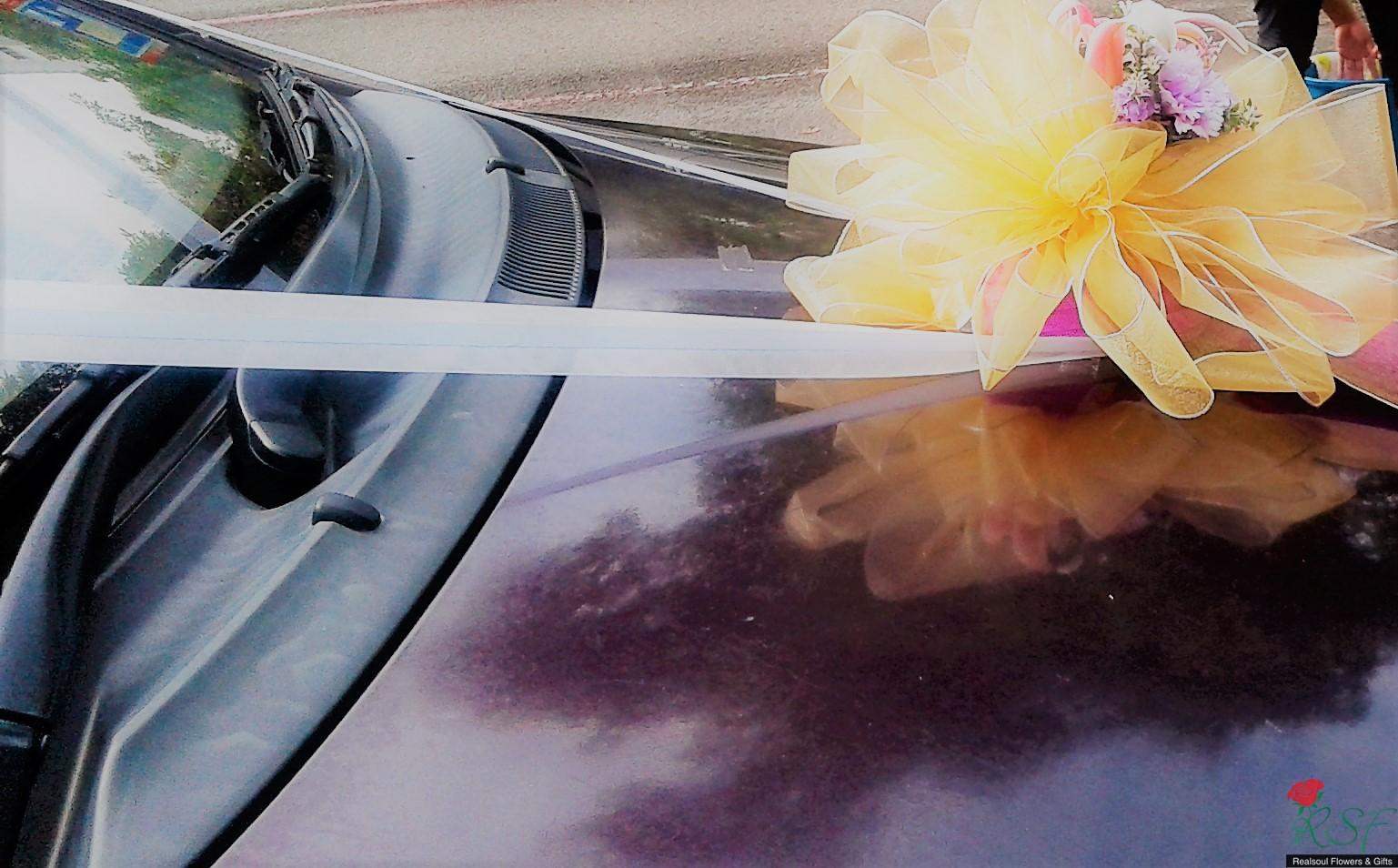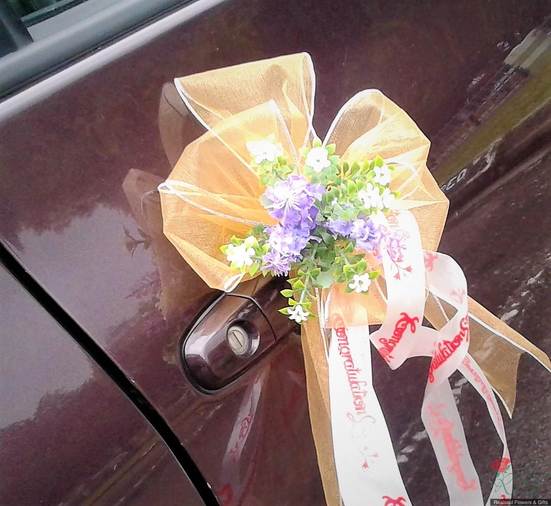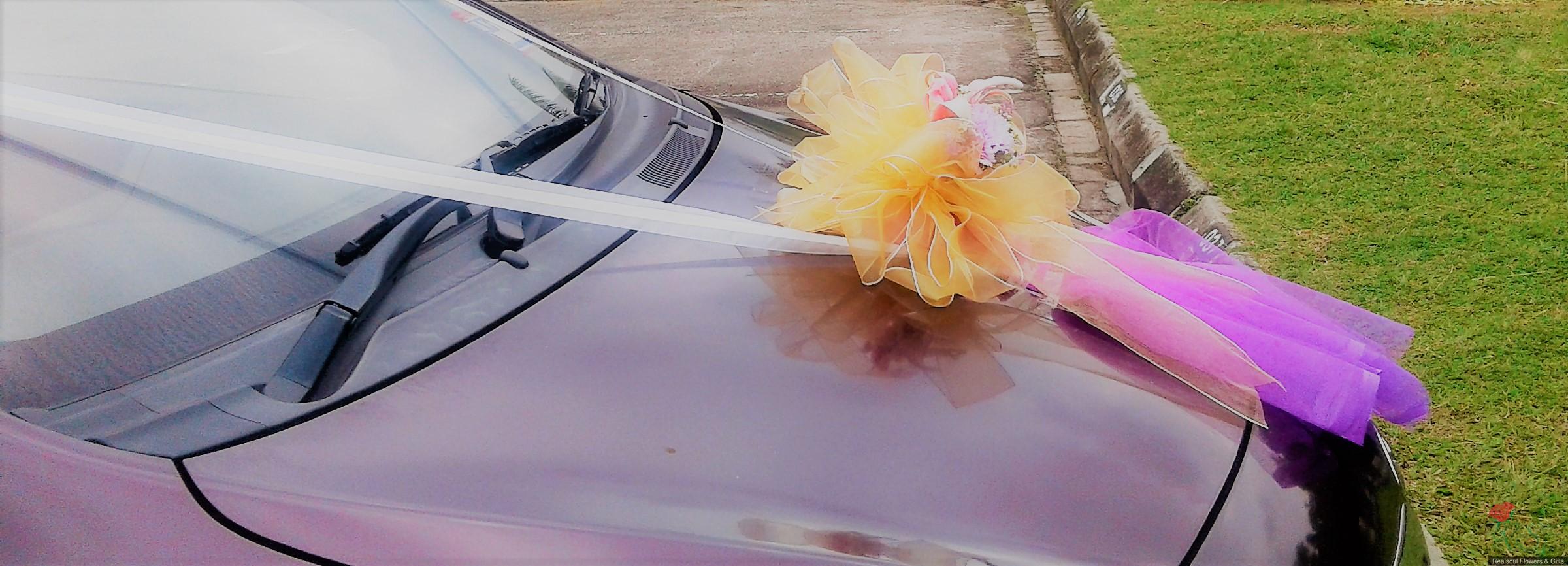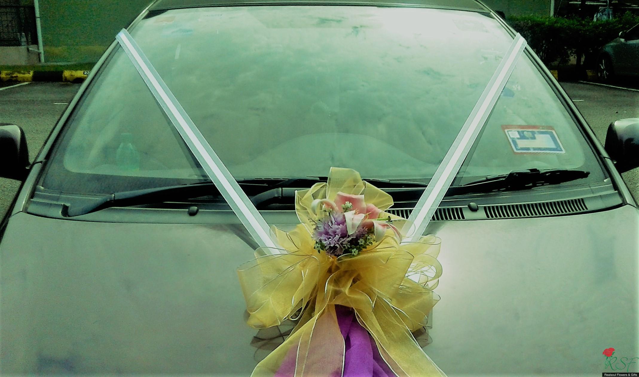Weddings: Car decoration for bridal or any other functions' use. Here, we demonstrate samples of decoration for (1) front, (2) back and (3) side doors of the car. Client may opt for all three or either of the three options. In this design, we set price for full car decoration (1), (2), and (3) sedan type with four doors. MPVs and SUVs will have higher pricings. The flowers are mixed, artificial mostly but we will include fresh flowers upon request from the clients. In this demo, the front car decor has lily as the fresh flower, aside from artificial carnation. Silk like water resistant fabric ribbons and netting fabric are used in this design.
