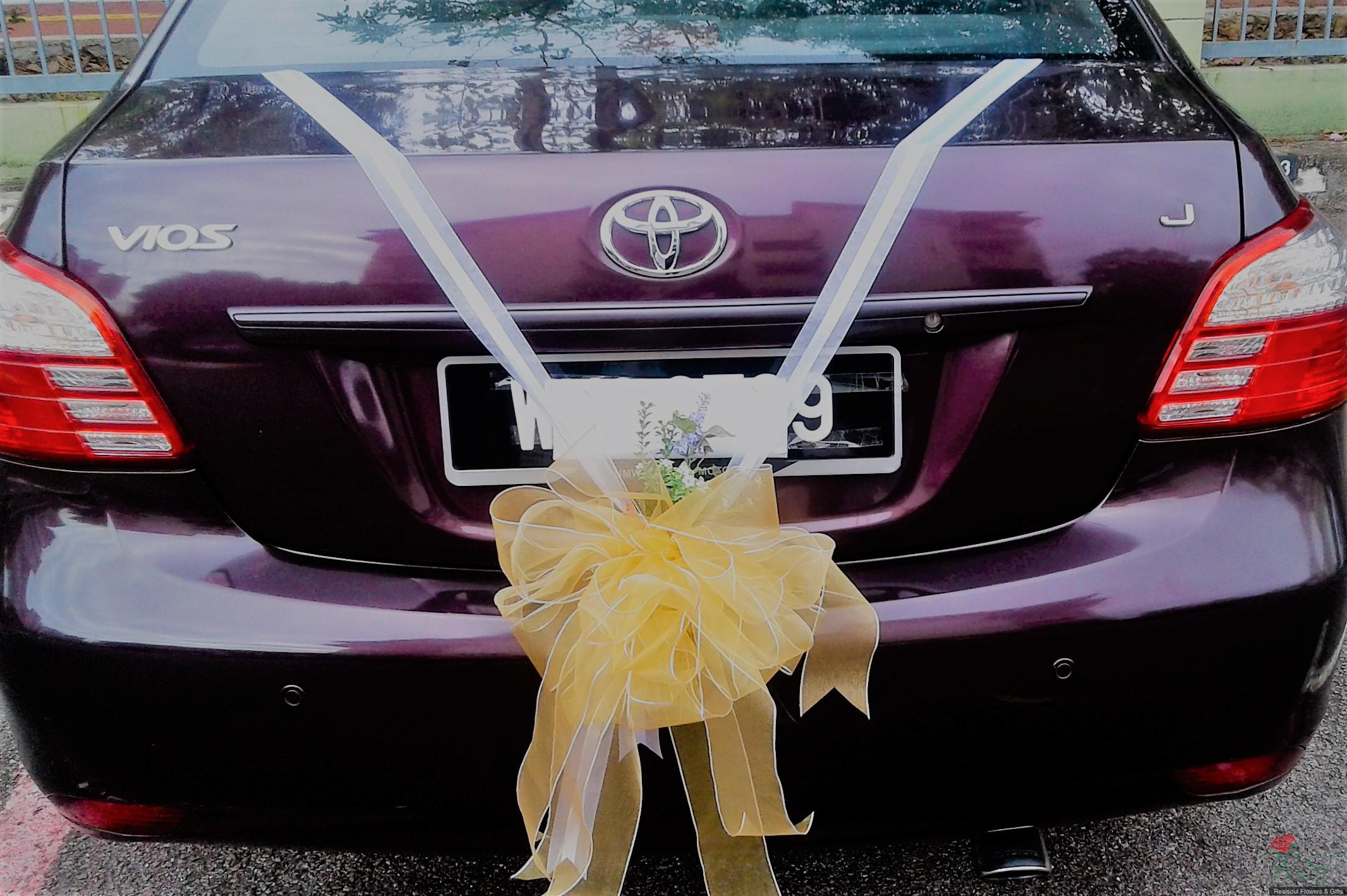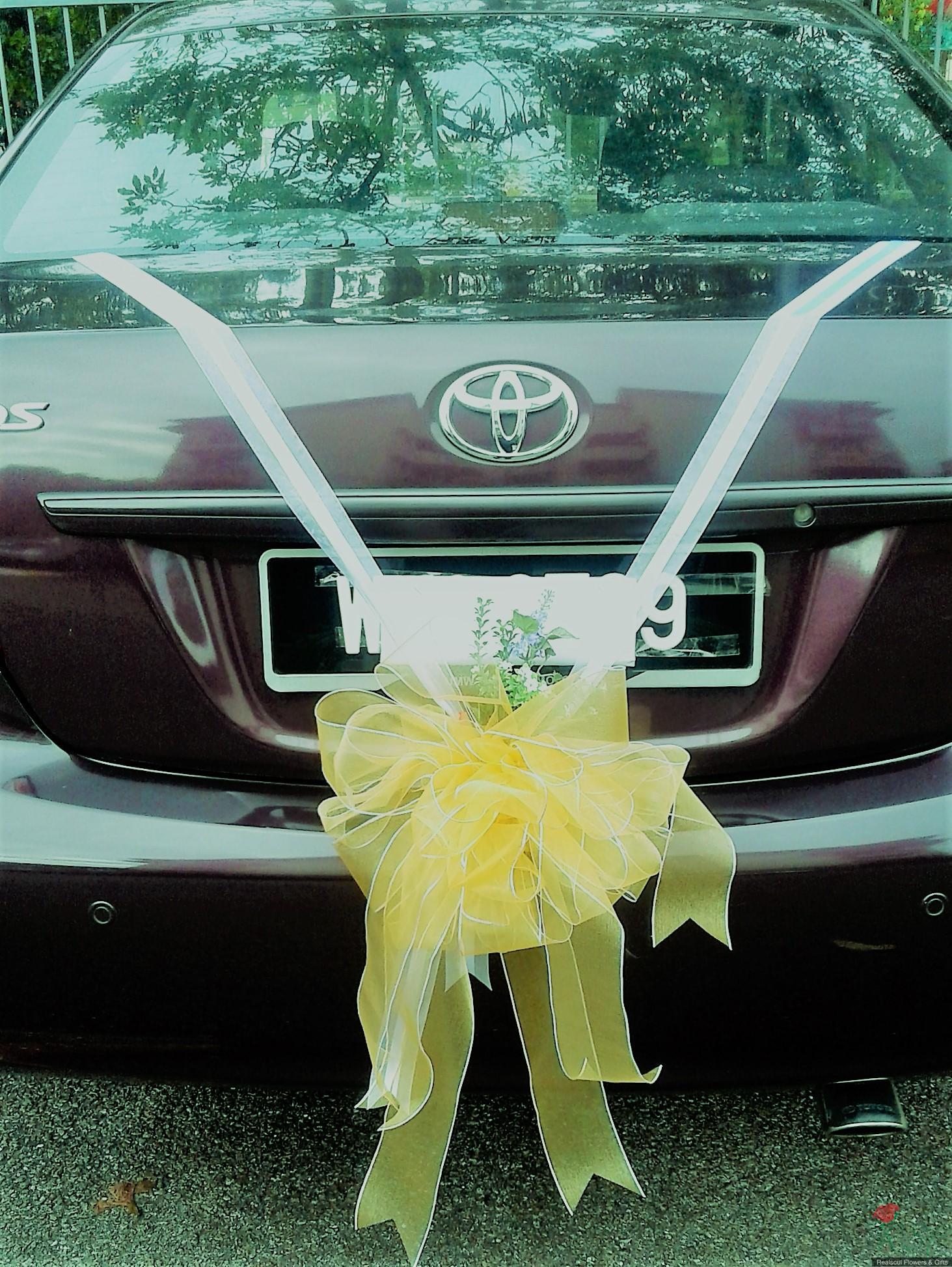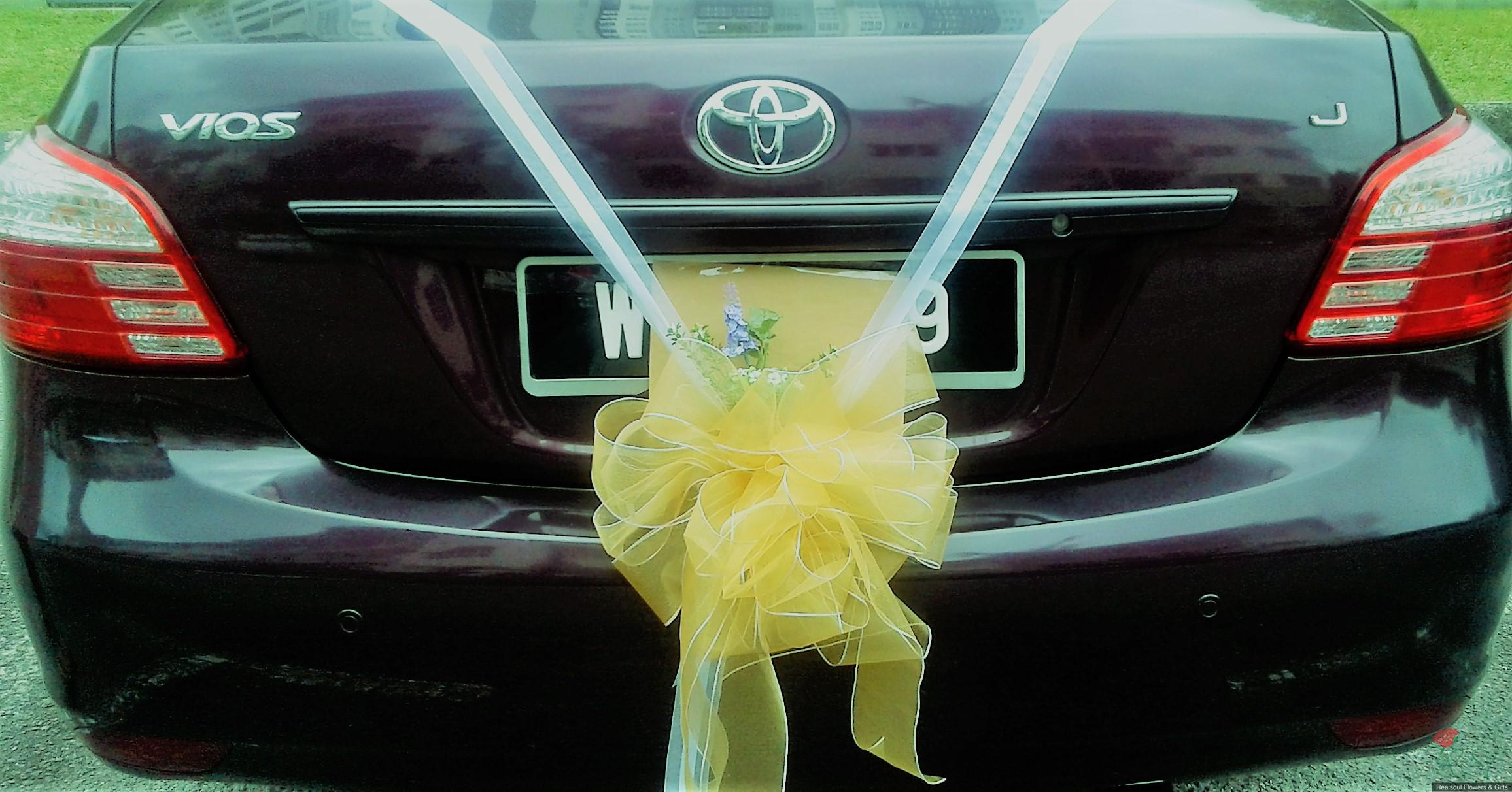 WDCD 095- Bridal wedding car decoration; front, back and four doors; note that netting fabric & ribbon used can be customised according to client's choice, eg. red more to Chinese etc./Dekorasi kereta perkahwinan/pengantin SHIP WORLDWIDE