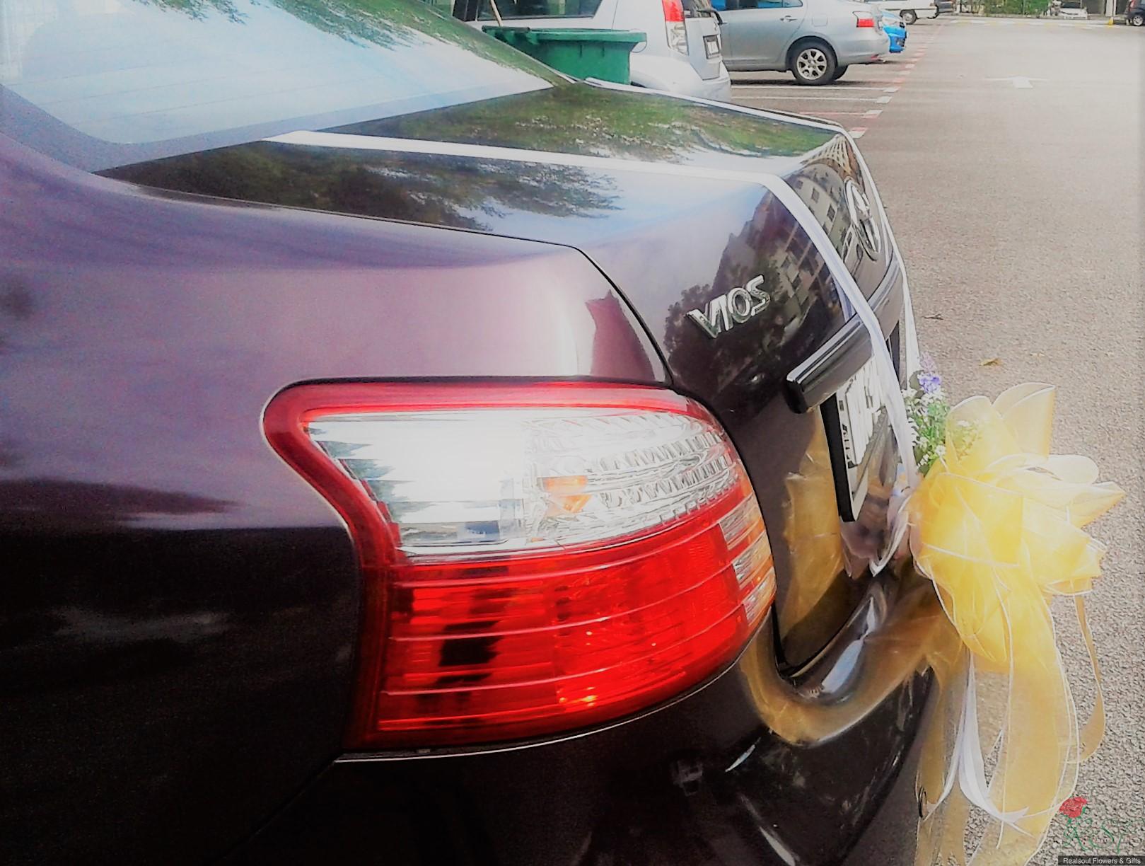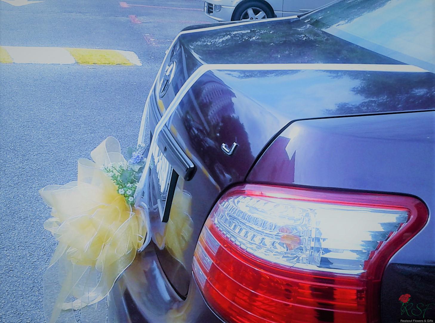 WDCD 095- Bridal wedding car decoration; front, back and four doors;note that netting fabric & ribbon used can be customised according to client's choice, eg. red more to Chinese etc./Dekorasi kereta perkahwinan/pengantin SHIP WORLDWIDE