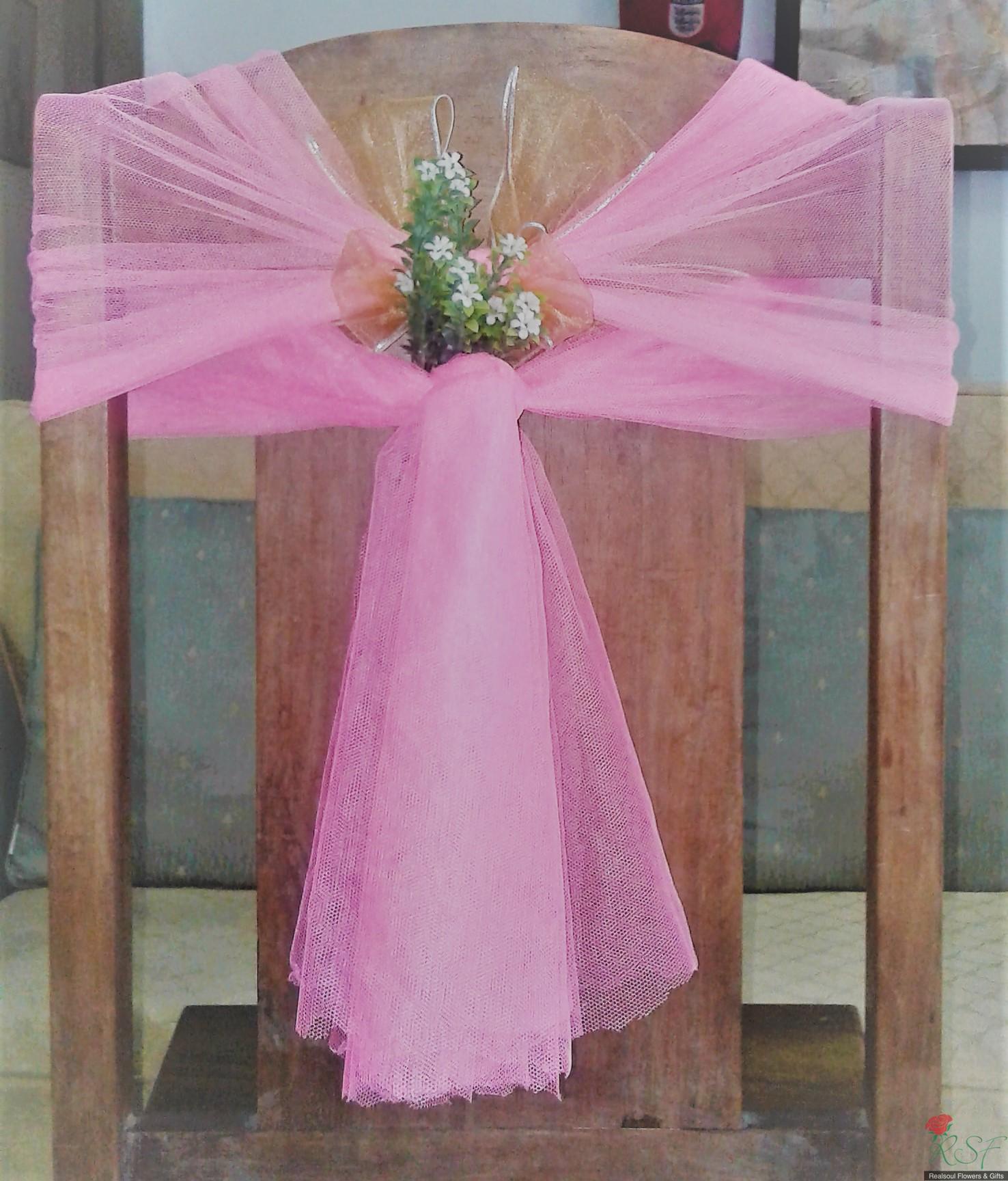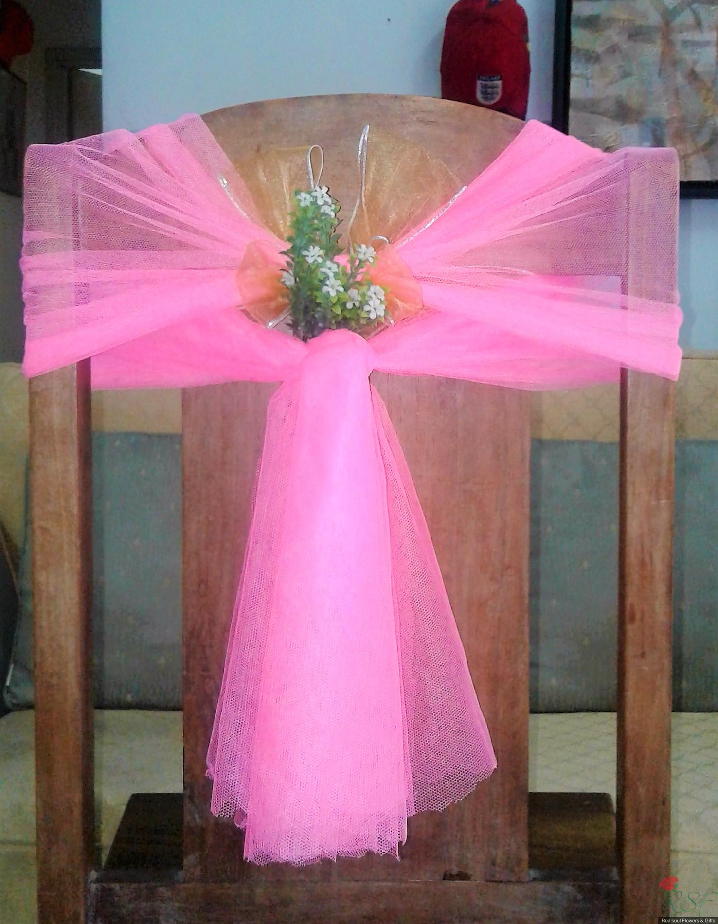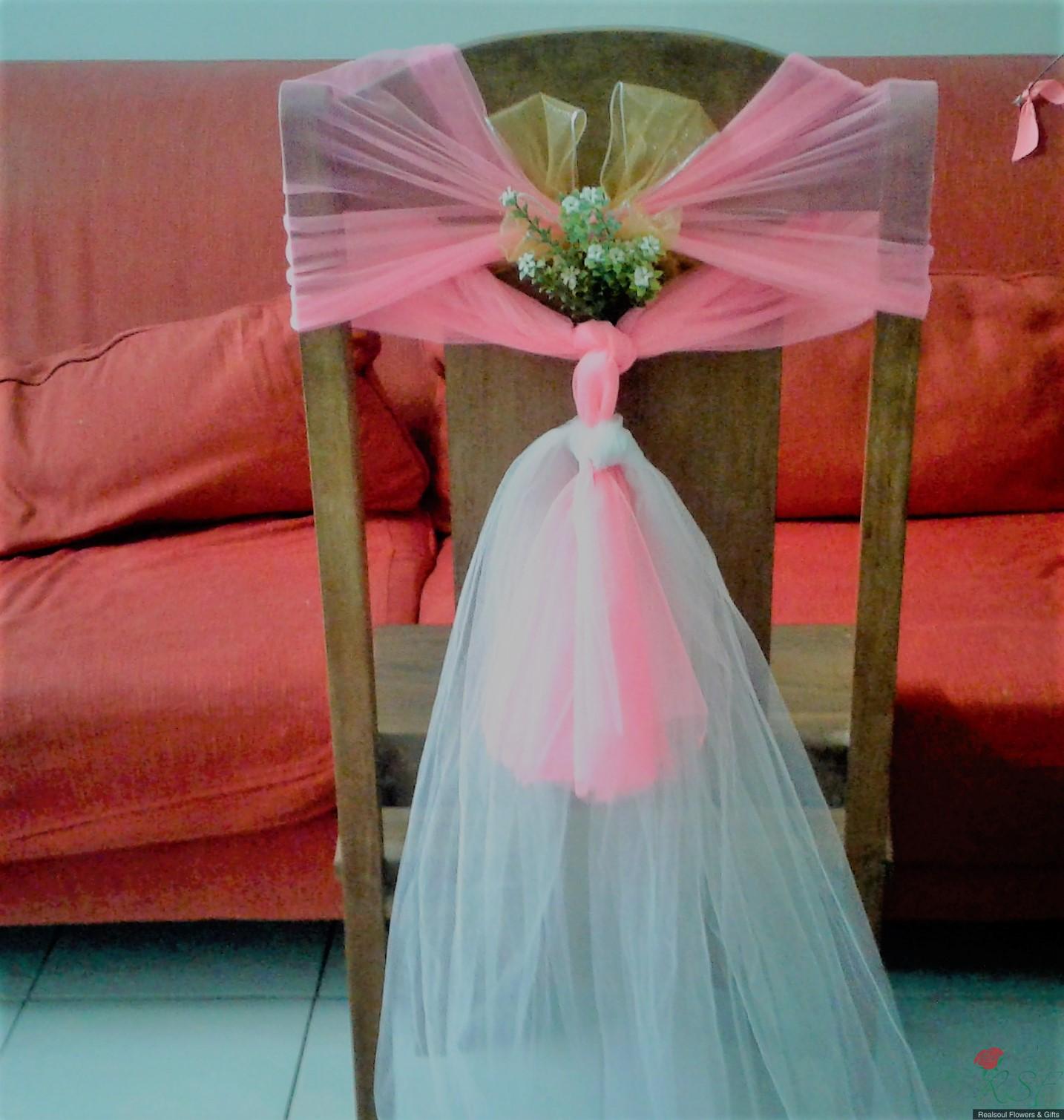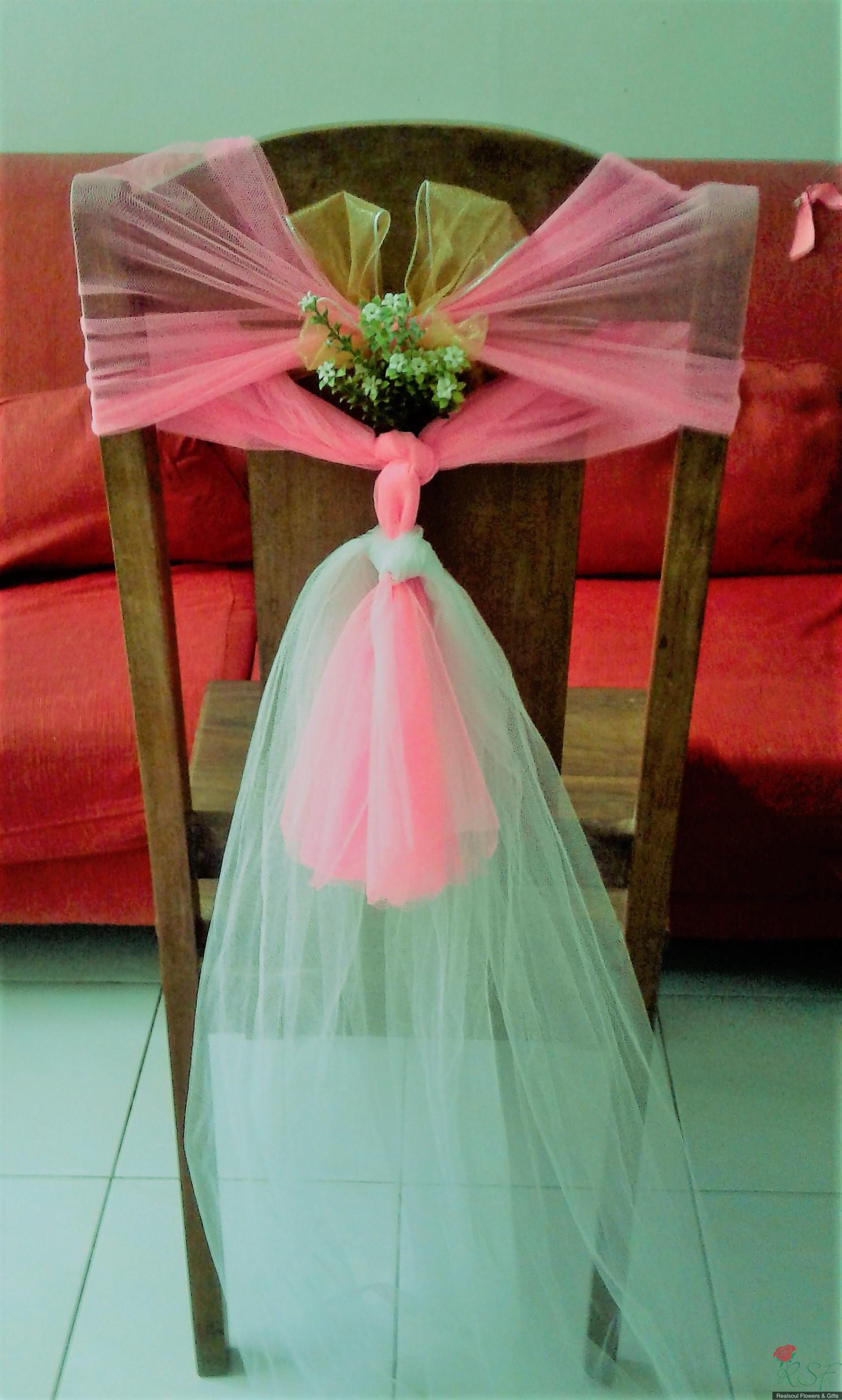 Our price quote for this design is for FIVE (5) chair backs set. Pink and white netting fabric is used here, decorated with artificial flowers and shiny ribbon; colour of netting fabric can be customised according to clients' requirement. A 15% discount will be considered for orders of 50 chairs and above. Minimum order 5 sets. One set is MYR47.00 inclusive of installation.