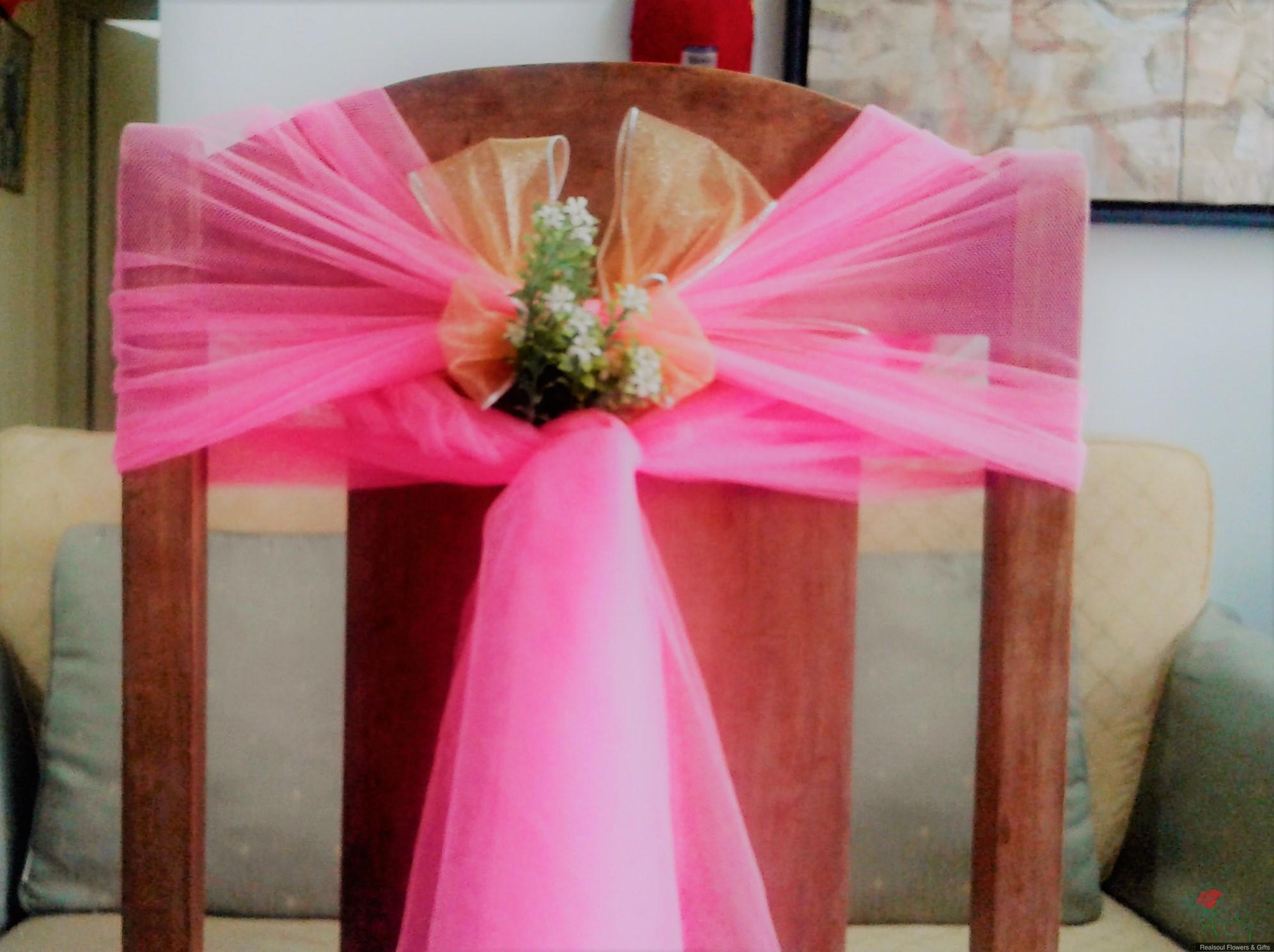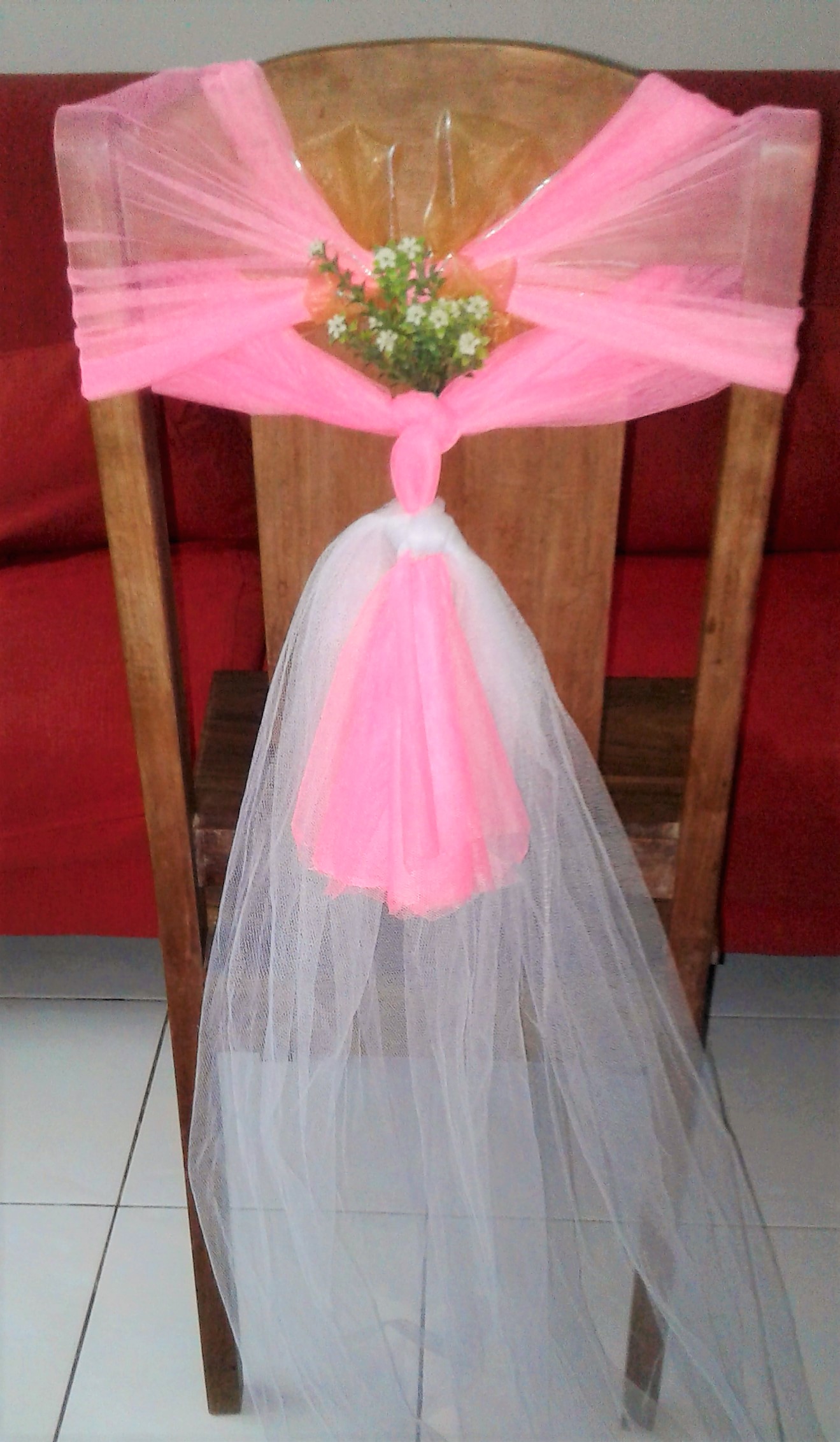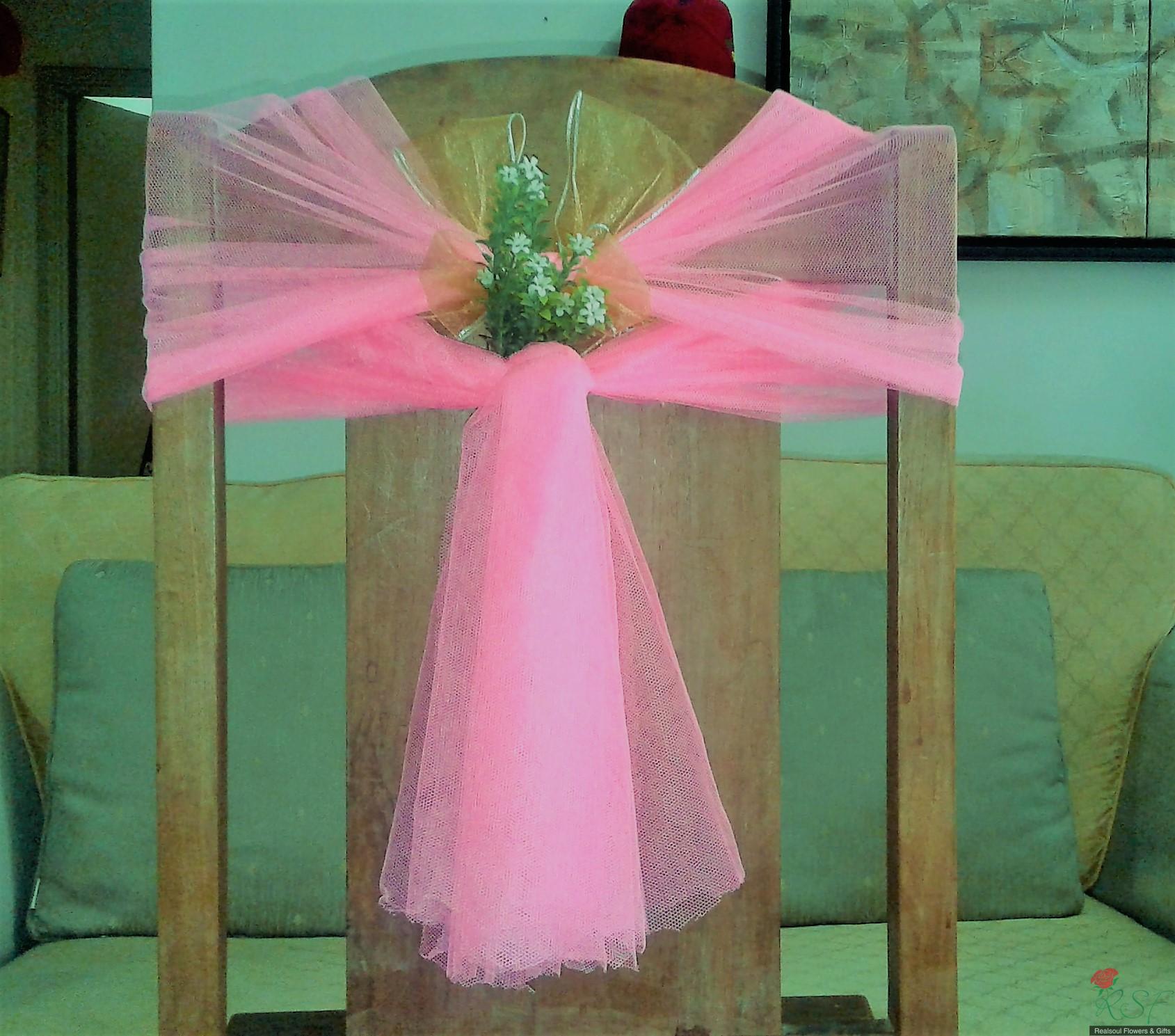 Our price quote for this design is for FIVE (5) chair backs set. Pink and white netting fabric is used here, decorated with artificial flowers and shiny ribbon; colour of netting fabric can be customised according to clients' requirement. A 15% discount will be considered for orders of 50 chairs and above. Minimum order 5 sets. One set is MYR47.00 inclusive of installation.