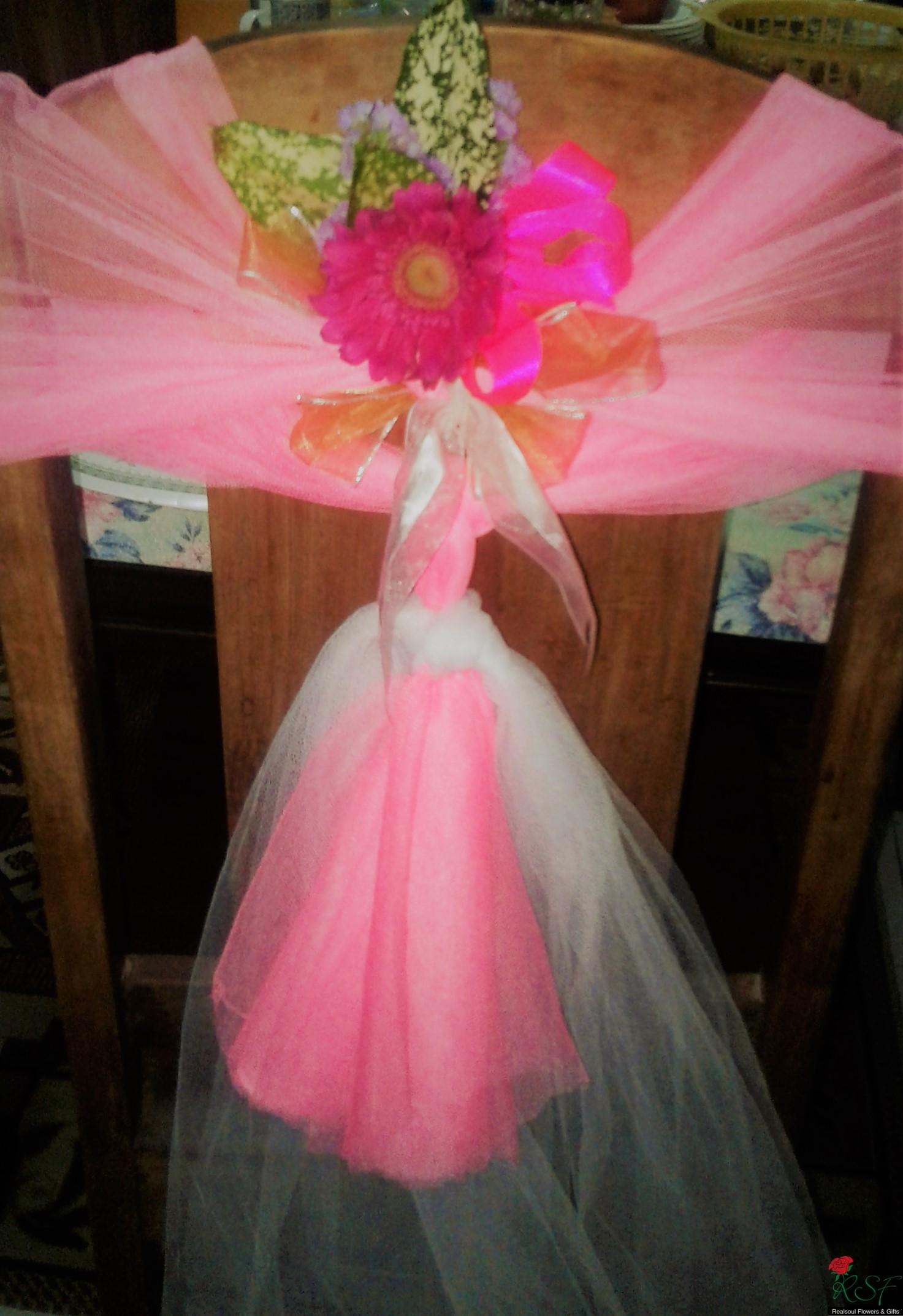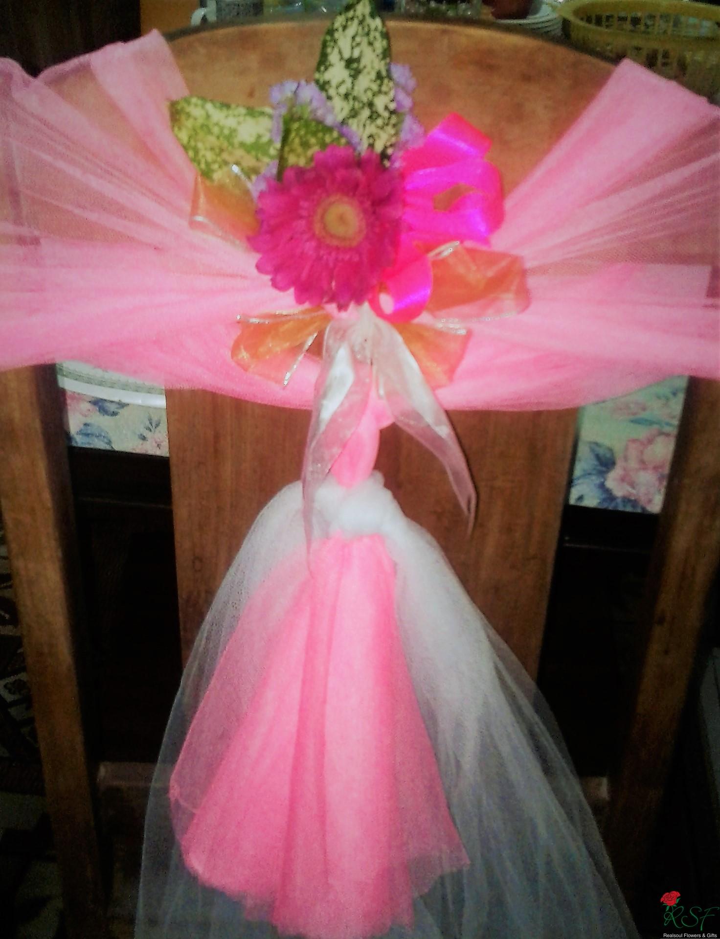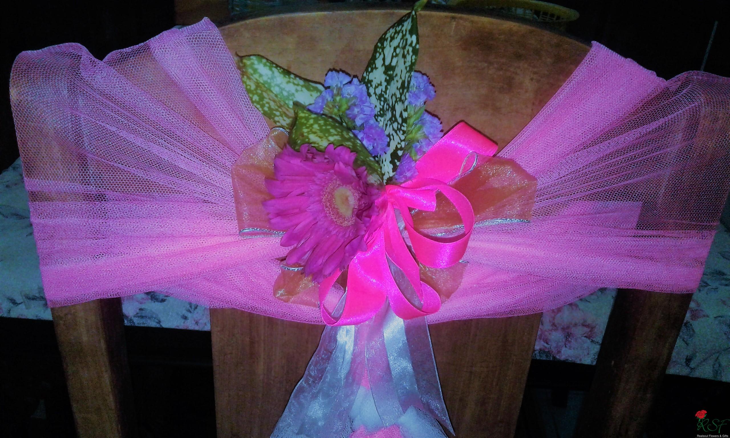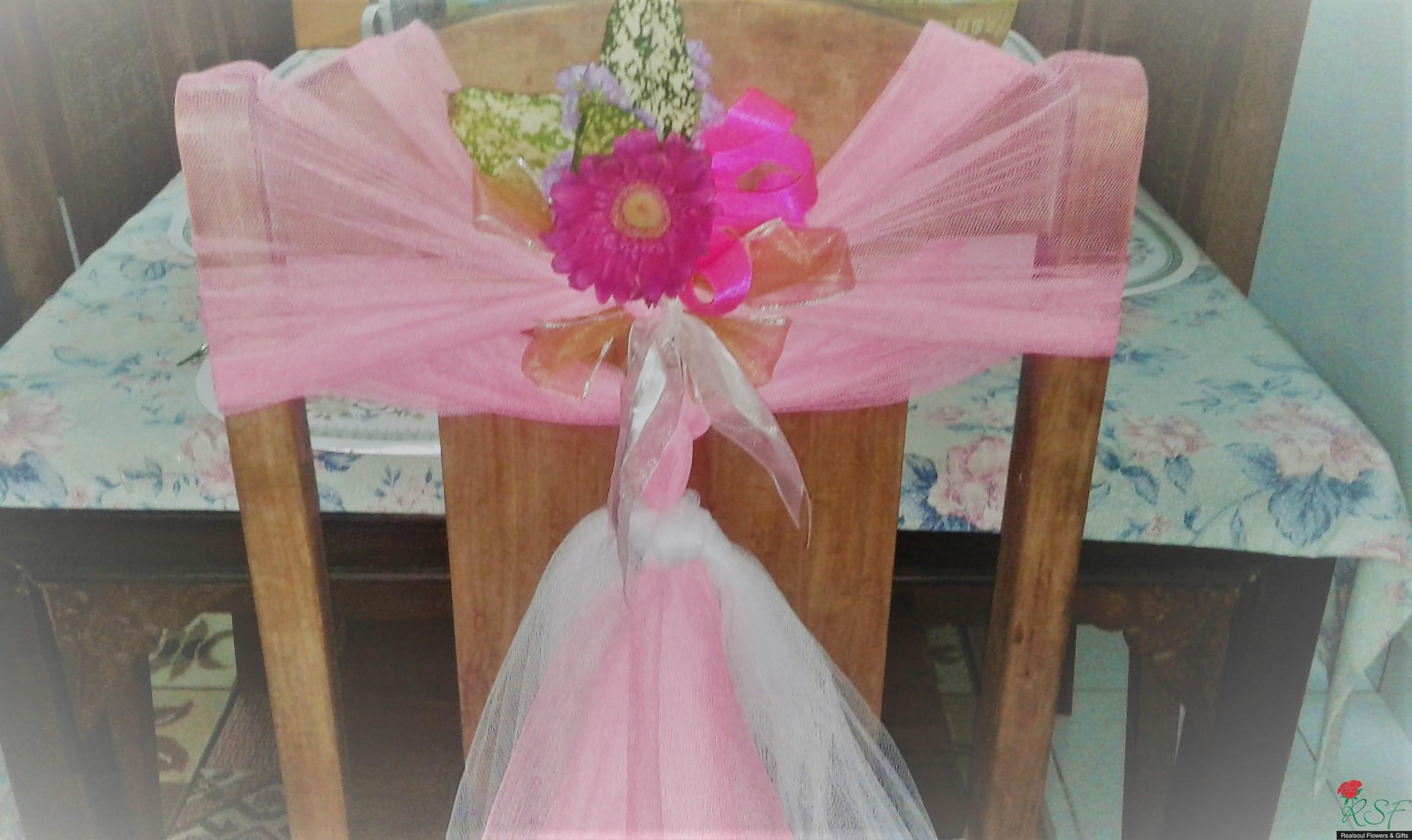 Our price quote for this design is for FIVE (5) chair backs set. Pink and white netting fabric is used here, decorated with artificial flowers and shiny ribbon; colour of netting fabric can be customised according to clients' requirement. A 15% discount will be considered for orders of 50 chairs and above. Minimum order 5 sets. One set is MYR47.00 inclusive of installation.